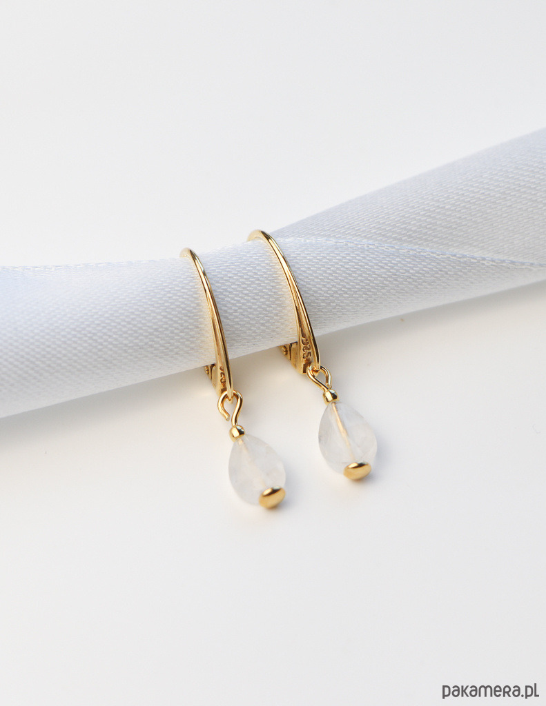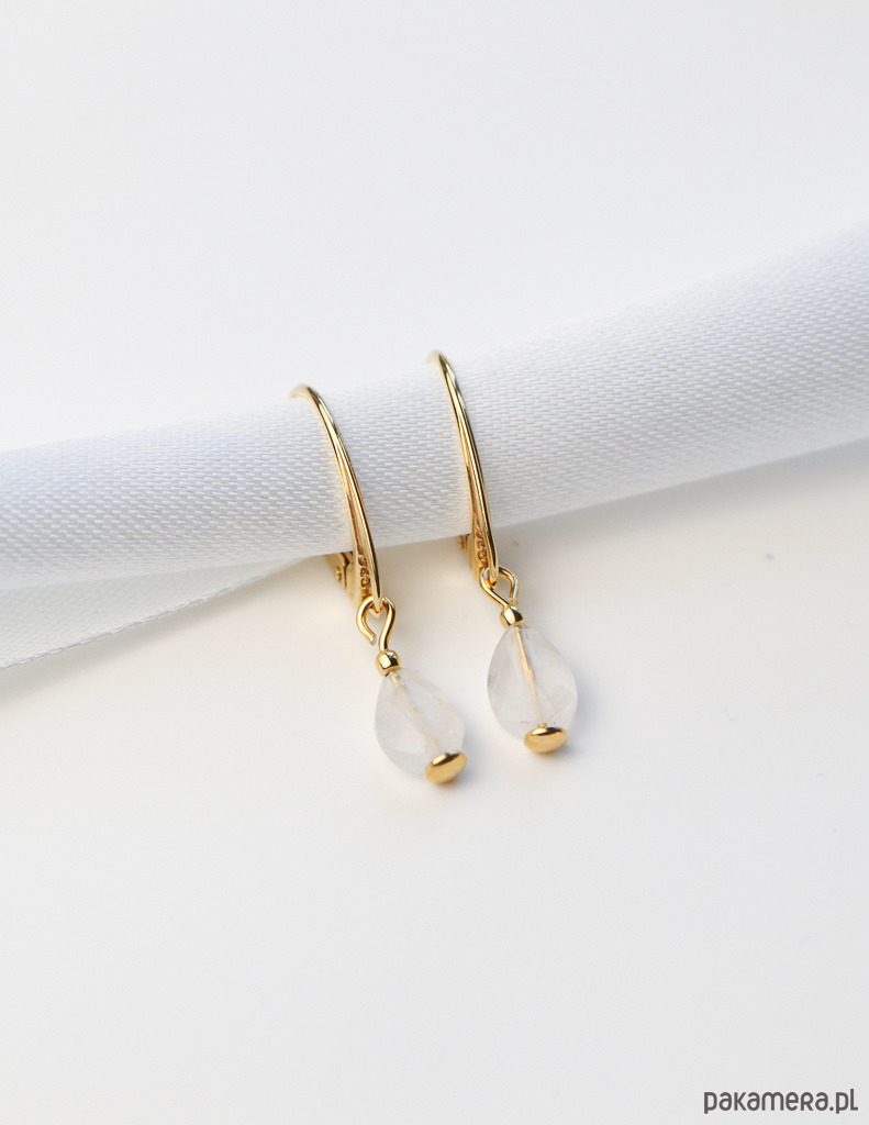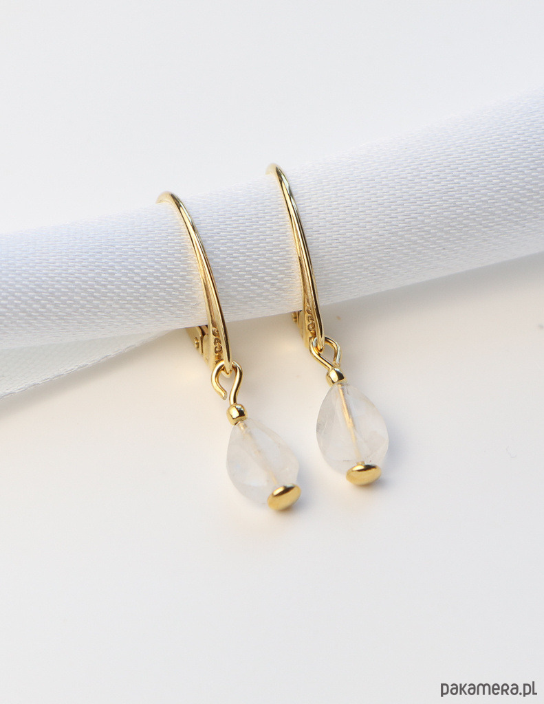 Kolczyki zostały wykonane ze srebra próby 925, pokrytego 24-karatowym złotem, co gwarantuje ich trwałość i piękny wygląd. Na pozłacanym, angielskim zapięciu zawieszono gładką łezkę kryształu górskiego (ok. 6 x 8 mm) w mleczno-białym odcieniu. Całości dopełniają drobne, złote kuleczki hematytu (ok. 2,5 mm), które dodają im eleganckiego akcentu.