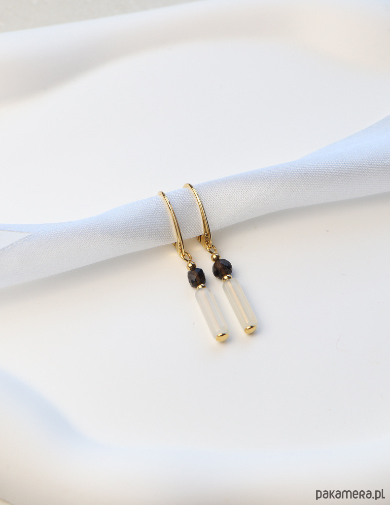 Kolczyki pozłacane - Kwarc Dymny, Biały Agat