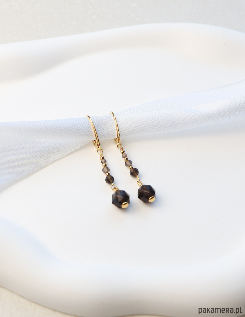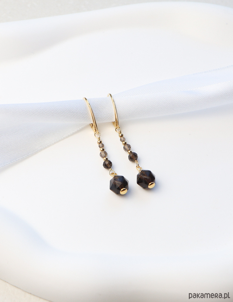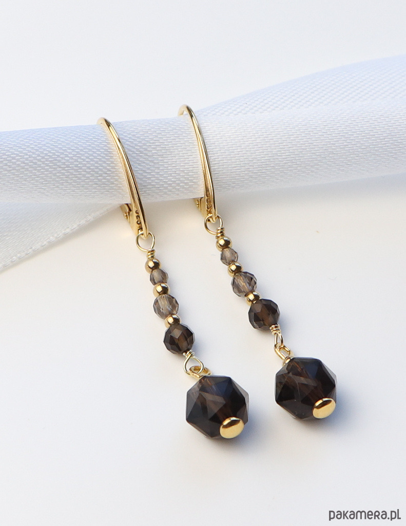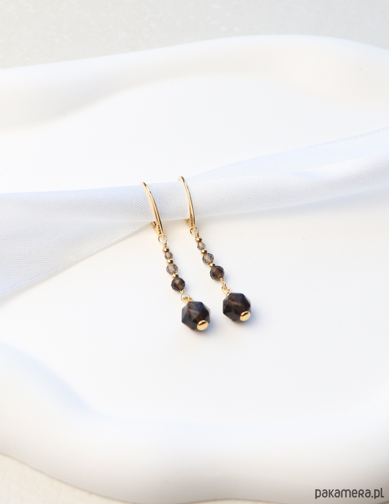 Kolczyki zostały wykonane ze srebra próby 925, pokrytego 24-karatowym złotem, co gwarantuje ich trwałość i piękny wygląd. Na pozłacanym, angielskim zapięciu zawieszono gradientową kompozycję fasetowanych kulek kwarcu dymnego (o wielkości od 2 mm do 8 mm). Całości dopełniają drobne, złote kuleczki hematytu (ok. 2,5 mm), które dodają im eleganckiego akcentu.