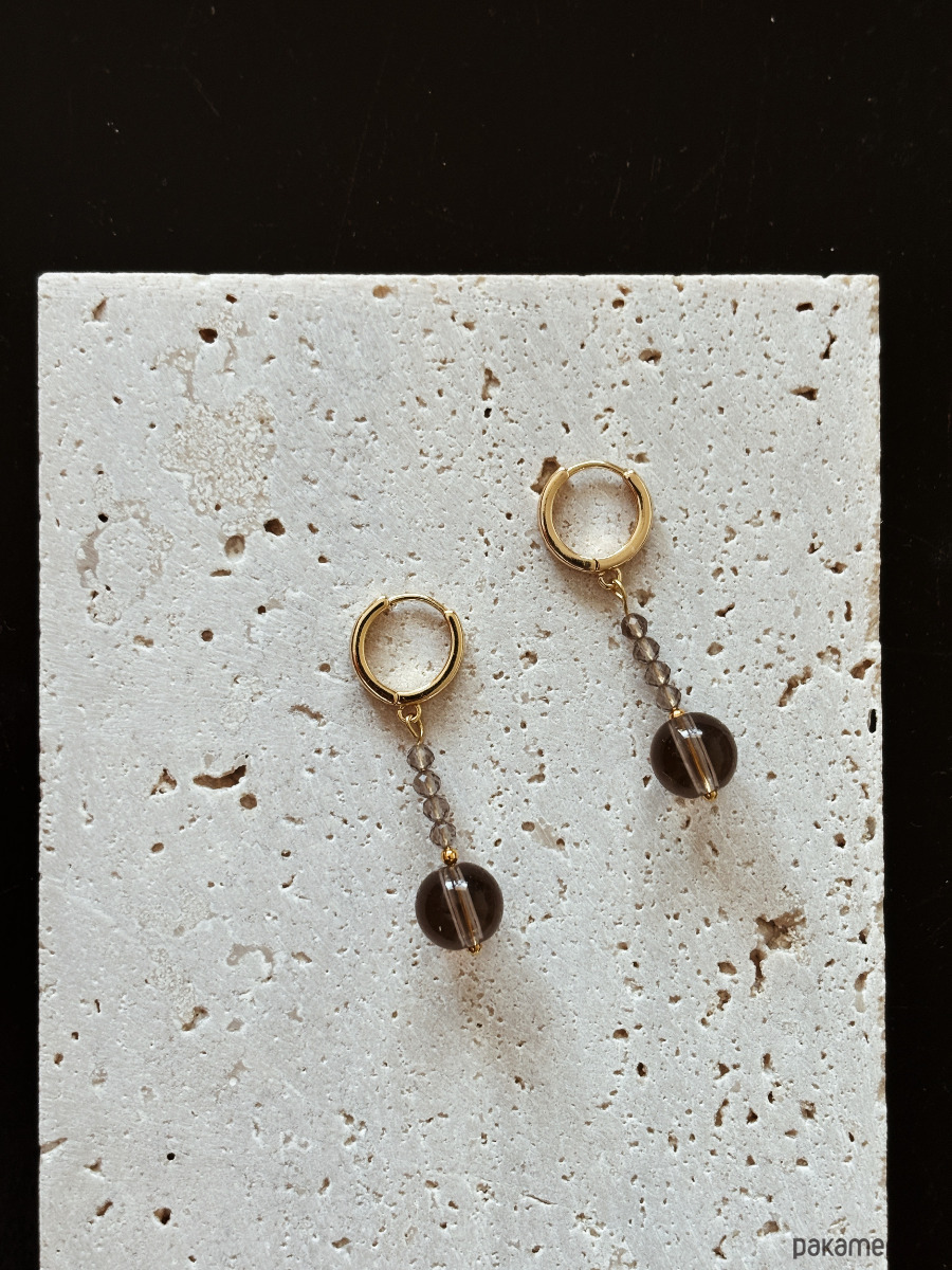 Kolczyki wykonane są z drucie jubilerskim z kwarcu dymnego oraz zapięcia z mosiądzu rodowanego złotem.