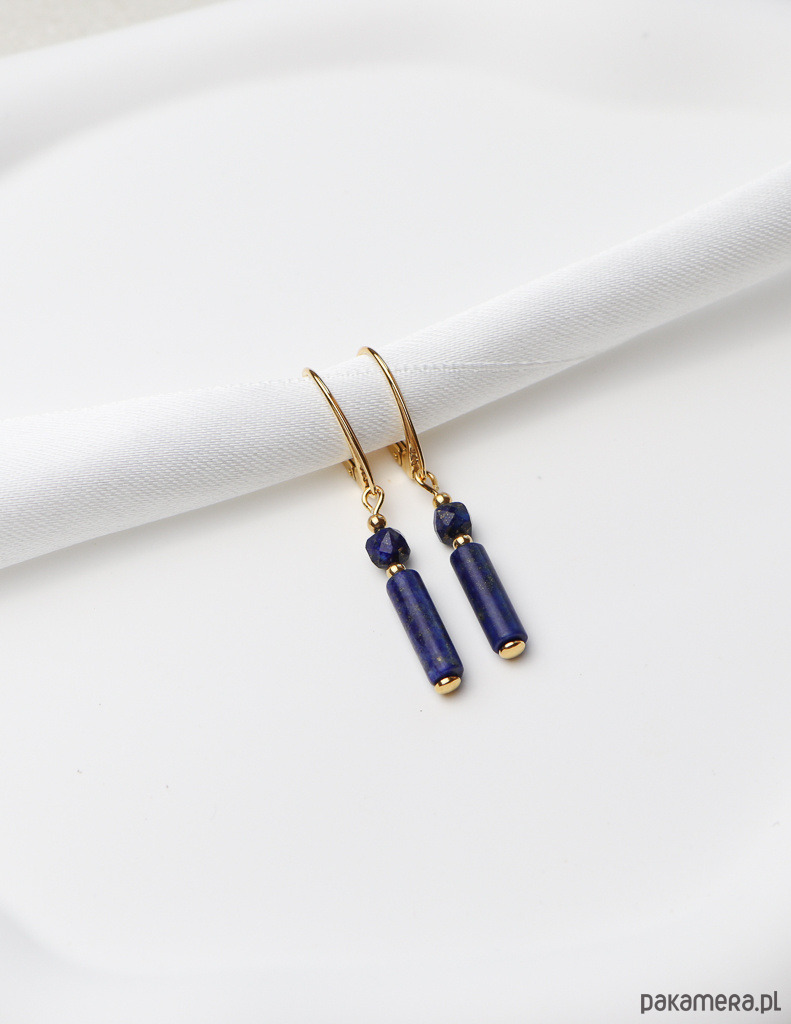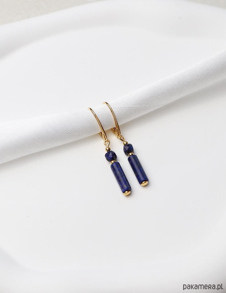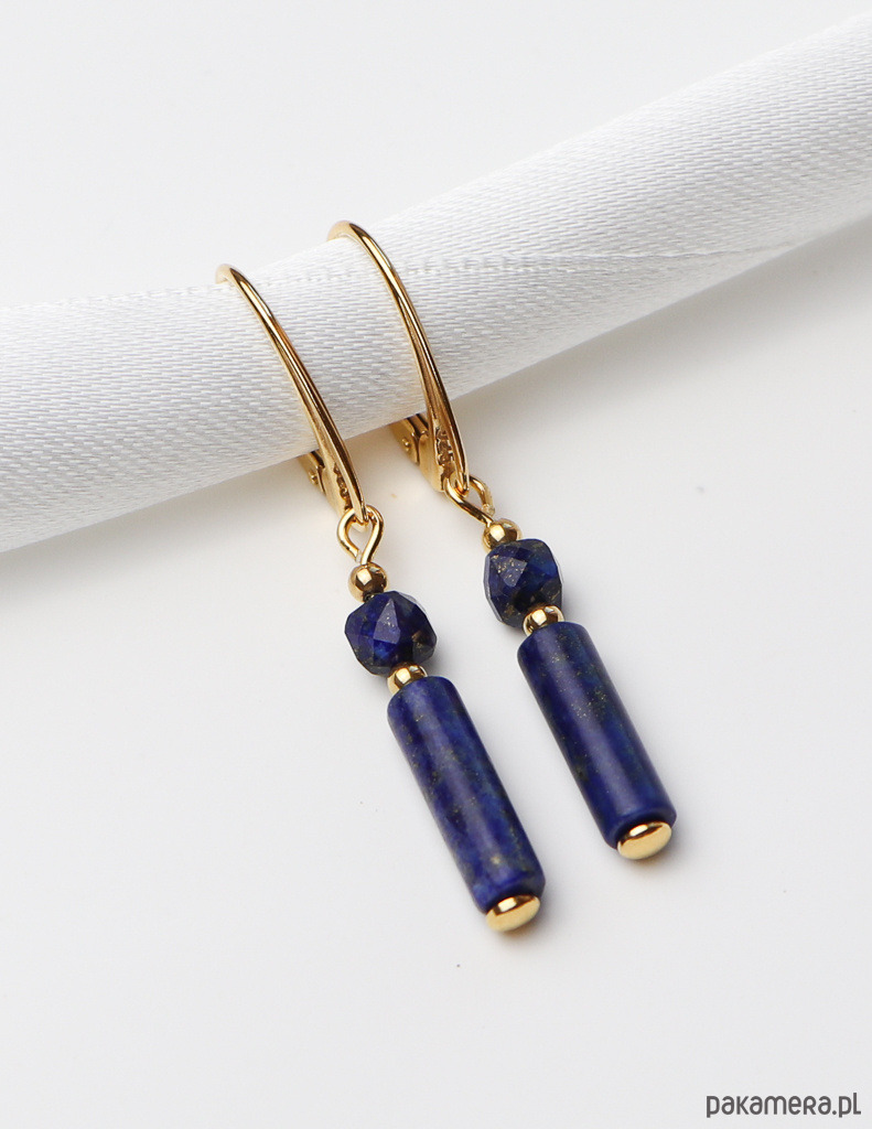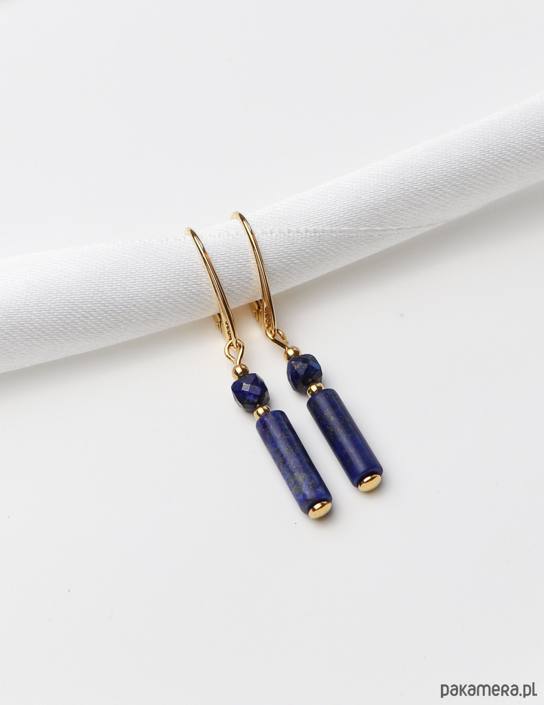 Kolczyki zostały wykonane ze srebra próby 925, pokrytego 24-karatowym złotem, co gwarantuje ich trwałość i piękny wygląd. Na pozłacanym, angielskim zapięciu zawieszono kompozycję z gładkiej belki lapis lazuli (ok. 4 x 13 mm) oraz fasetowanej kulki lapis lazuli (ok. 4 mm). Całości dopełniają drobne, złote kuleczki hematytu (ok. 2,5 mm), które dodają im subtelnej elegancji.