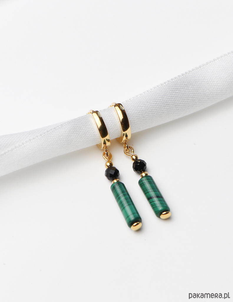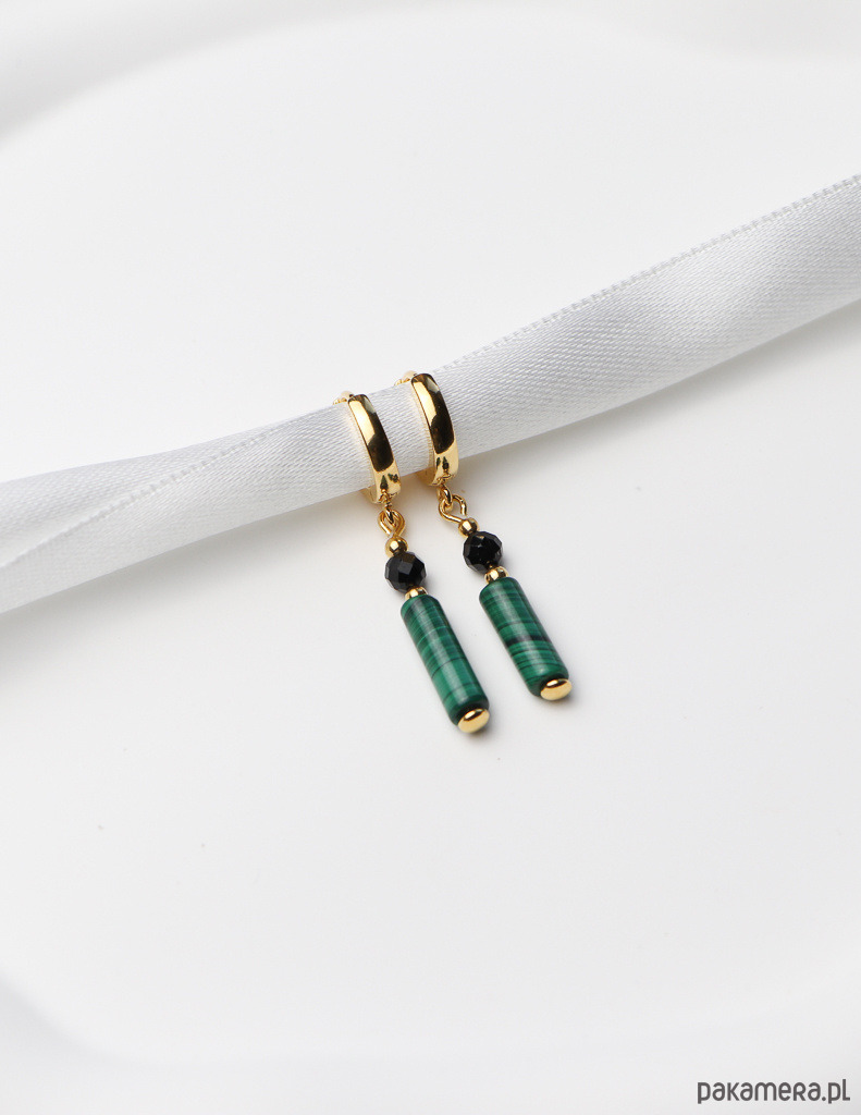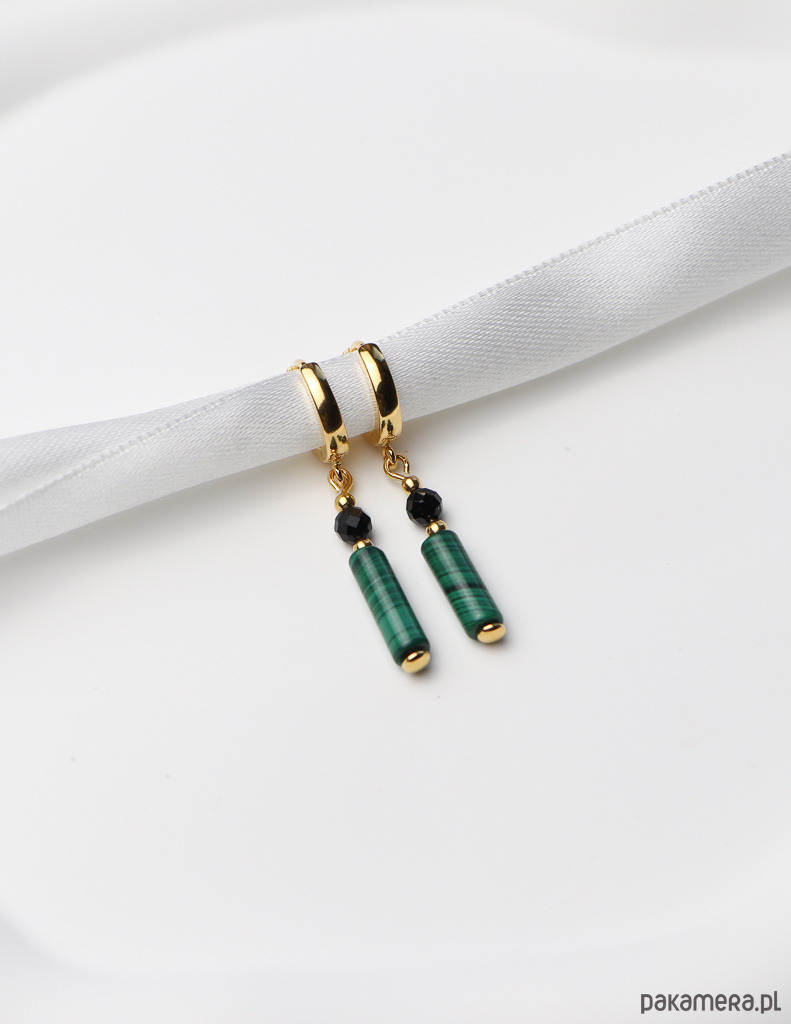 Kolczyki zostały wykonane ze srebra próby 925, pokrytego 24-karatowym złotem, co gwarantuje ich trwałość i piękny wygląd. Na pozłacanym, nowoczesnym zapięciu kajdanki zawieszono kompozycję z gładkiej belki malachitu (ok. 4 x 13 mm) w charakterystyczne zielone wzory oraz fasetowanej kulki czarnego turmalinu (ok. 4 mm). Całości dopełniają drobne, złote kuleczki hematytu (ok. 2,5 mm), które dodają im subtelnej elegancji.