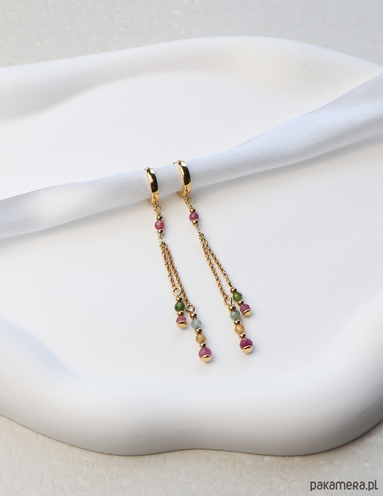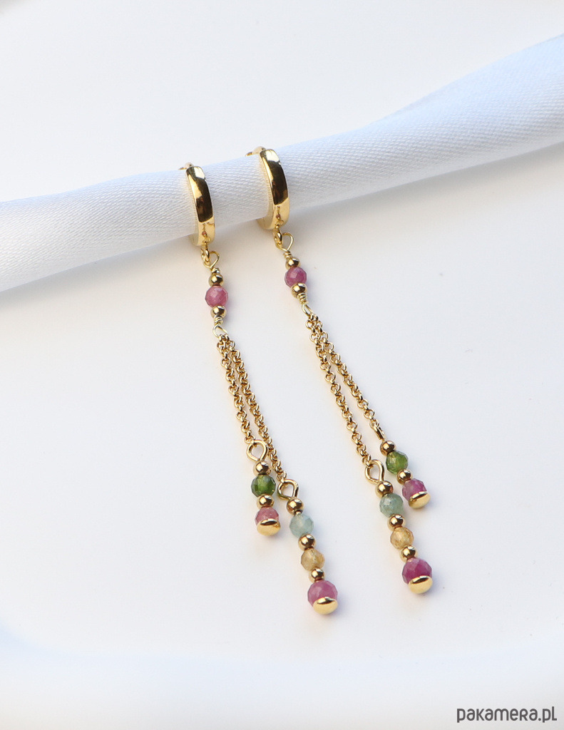 Kolczyki zostały wykonane ze srebra próby 925, pokrytego 24-karatowym złotem, co gwarantuje ich trwałość i piękny wygląd. Na pozłacanym, angielskim zapięciu zawieszono dwa wiszące łańcuszki z kamieniami, jeden krótszy i jeden dłuższy. Oba łańcuszki zdobią fasetowane kulki mixu turmalinów (ok. 3 mm) w pięknych, wielobarwnych odcieniach. Całości dopełniają drobne, złote kuleczki hematytu (ok. 2,5 mm), które dodają im subtelnej elegancji i podkreślają blask kamieni.
