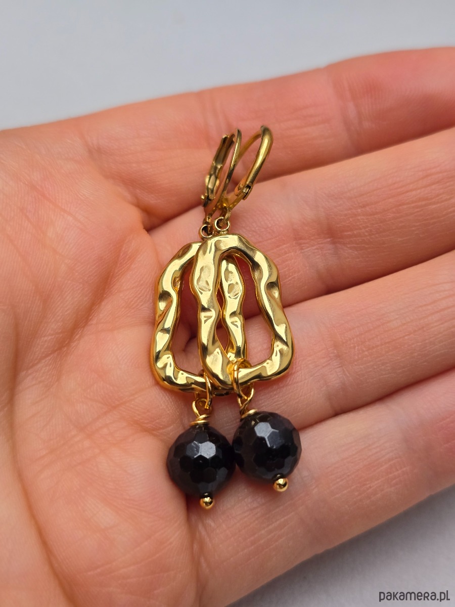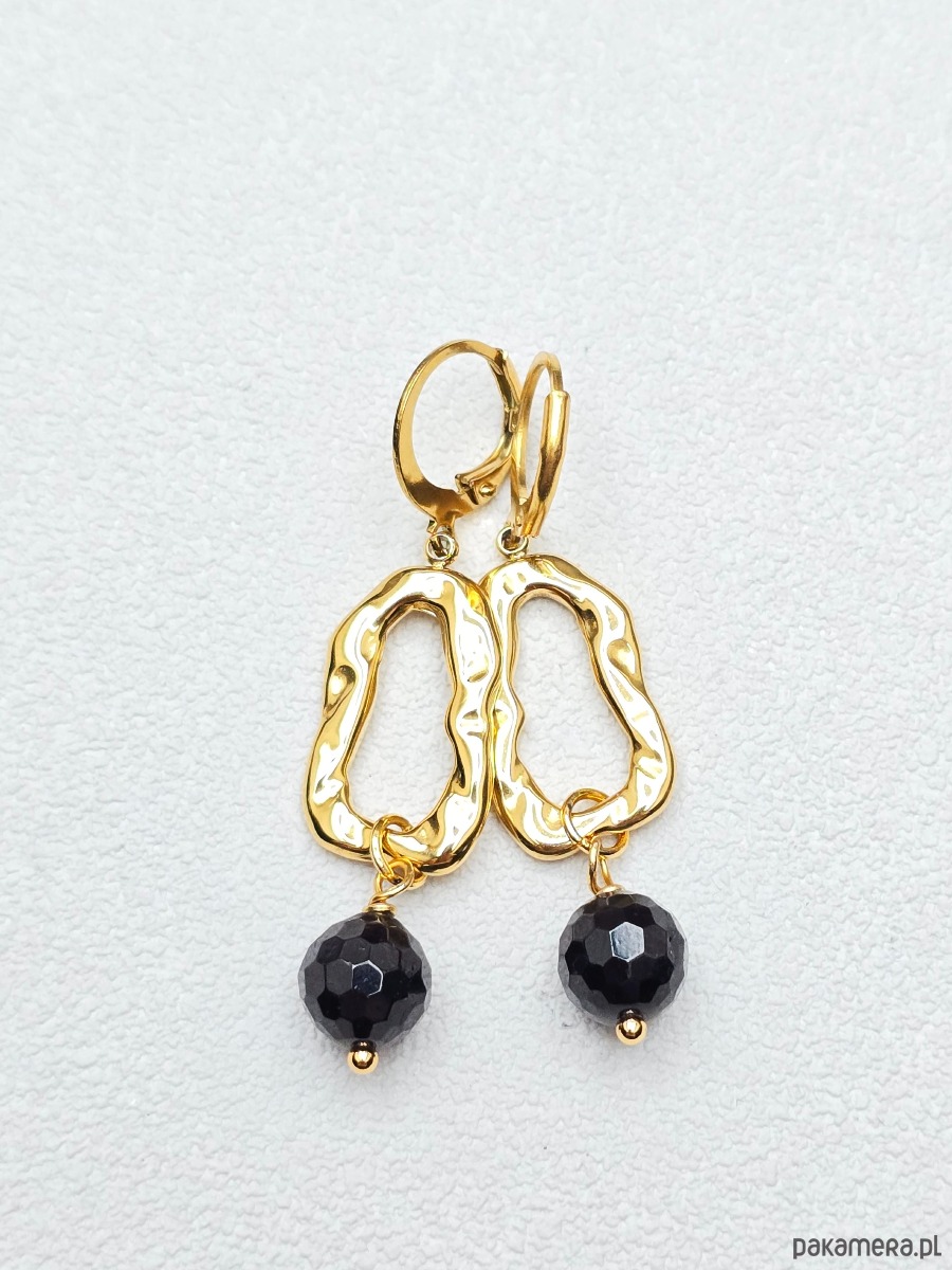 Wyjątkowe kolczyki z młotkowanych owali i podwieszonych, fasetowanych kulek granatów ( 8mm)
