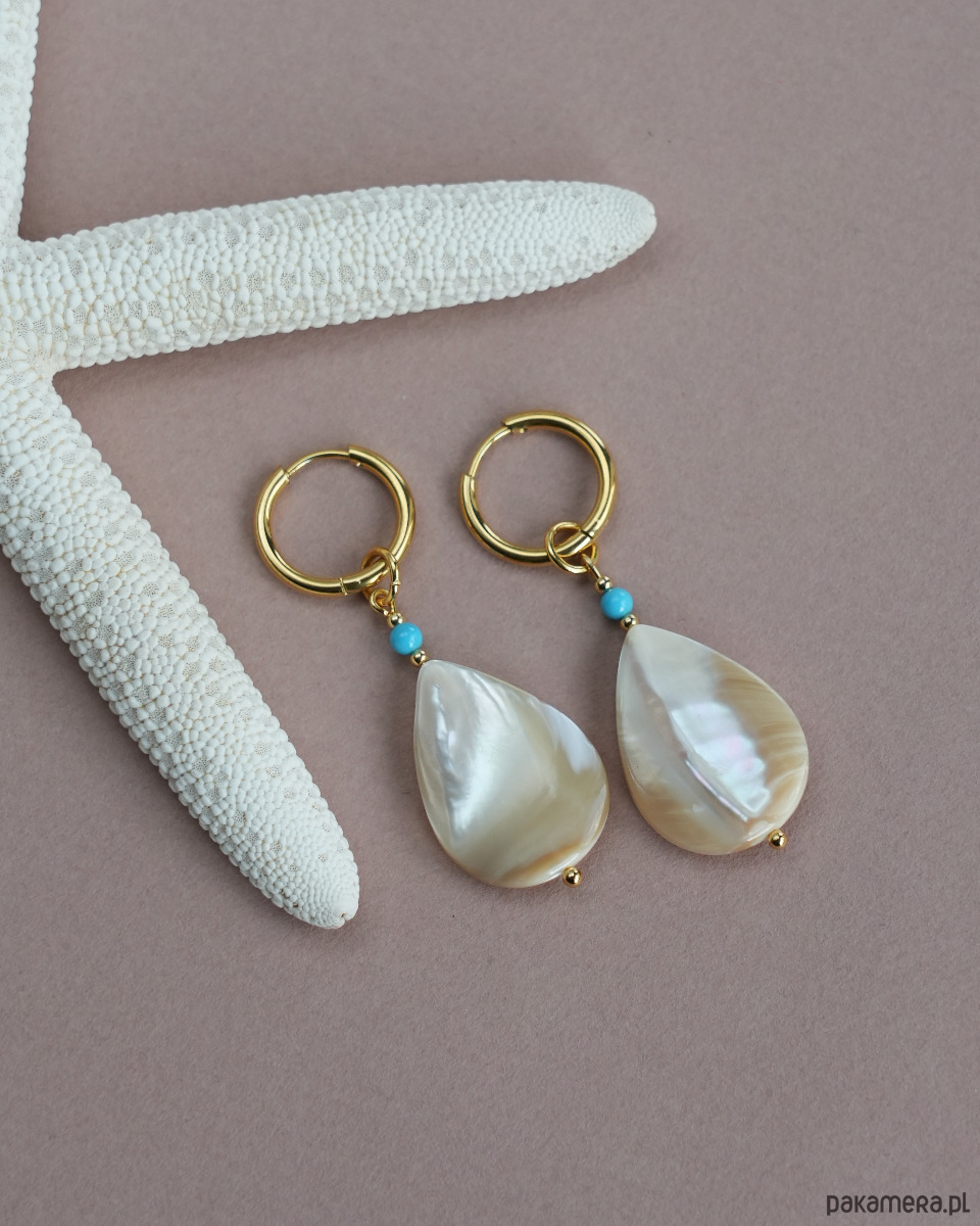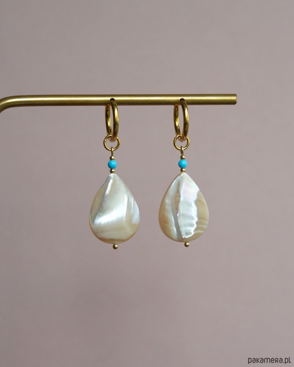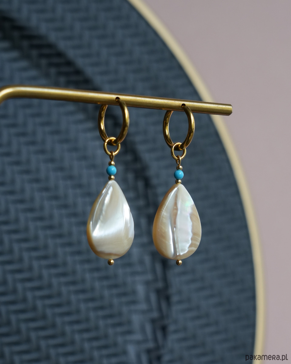Materiały: zawieszka w kształcie łzy z masy perłowej, niebieski koralik z howlitu. Wszystkie złote elementy to stal szlachetna.