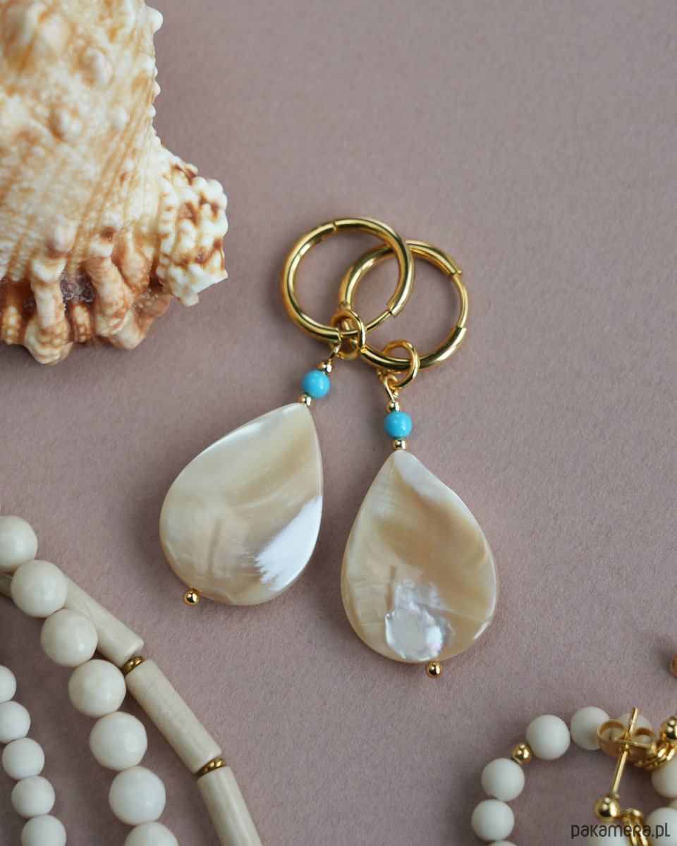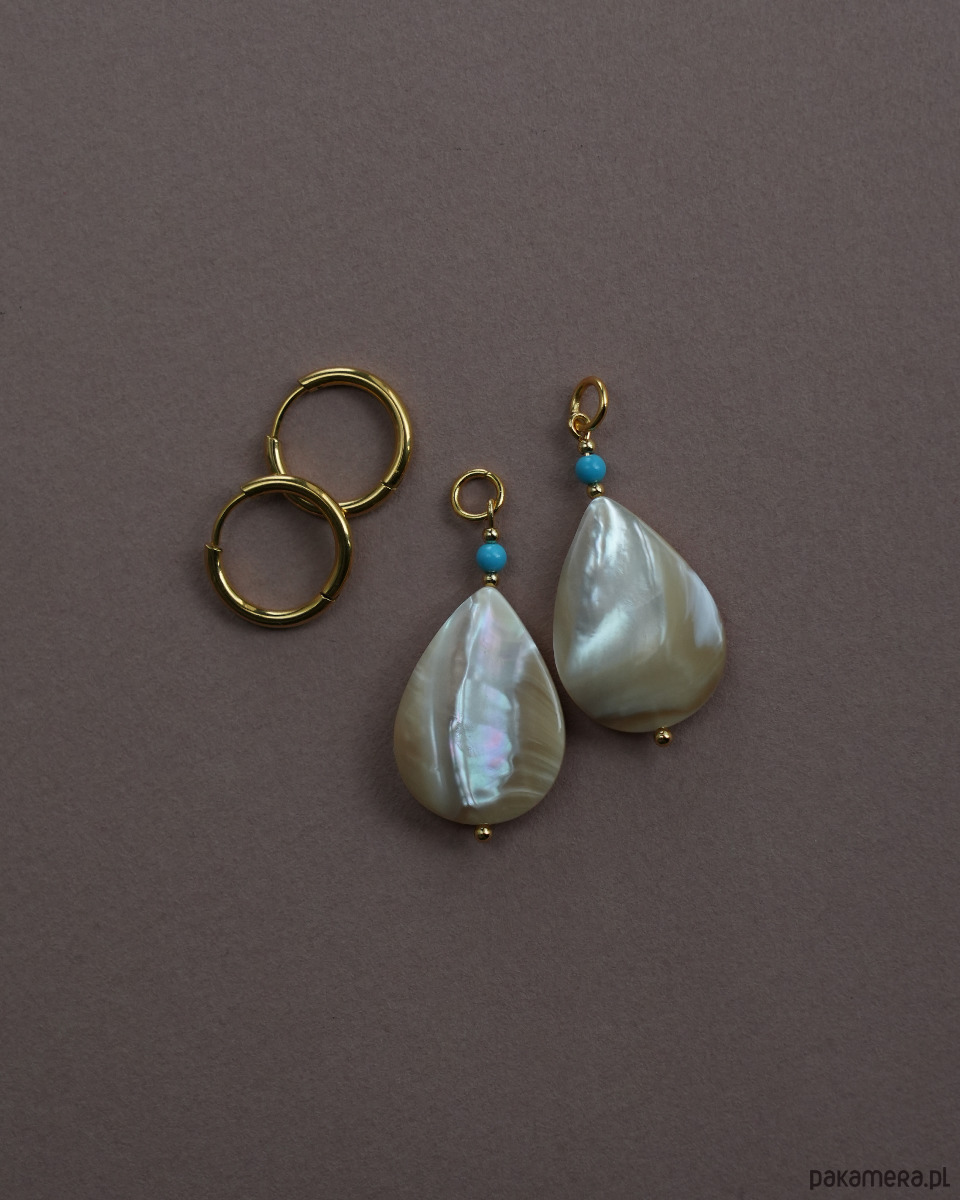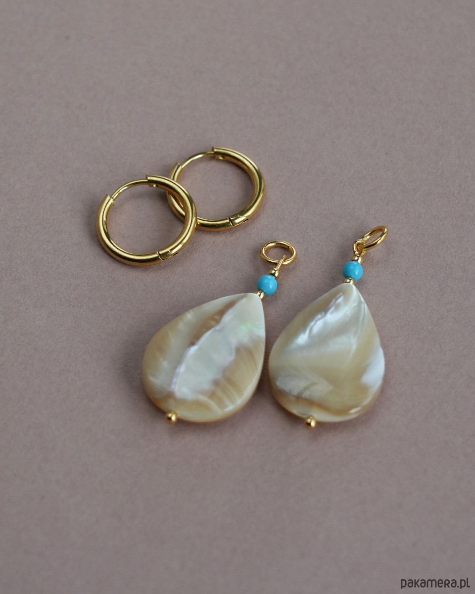 Oryginalne kolczyki na lato 2 w 1. Można je nosić na dwa sposoby - z zawieszkami lub bez, czyli same kółka. Efektowne zawieszki wykonane z masy perłowej mają piękny połysk.