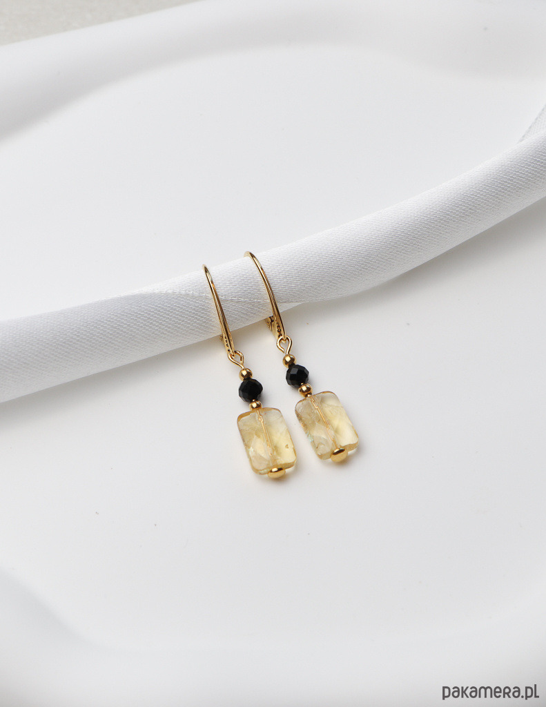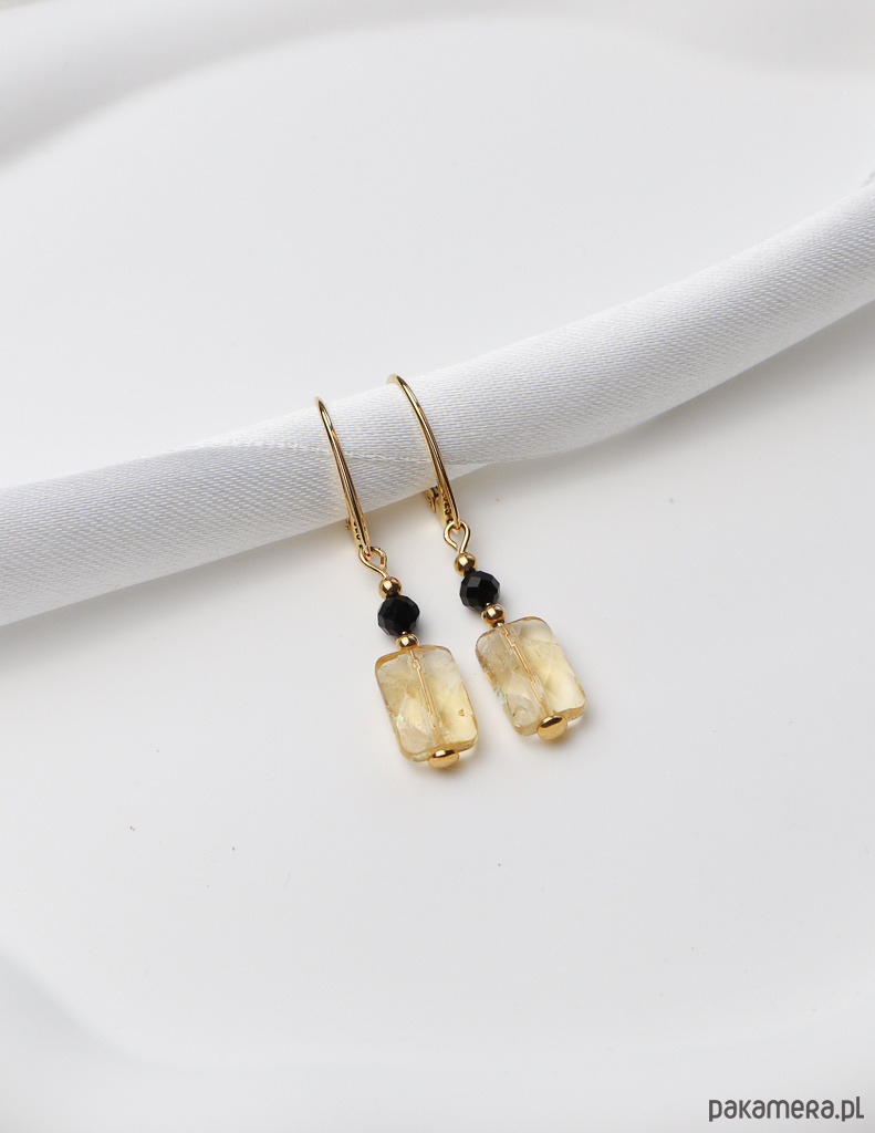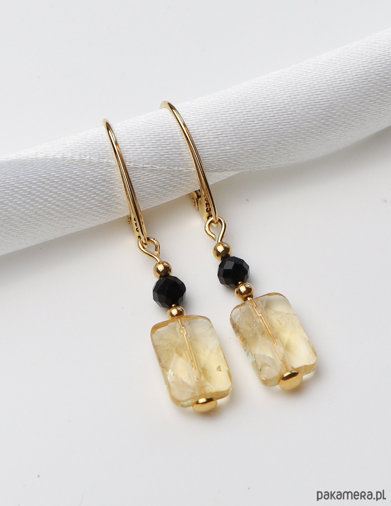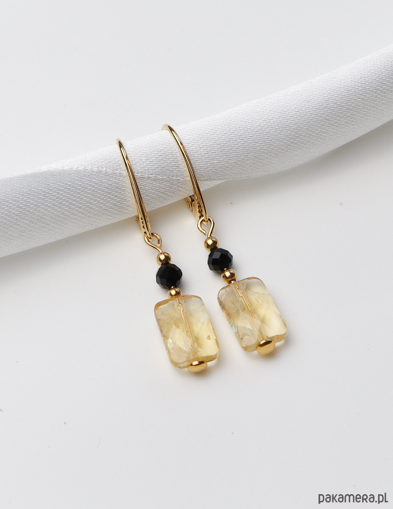 Kolczyki zostały wykonane ze srebra próby 925, pokrytego 24-karatowym złotem, co gwarantuje ich trwałość i piękny wygląd. Na pozłacanym, angielskim zapięciu zawieszono kompozycję z fasetowanej kulki czarnego turmalinu (ok. 4 mm) oraz fasetowanego prostokąta cytrynu (ok. 6 x 12 mm). Całości dopełniają drobne, złote kuleczki hematytu (ok. 2,5 mm), które dodają im subtelnej elegancji.