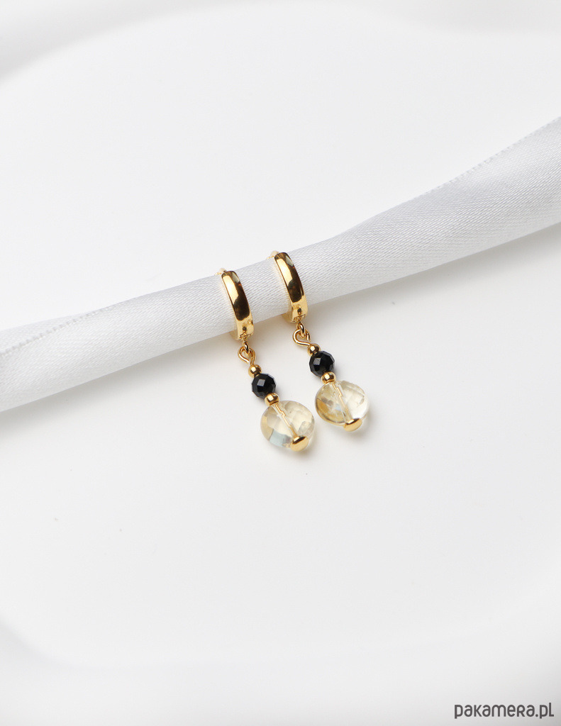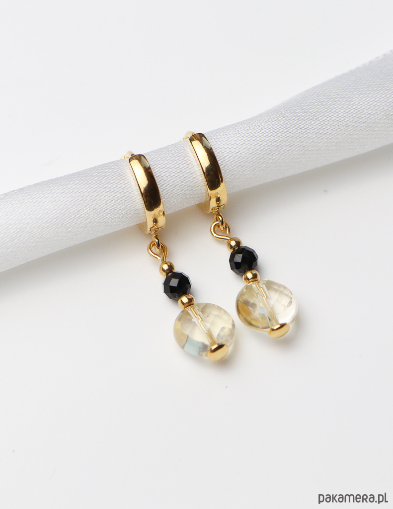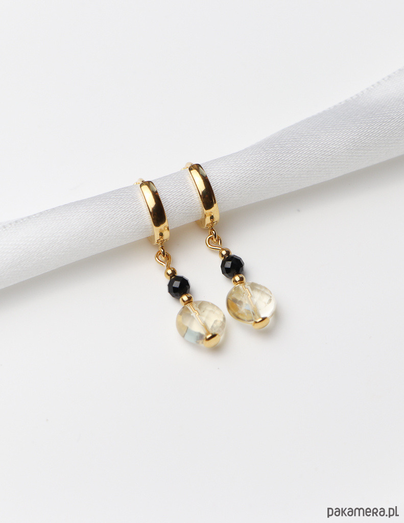 Kolczyki zostały wykonane ze srebra próby 925, pokrytego 24-karatowym złotem, co gwarantuje ich trwałość i piękny wygląd. Na pozłacanym, nowoczesnym zapięciu kajdanki zawieszono kompozycję z fasetowanej kulki czarnego turmalinu (ok. 4 mm) oraz fasetowanego dysku cytrynu (ok. 6 mm). Całości dopełniają drobne, złote kuleczki hematytu (ok. 2,5 mm), które dodają im subtelnej elegancji.