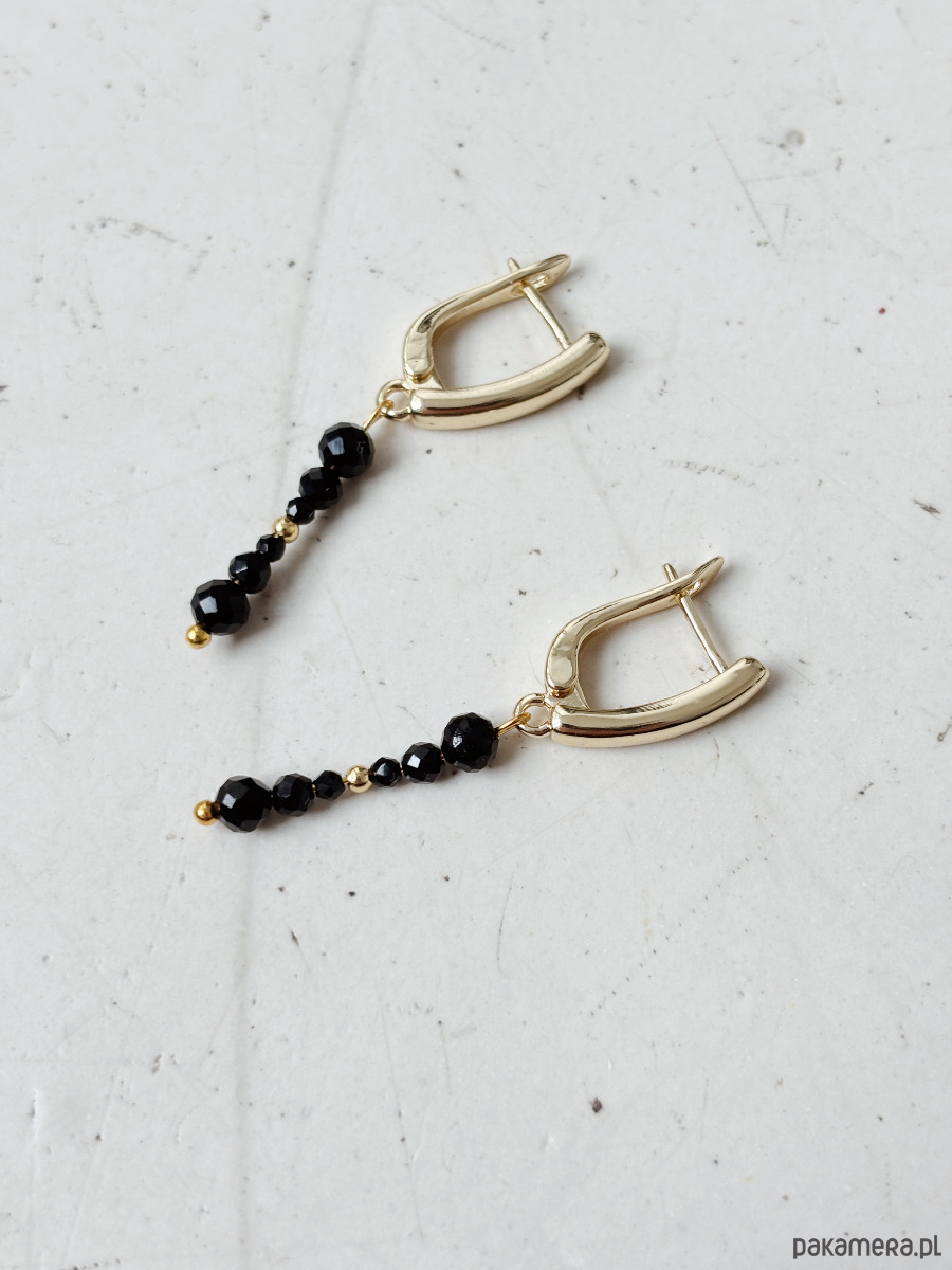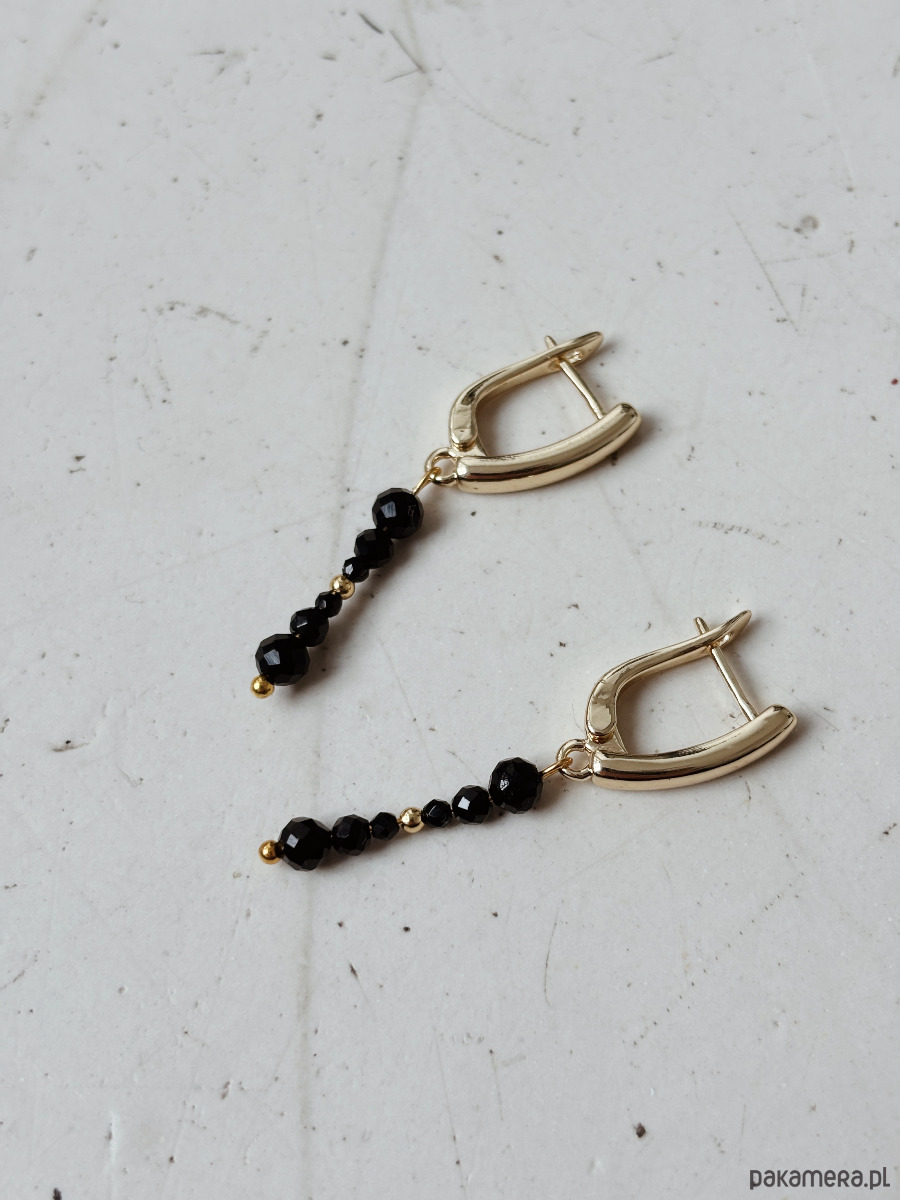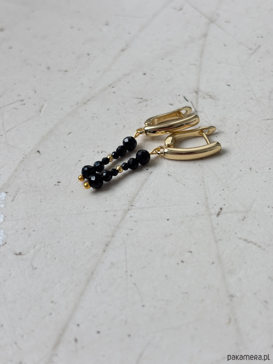 Kolczyki wykonane są z pereł i onyksu, na zapięciu wykonanym z mosiądzu rodowanego złotem.