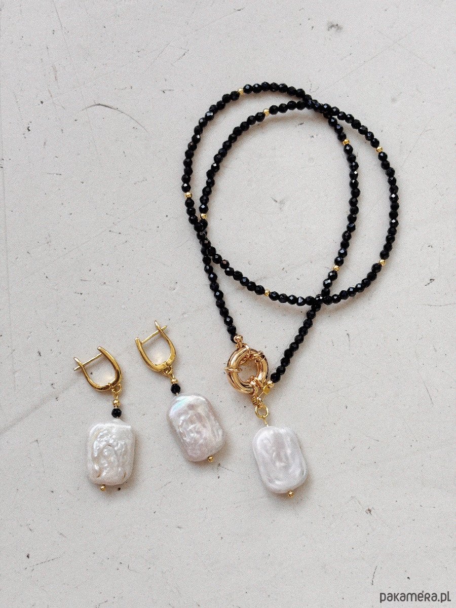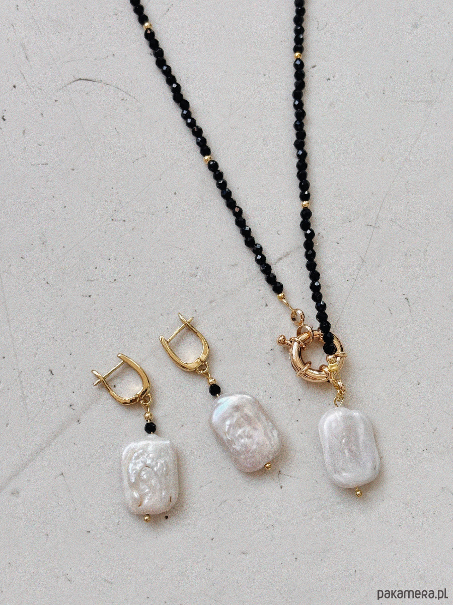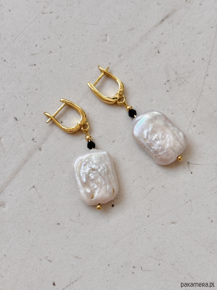 Kolczyki wykonane są z pereł i onyksu, na zapięciu wykonanym z mosiądzu rodowanego złotem.