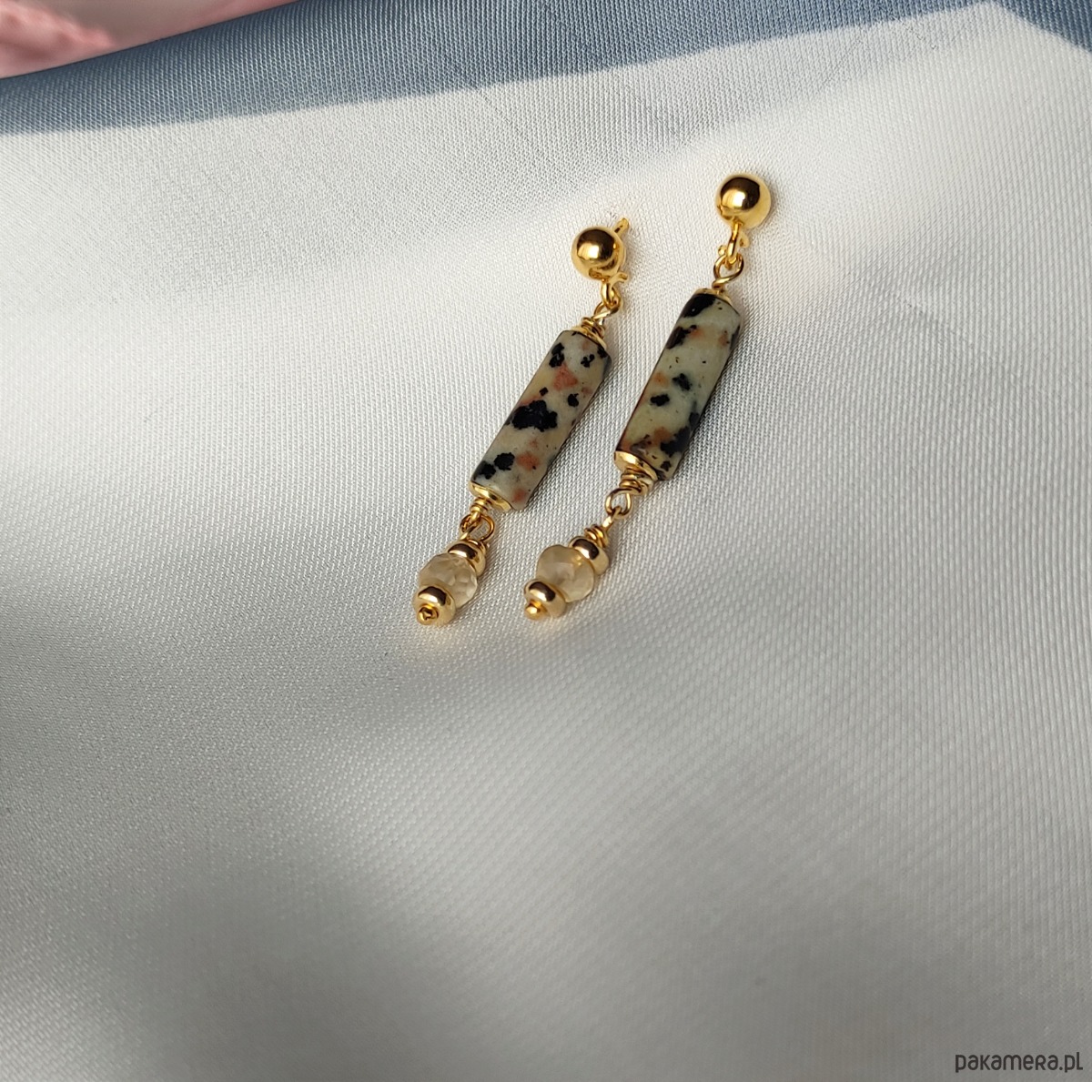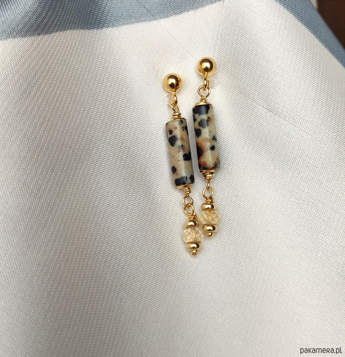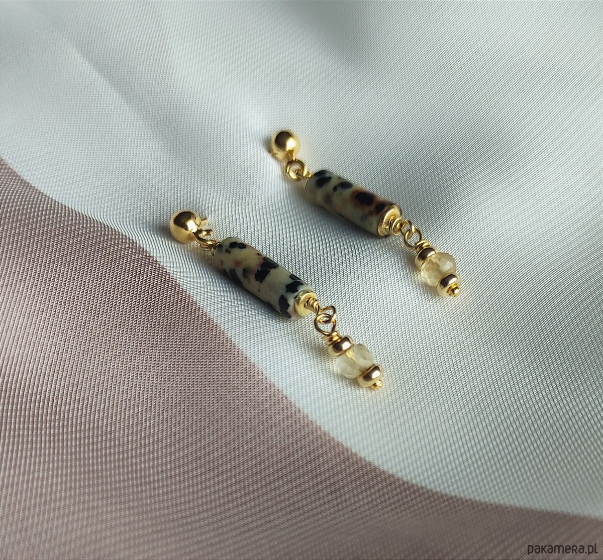 Kolczyki pełne blasku i uroku. Wykonane z rureczek jaspisu naturalnie udekorowanego w nieregularne cętki oraz kuleczek precyzyjnie szlifowanego cytrynu. Dzięki pozłacanemu srebru biżuteria jest wykreowana na styl Chic, tu w wersji panterki. Zawieszone na sztyfcie z kuleczką.