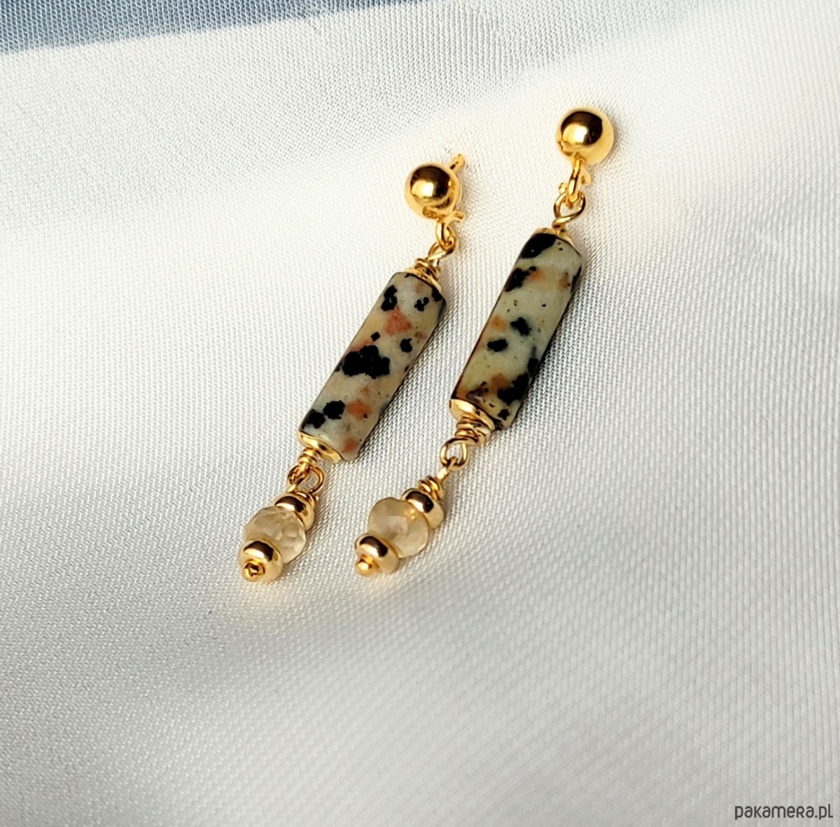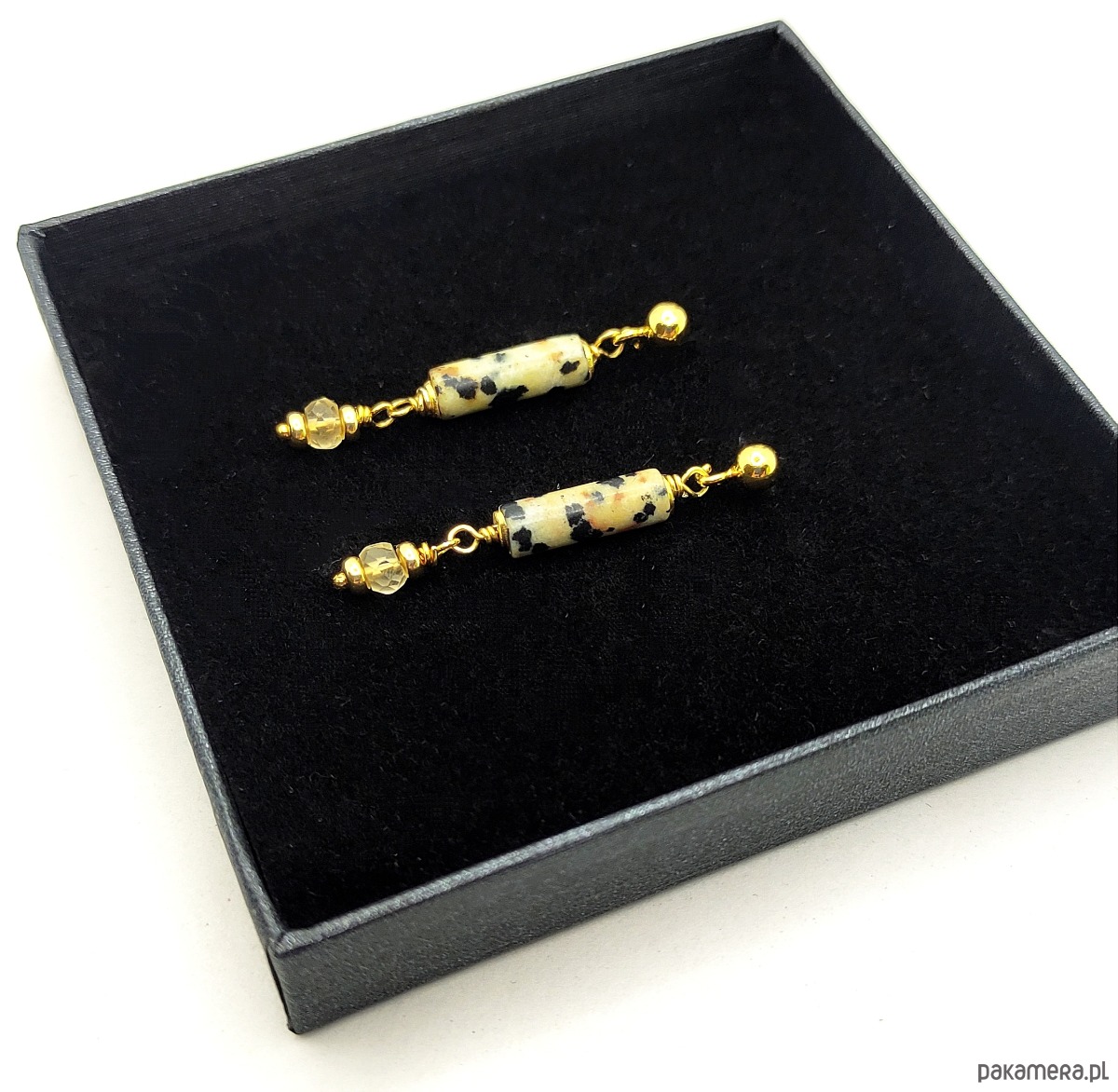 Kolczyki pełne blasku i uroku. Wykonane z rureczek jaspisu naturalnie udekorowanego w nieregularne cętki oraz kuleczek precyzyjnie szlifowanego cytrynu. Dzięki pozłacanemu srebru biżuteria jest wykreowana na styl Chic, tu w wersji panterki. Zawieszone na sztyfcie z kuleczką.