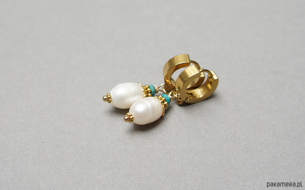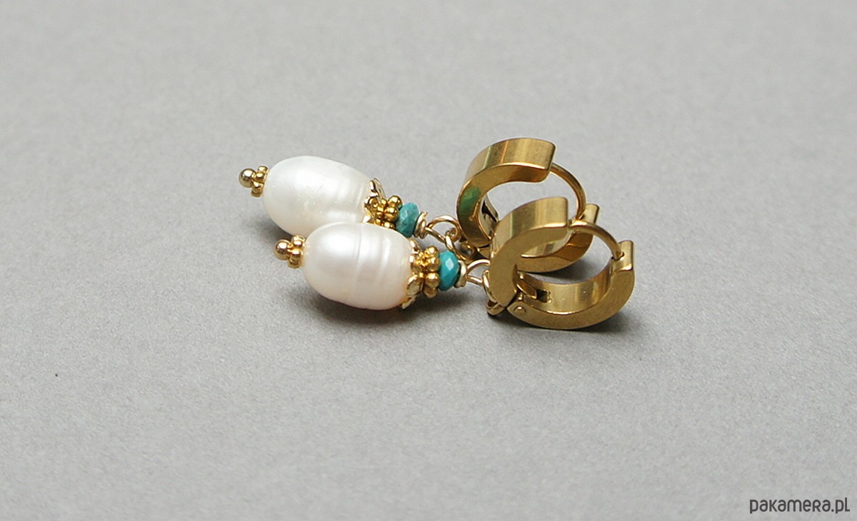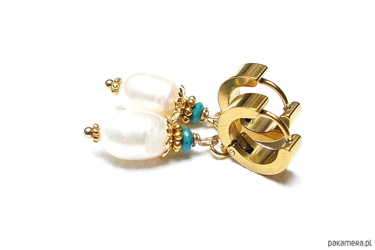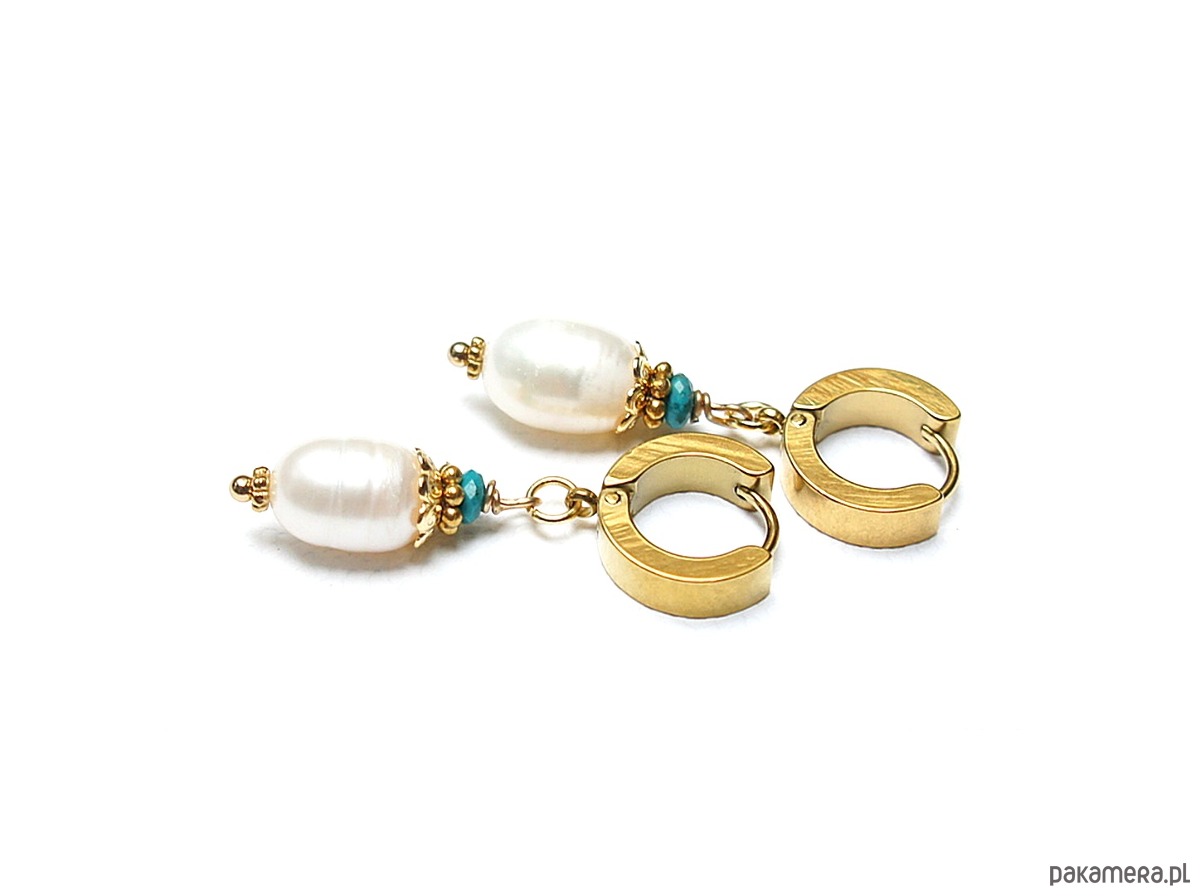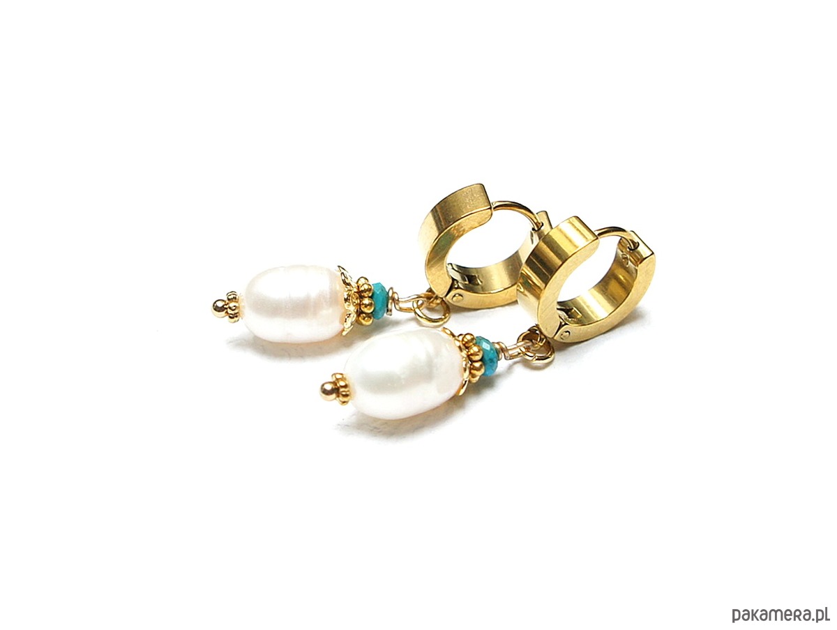 Kolczyki wykonane z pereł słodkowodnych [10mm], fasetowanych, naturalnych turkusów beauty [4mm - kamień wysokiej jakości ] oraz z pozłacanej stali szlachetnej. Długość kolczyków: 3,8cm. Bigle - kajdanki.