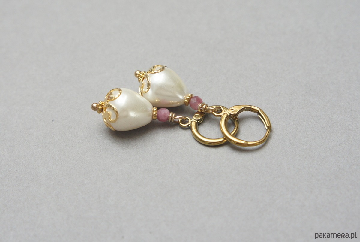 Kolczyki wykonane z pereł majorka [ok. 7mm], fasetowanych,różowych turmalinów [3mm] oraz z pozłacanej stali szlachetnej. Długość kolczyków: 3,6cm. Biżuteria ozdobnie zapakowana.