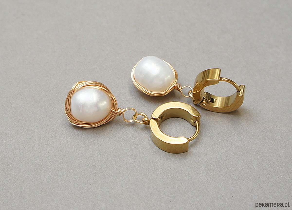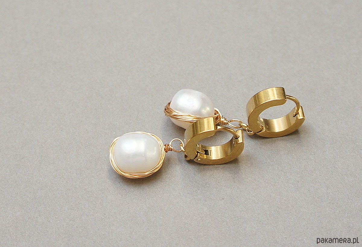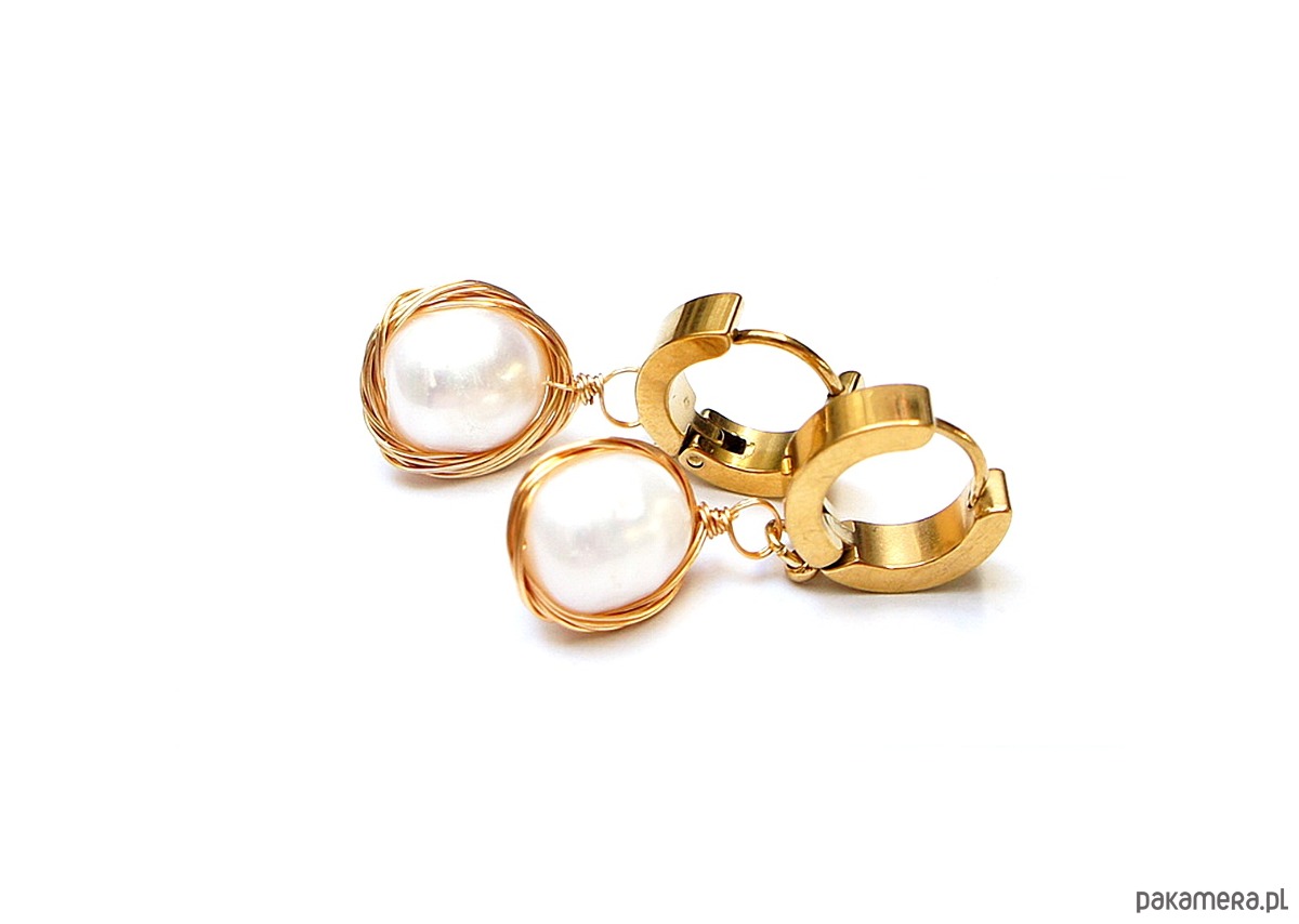 Kolczyki wykonane z pozłacanej stali szlachetnej oraz z naturalnych pereł słodkowodnych [ok. 12 x 9mm] oplecionych miedzianym drutem Długość kolczyków: 3cm. Bigle - kajdanki.