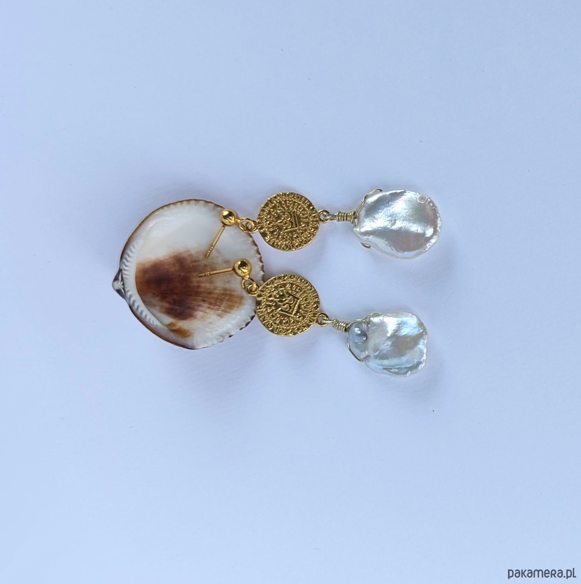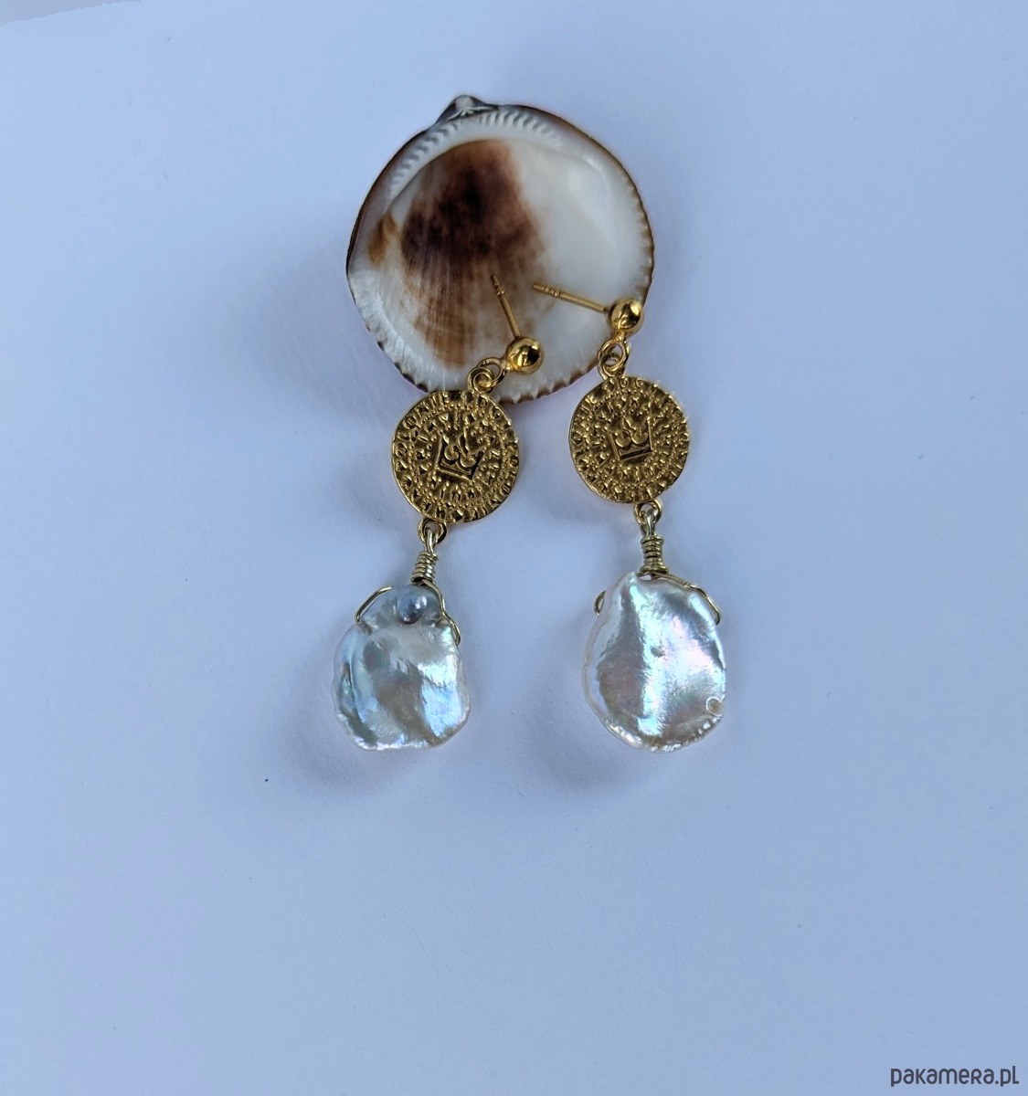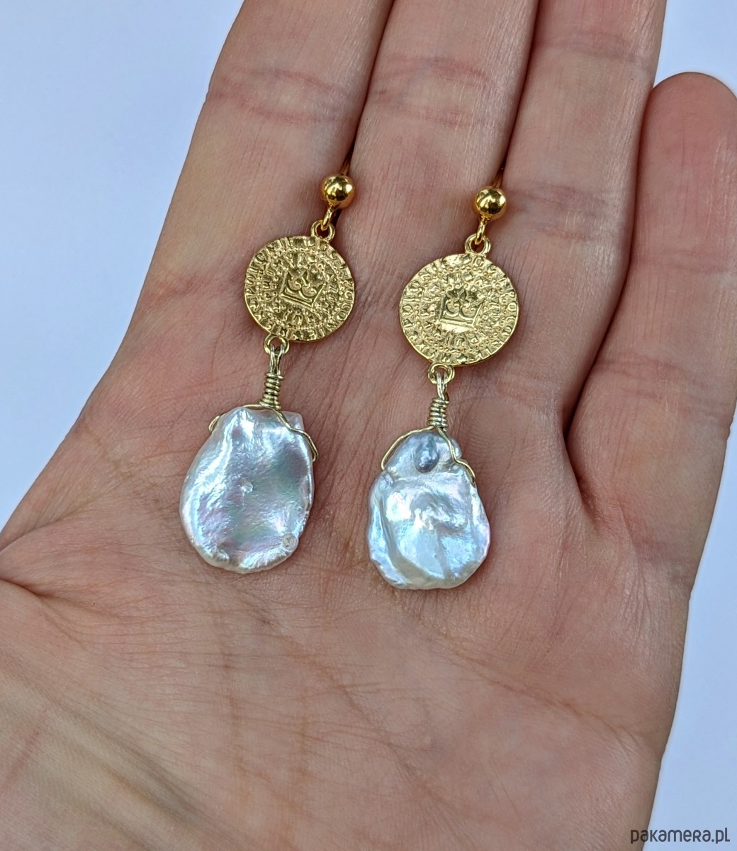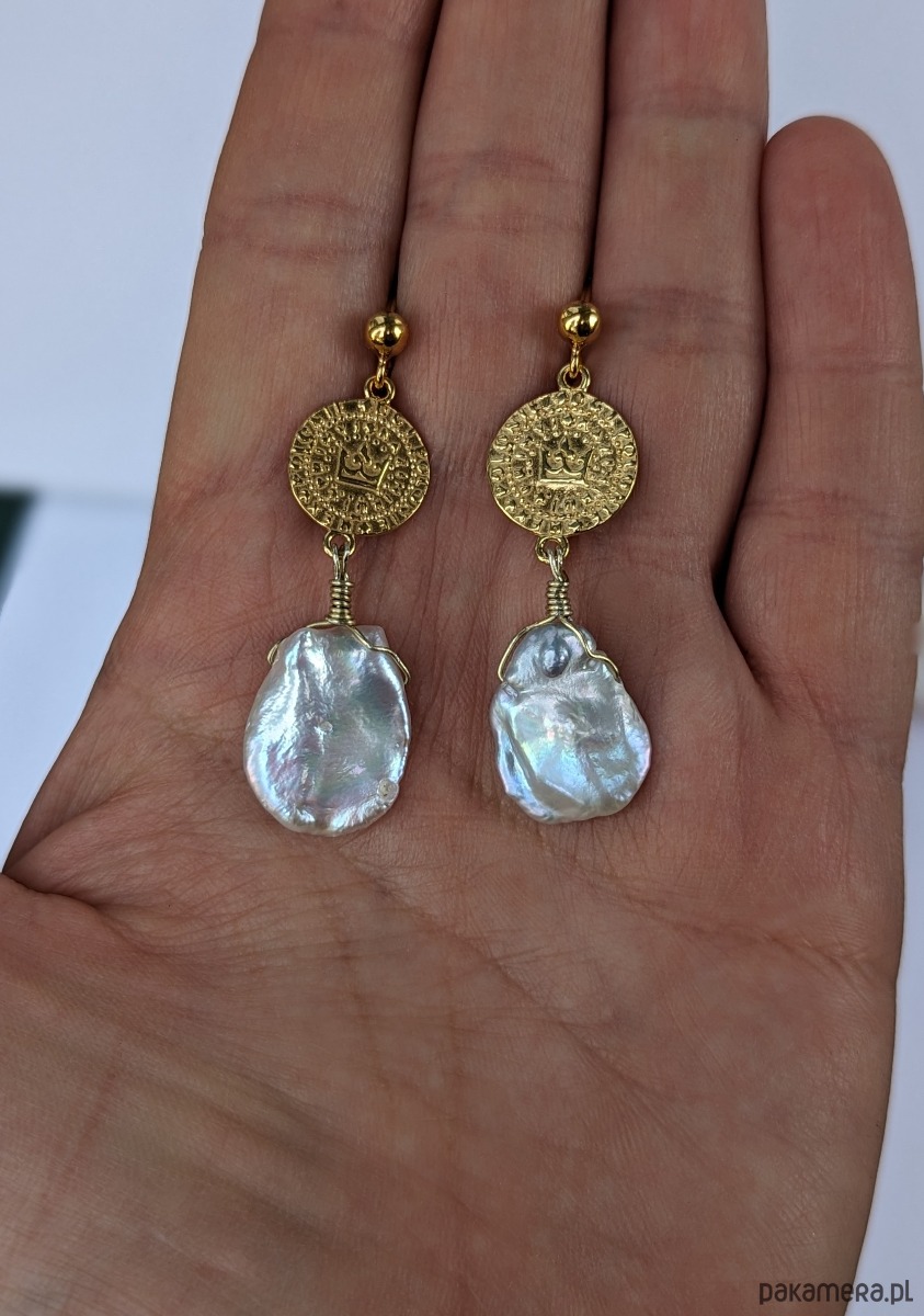 Bardzo efektowne kolczyki z pozłacanego srebra i unikatowych pereł. Piękne, nieregularne perły KESHI zostały zawieszone na monetach z wybitym symbolem korony. Te egzemplarze pereł opalizują na różne kolory, w zależności od światła. Dominuje odcień różu i błękitu, ale można dostrzec całą paletę barw. W świetle dziennym są białe.