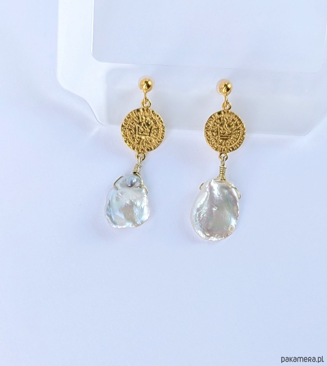 Bardzo efektowne kolczyki z pozłacanego srebra i unikatowych pereł. Piękne, nieregularne perły KESHI zostały zawieszone na monetach z wybitym symbolem korony. Te egzemplarze pereł opalizują na różne kolory, w zależności od światła. Dominuje odcień różu i błękitu, ale można dostrzec całą paletę barw. W świetle dziennym są białe.
