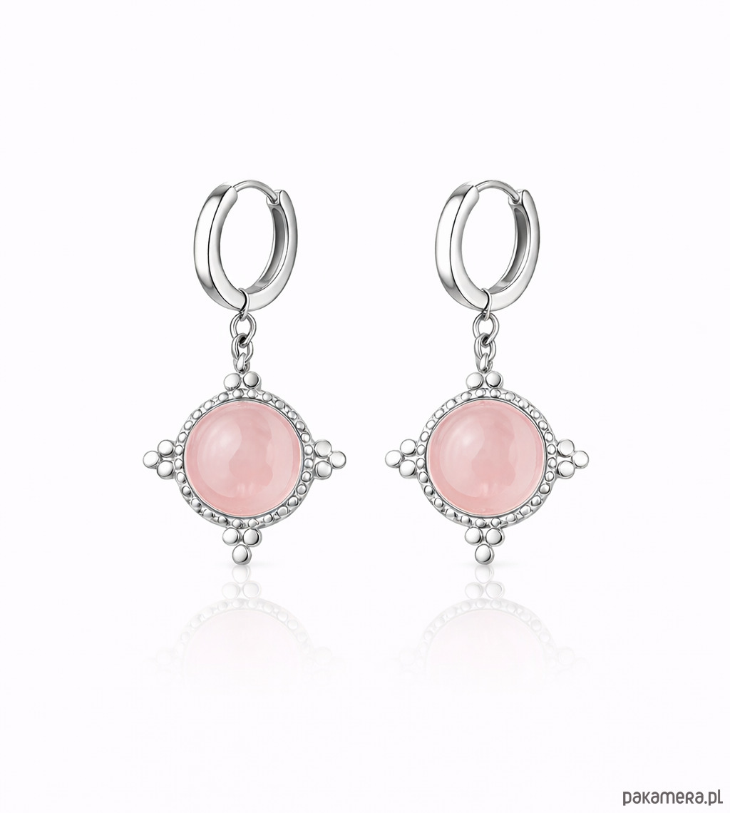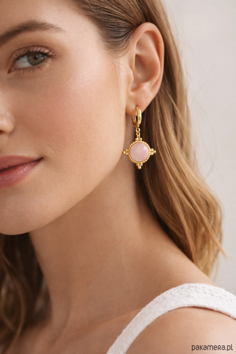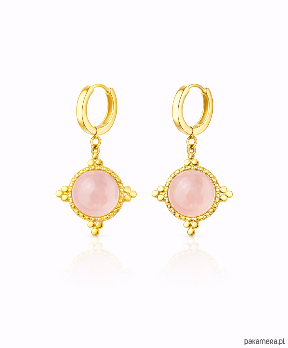 Delikatne kolczyki zapinane na bigiel angielski, wykonane ze srebra 925 lub srebra próby 925 pokrytego 24K złotem , stali chirurgicznej oraz różowego kwarcu.