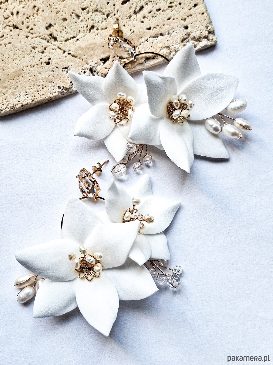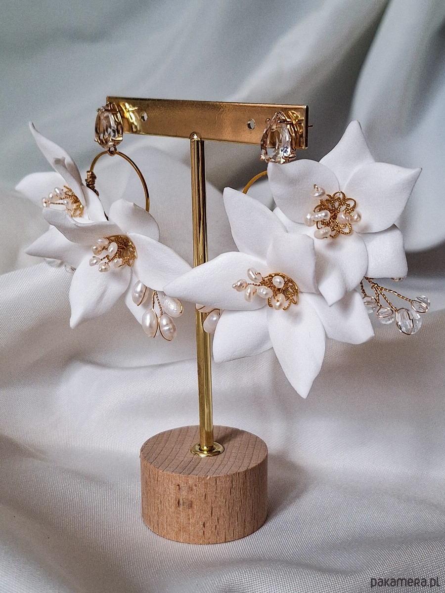Te wyjątkowe kolczyki ślubne zostały ręcznie wykonane z lekkiego foamiranu, dzięki czemu są niezwykle wygodne nawet przez cały dzień noszenia. Ich kwiatowa forma w połączeniu z naturalnymi perłami i kryształowymi detalami tworzy zjawiskową, a jednocześnie subtelną kompozycję, idealną dla panny młodej.