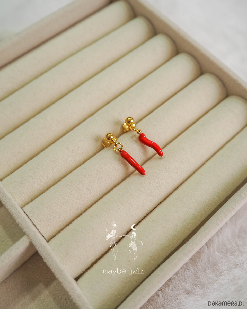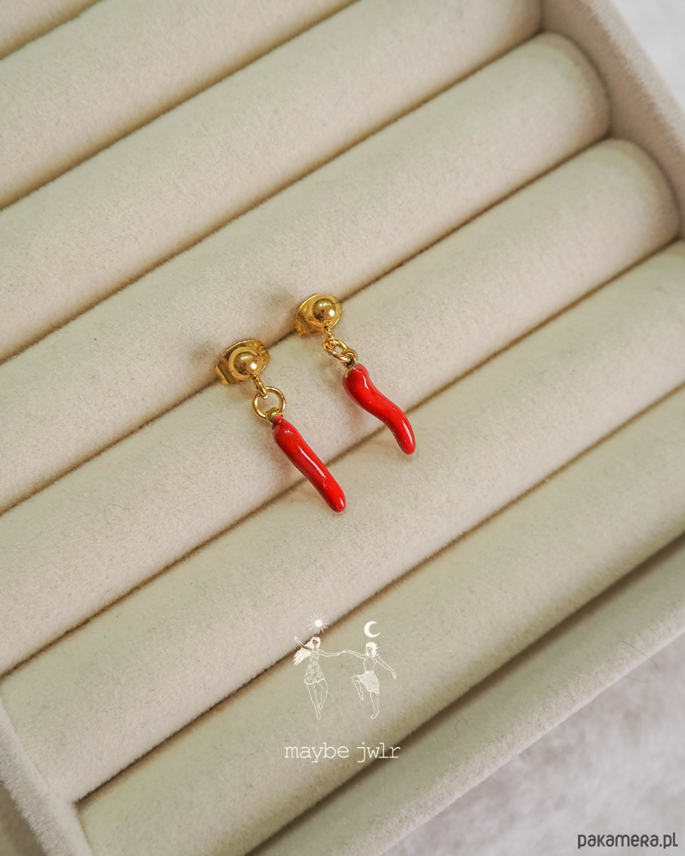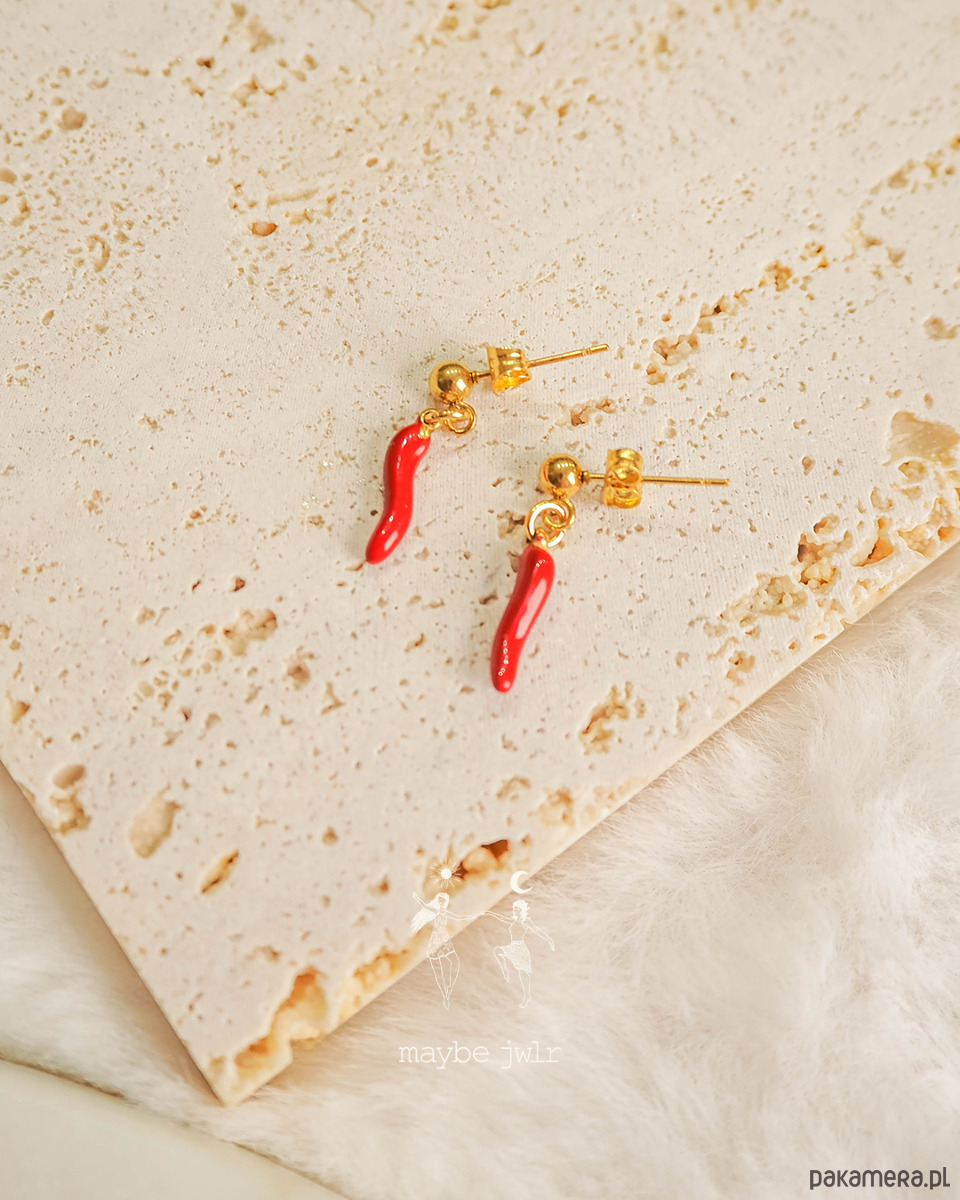 Kolczyki z kuleczką i złotymi zawieszkami papryczki chilli, są pokryte czerwoną emalią.