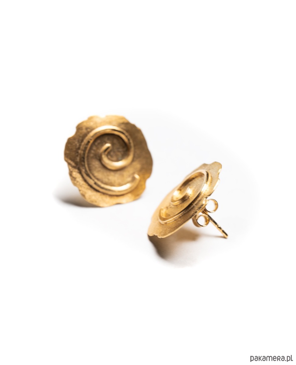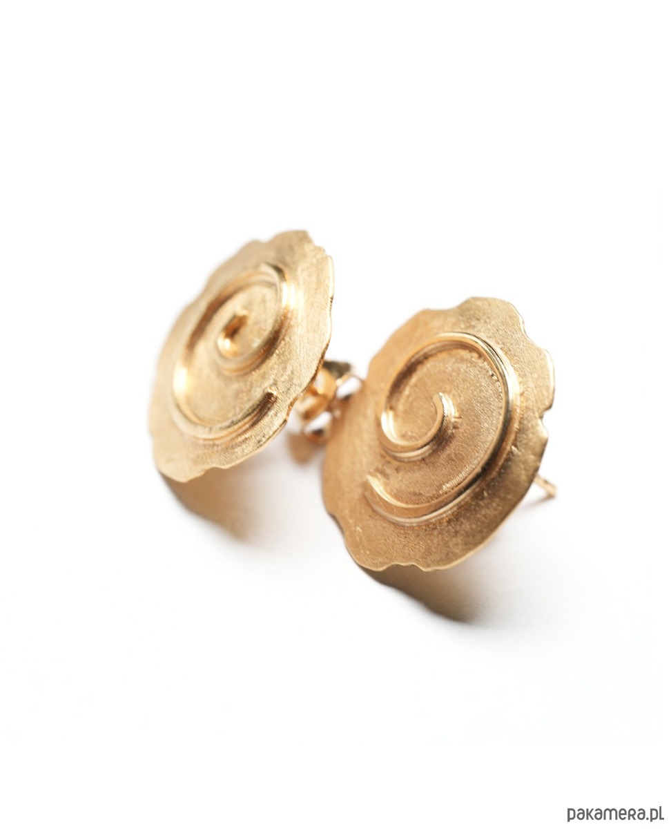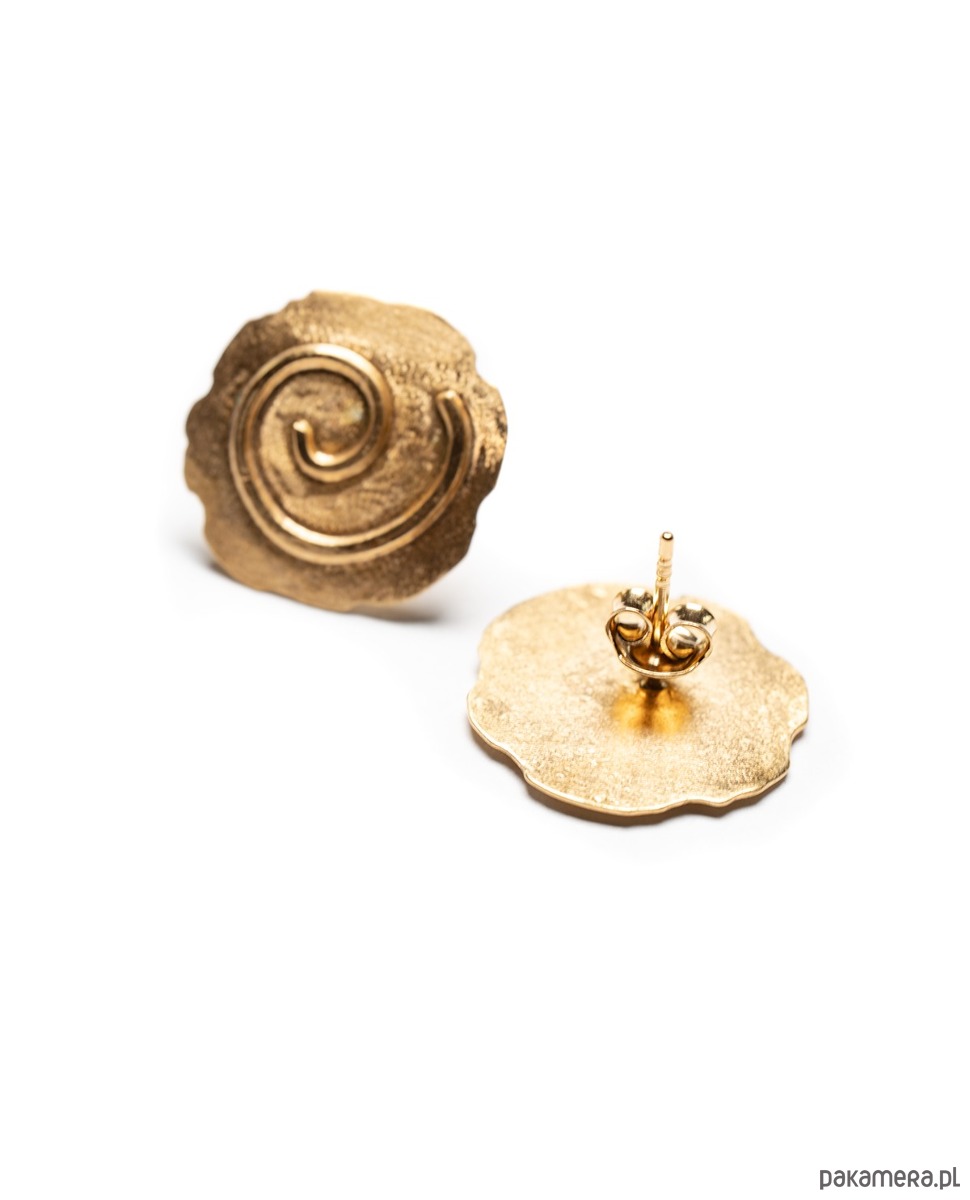 Kolczyki sztyfty, duże nieregularne blaszki wewnątrz satynowane. Wykonane ręcznie ze srebra 925, złocone 24k złotem.