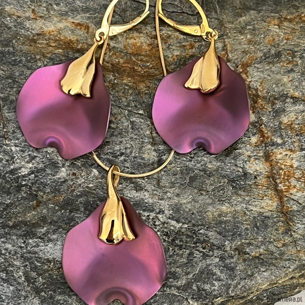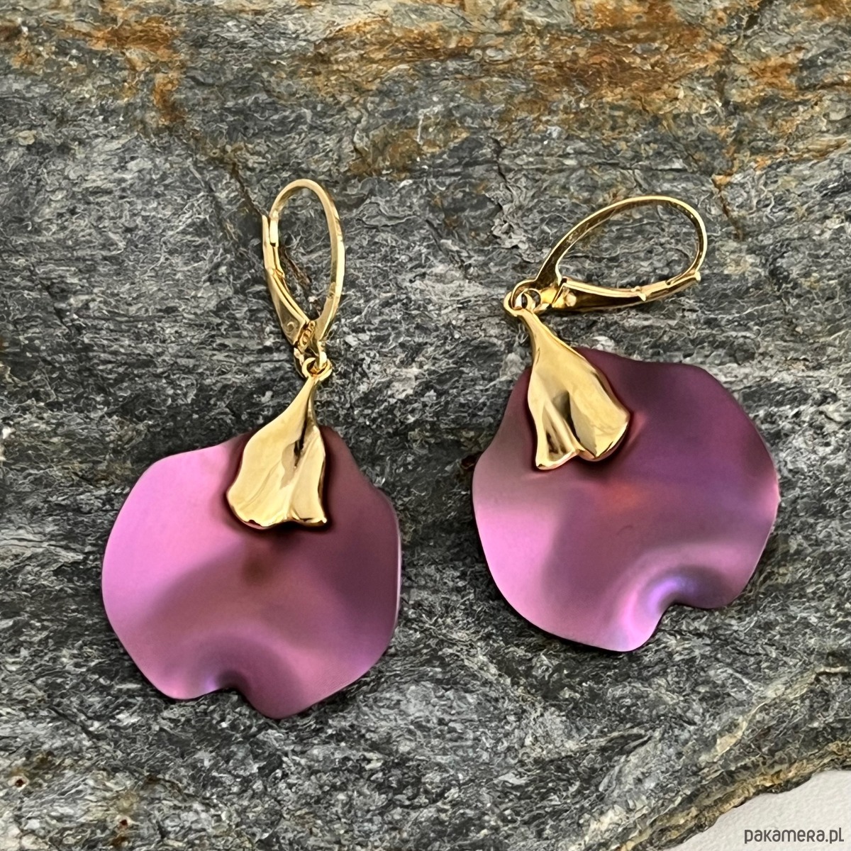 Wyjątkowe kolczyki ze srebra 925 pozłacanego z tytanem w odcieniu fioletowym złotym z motywem platka kwoatu-liścia.