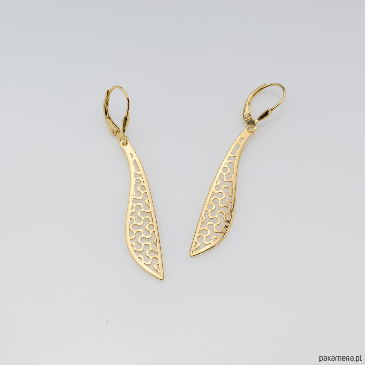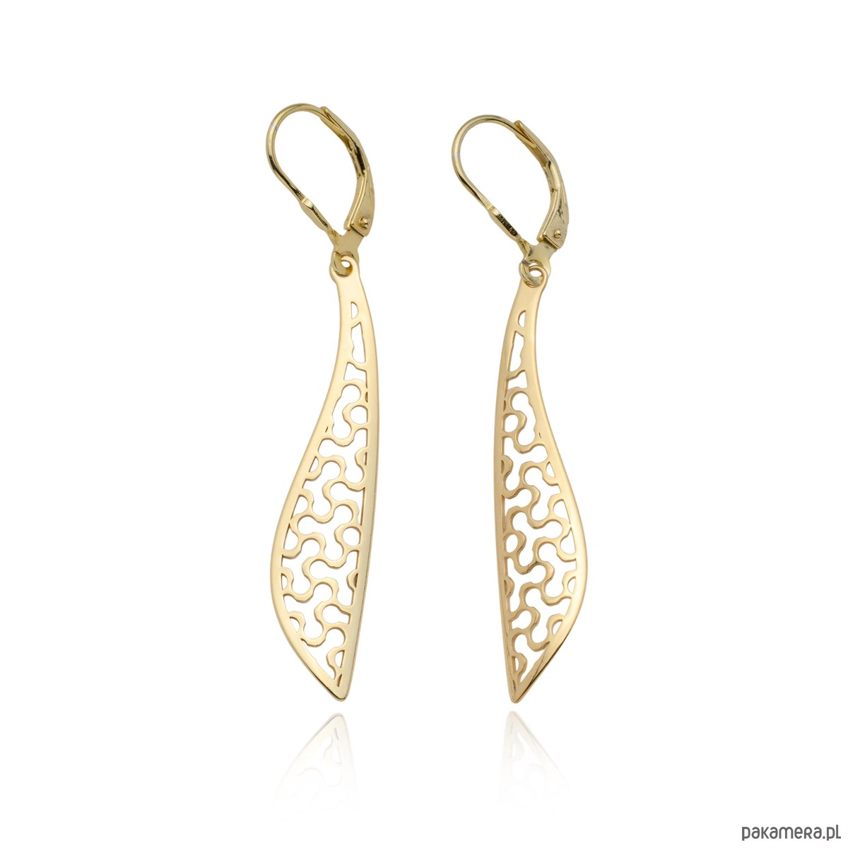 Eleganckie i lekkie kolczyki wykonane ze srebra próby 925 pozłacane wyróżniające się nowoczesnym, ażurowym wzorem. Ich smukły, wydłużony kształt pięknie podkreśla szyję, dodając stylizacji subtelnej elegancji i lekkości.