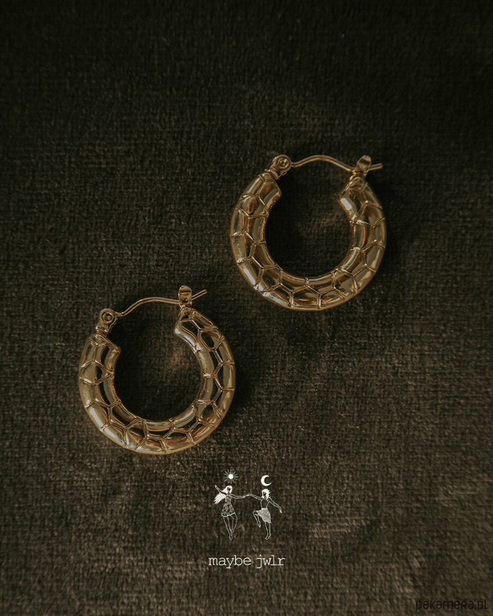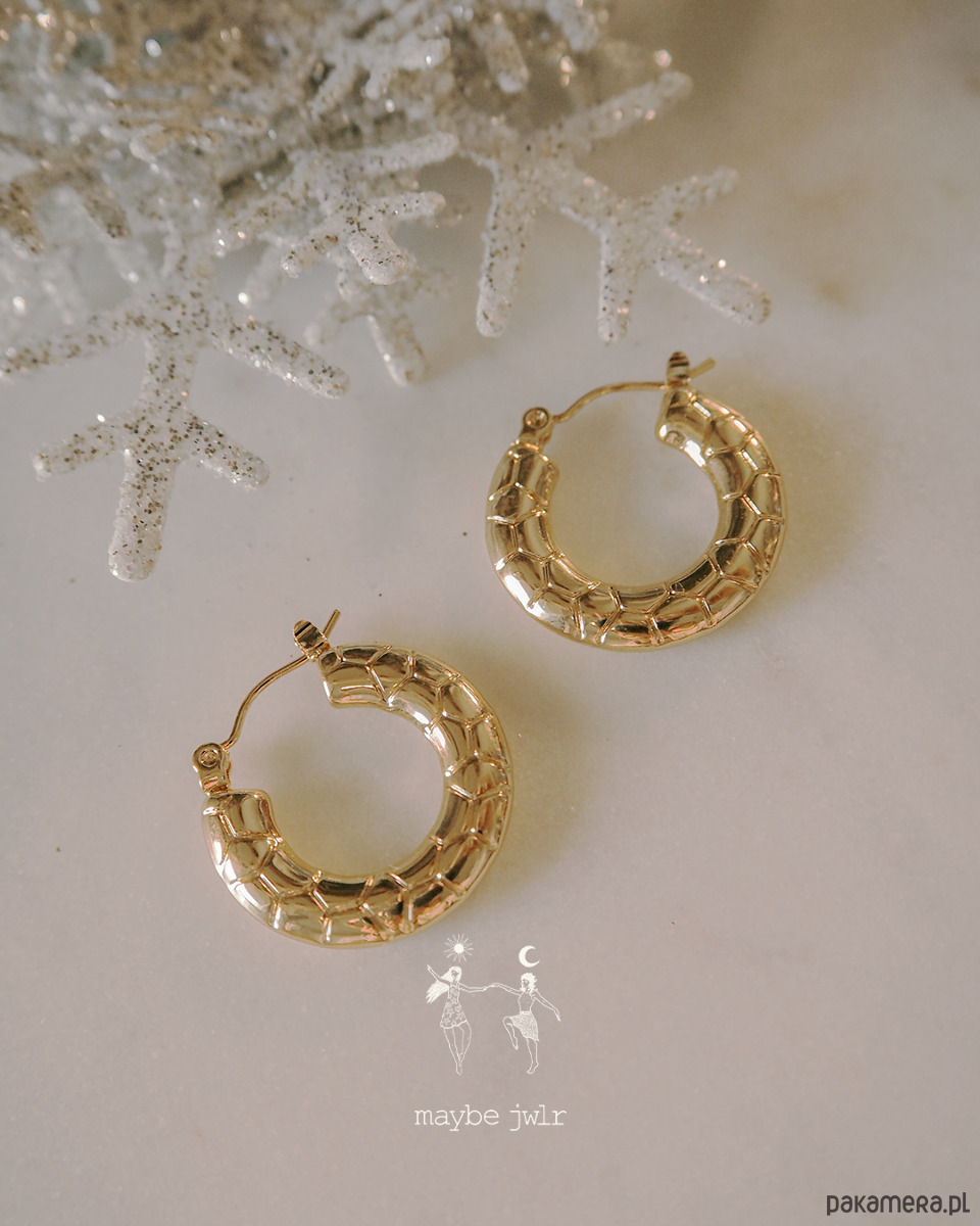 Wyrazista forma — nie są to zwykłe kółka. Mają nowoczesny, łódeczkowy kształt i delikatną, ozdobną fakturę, która pięknie odbija światło. Efekt? Kolczyki, które od razu przyciągają spojrzenia.