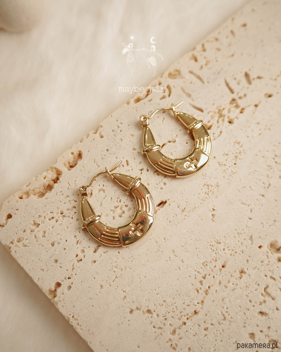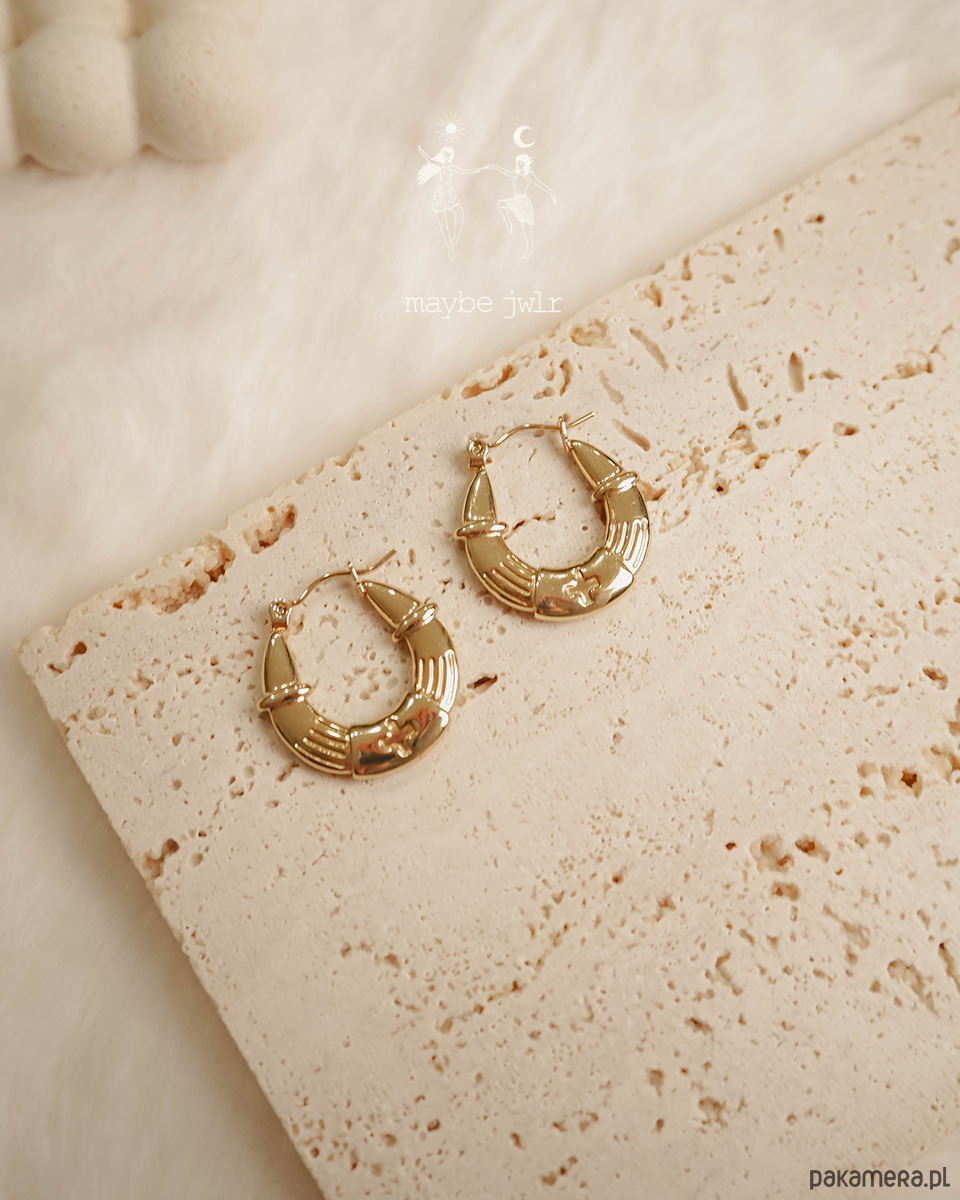 Wyrazista forma — nie są to zwykłe kółka. Mają nowoczesny, łódeczkowy kształt i delikatną, ozdobną fakturę, która pięknie odbija światło. Efekt? Kolczyki, które od razu przyciągają spojrzenia.