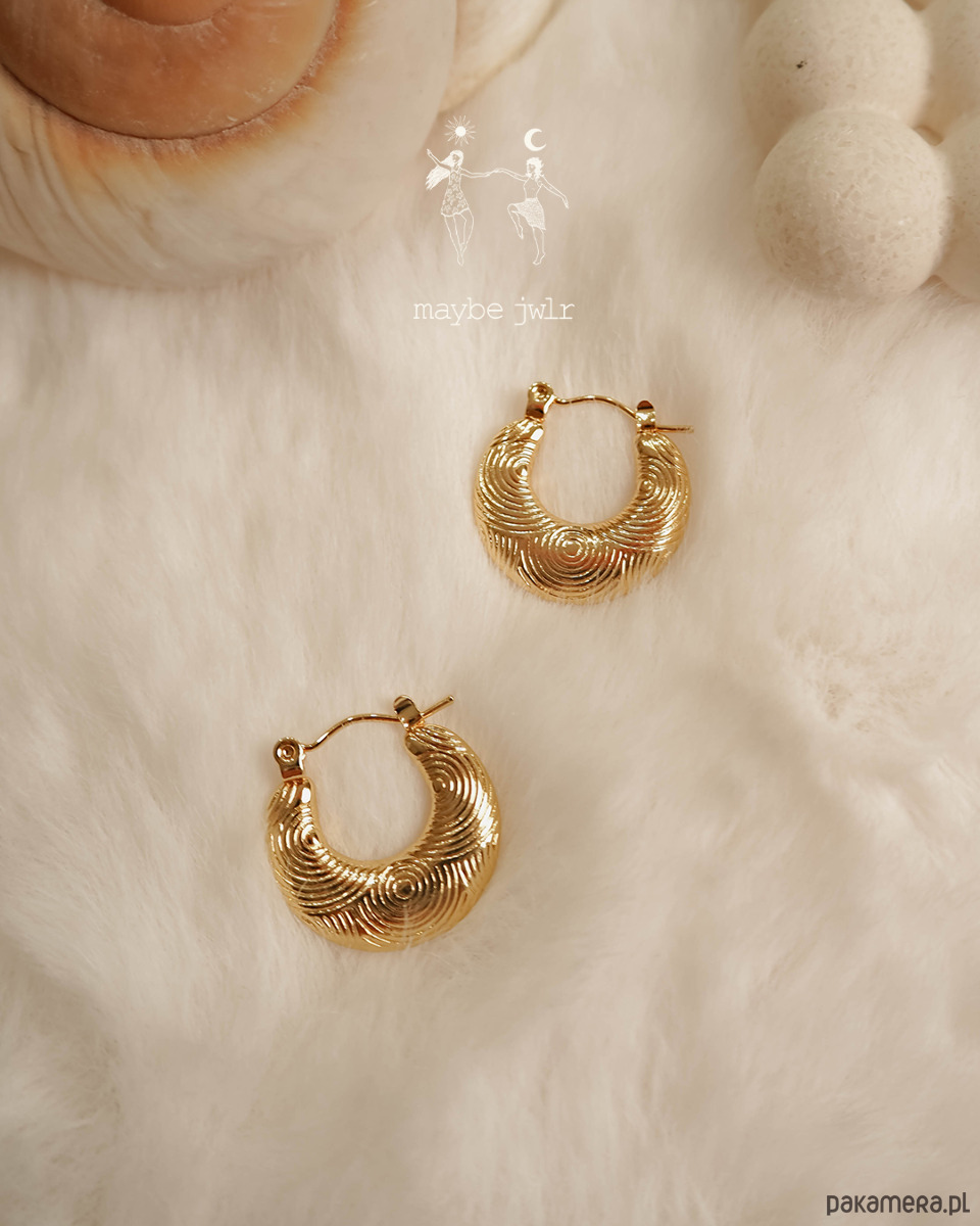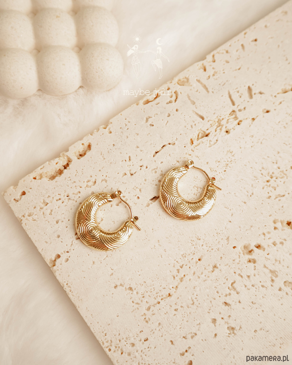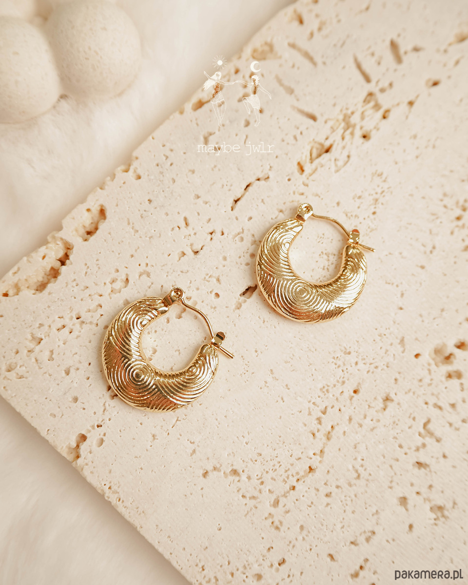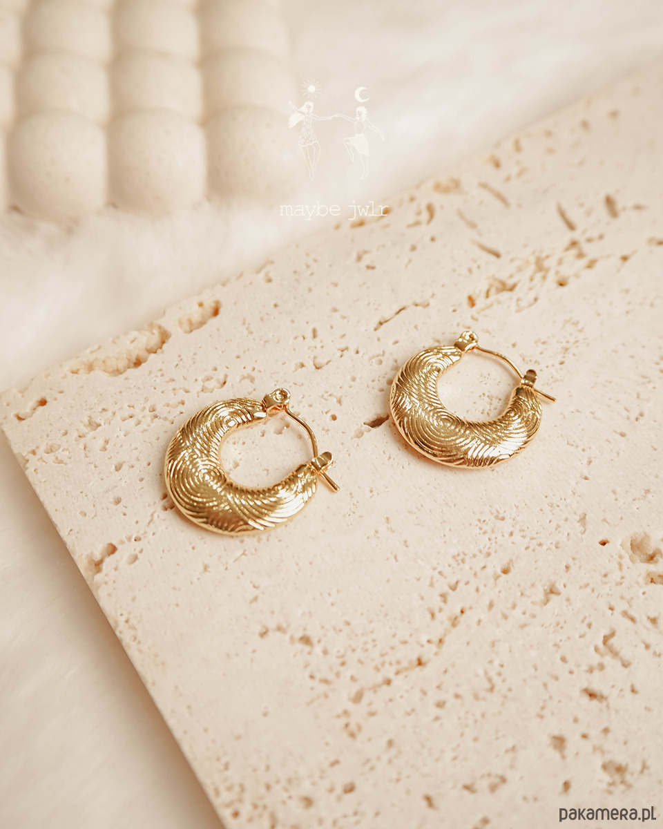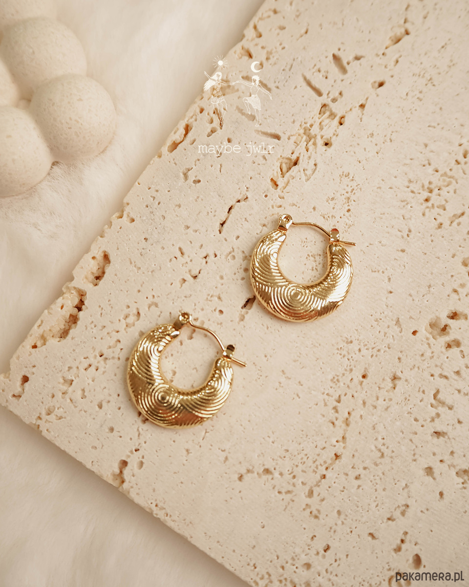Wyrazista forma — nie są to zwykłe kółka. Mają nowoczesny, łódeczkowy kształt i delikatną, ozdobną fakturę, która pięknie odbija światło. Efekt? Kolczyki, które od razu przyciągają spojrzenia.