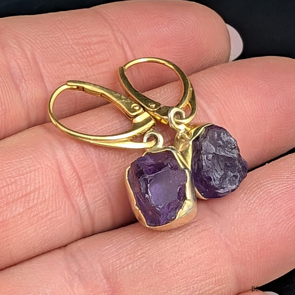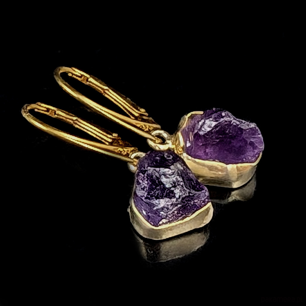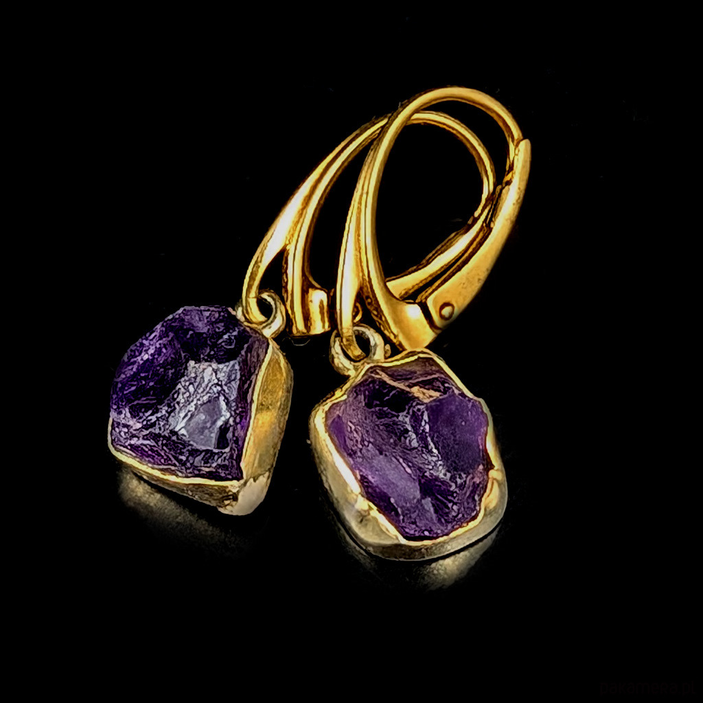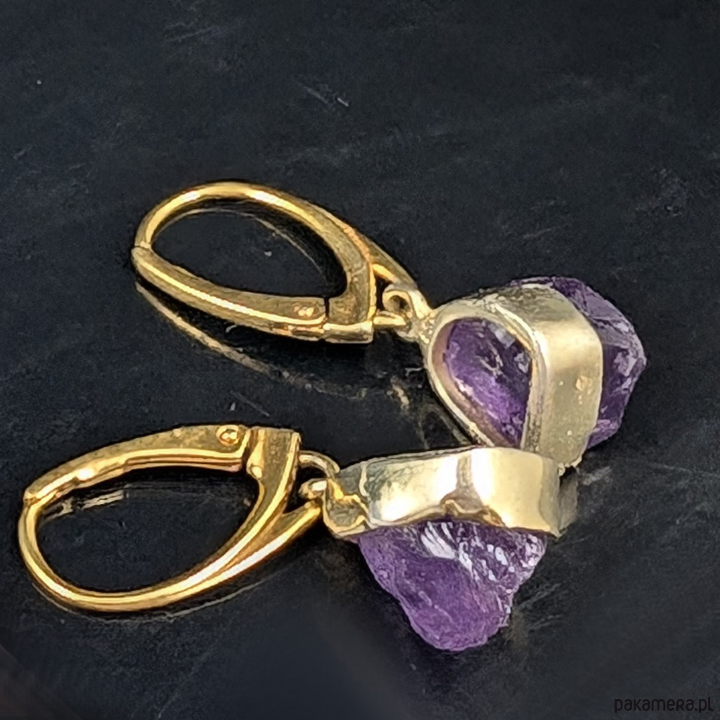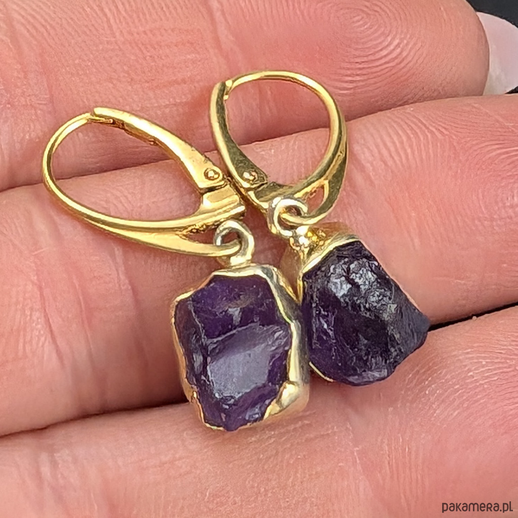 Eleganckie i surowe kolczyki wykonane ze srebra 925 oraz surowych ametystów. Srebro pozłacane, są to delikatne powłoki, które z czasem mogą się przetrzeć. Kamienie zachwycają piękną barwą. Wymiary elementów oprawy kamienia 11 x 10 mm. Zapinane na klasyczne bigle angielskie. Długość całości z biglami 30 mm. Leciutkie,waga jednego kolczyka 2 gramy. Kolczyki zostaną zapakowane w ozdobne pudełeczko.