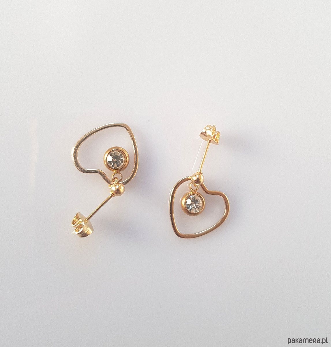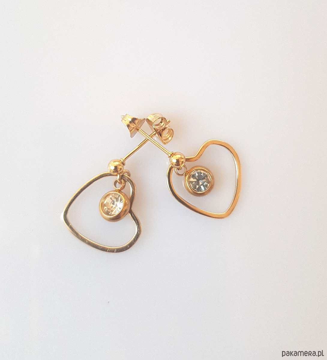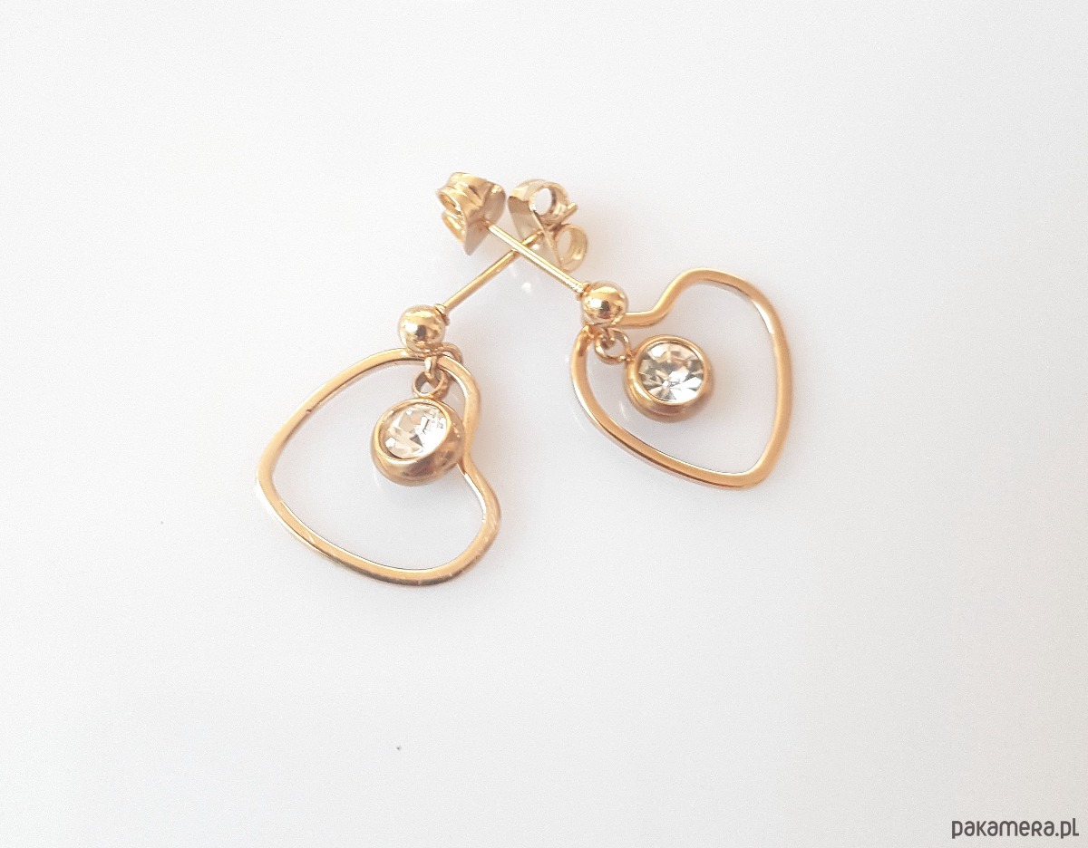Serduszko z mosiądzu platerowanego złotem, sztyfty i okucie cyrkonii z pozłoconej stali szlachetnej.