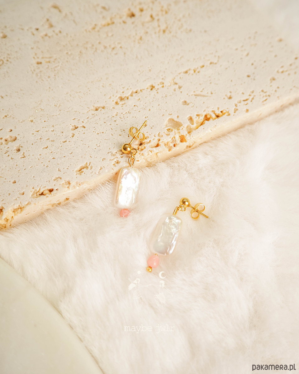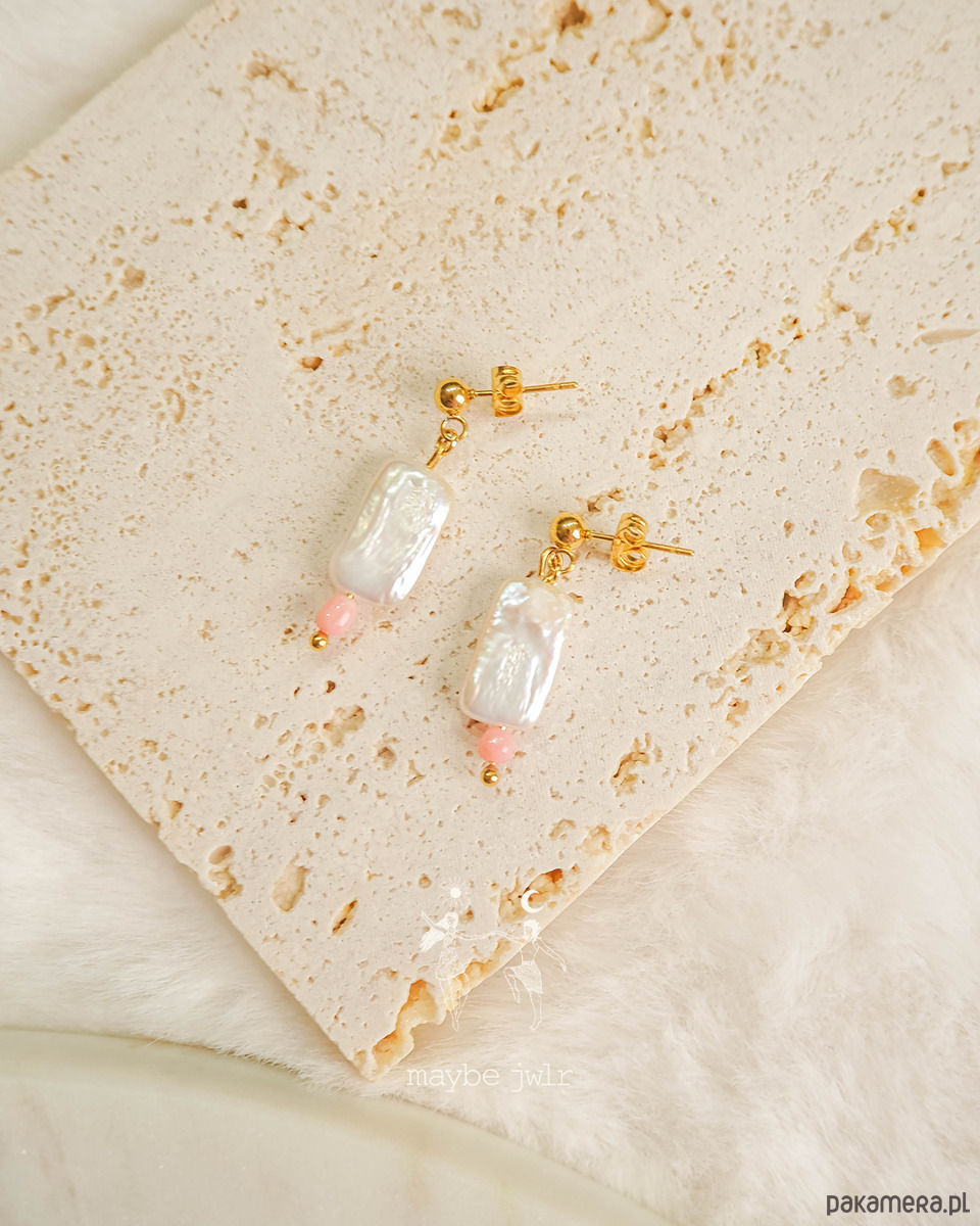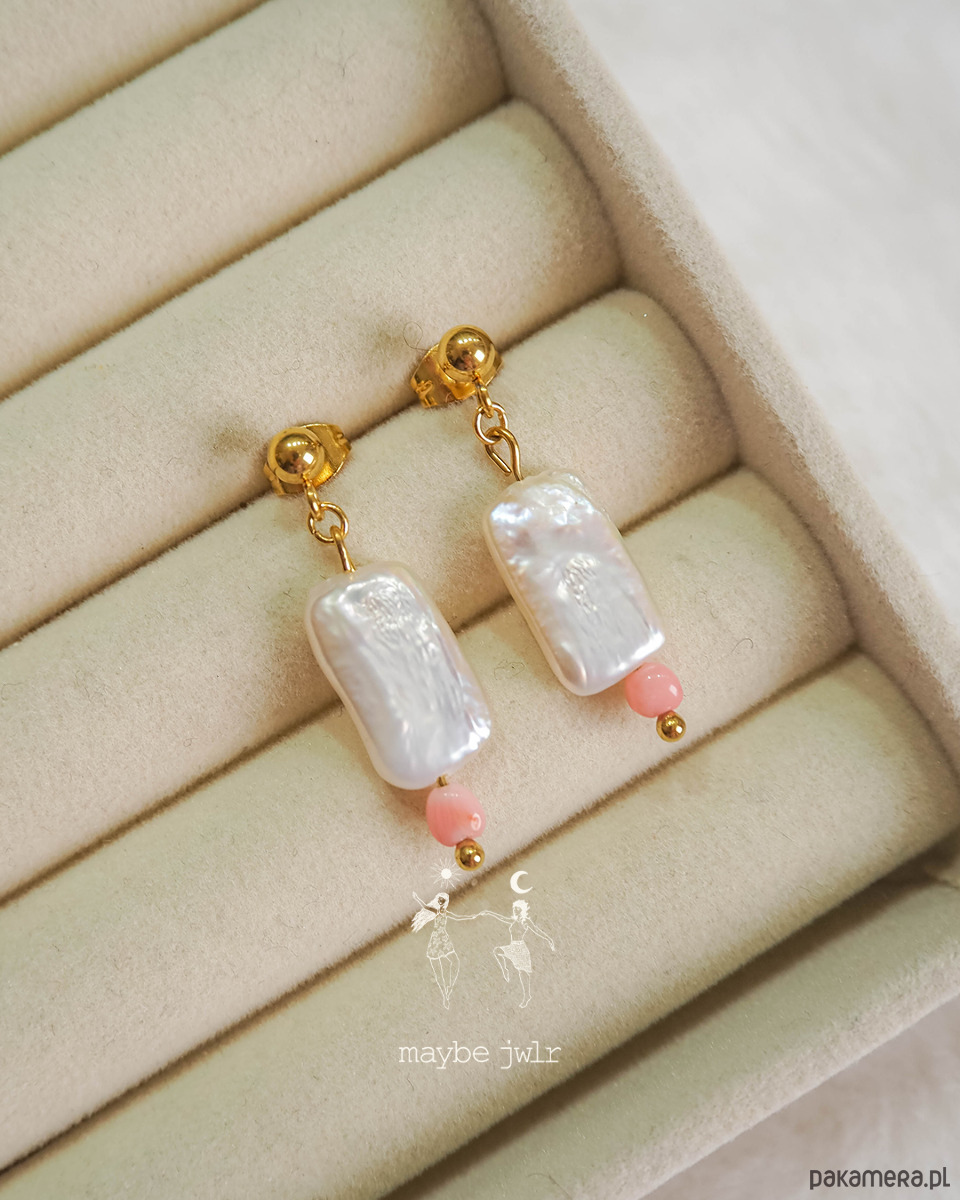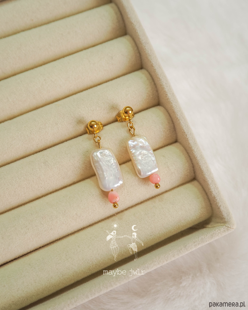 Kolczyki z kuleczką i ręcznie robioną zawieszką z perłą naturalną i koralem.
