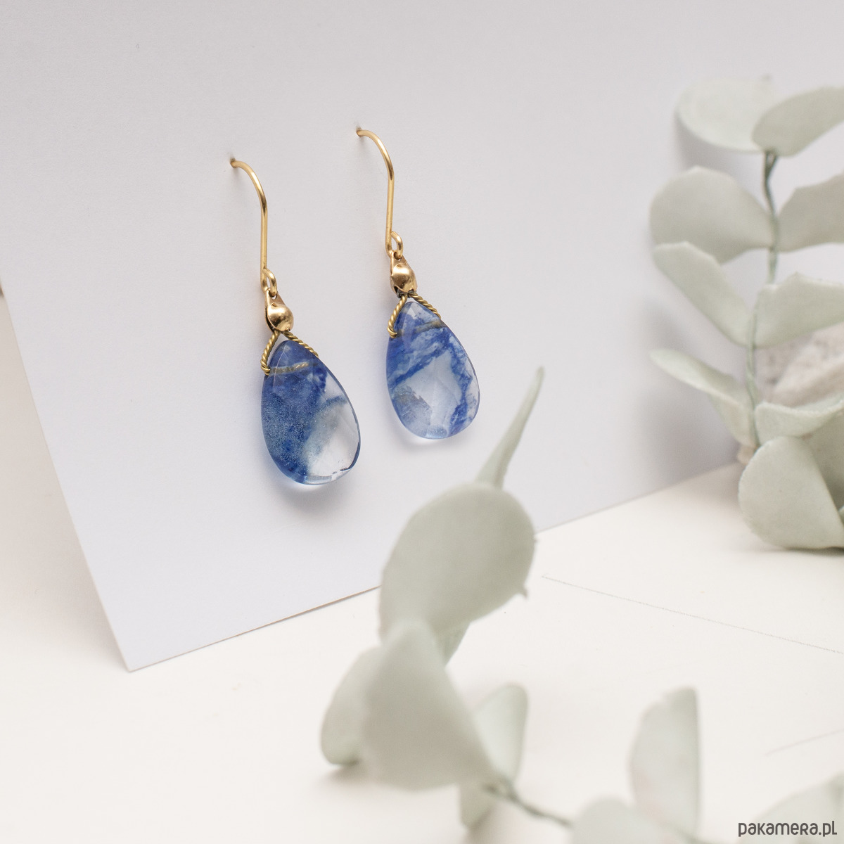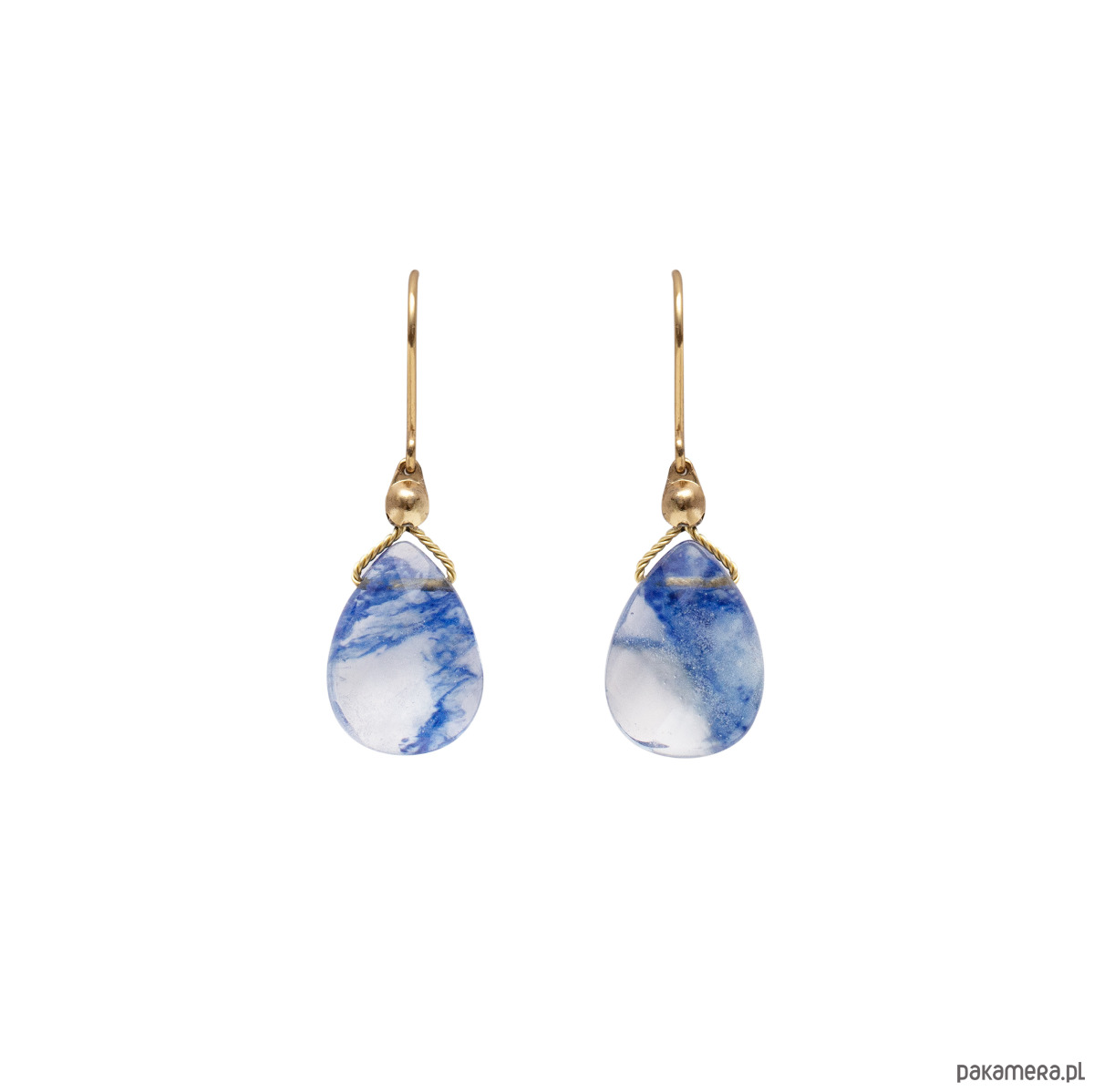 Te nieco cięższe, wyjątkowo efektowne kolczyki łączą w sobie elegancję złoconej stali szlachetnej z naturalnym pięknem niebieskiego kwarcu uformowanego w kształt szlachetnych łezek. Ich wyrazista, lekko masywna forma nadaje stylizacji charakteru, jednocześnie pozostając harmonijną i kobiecą.
