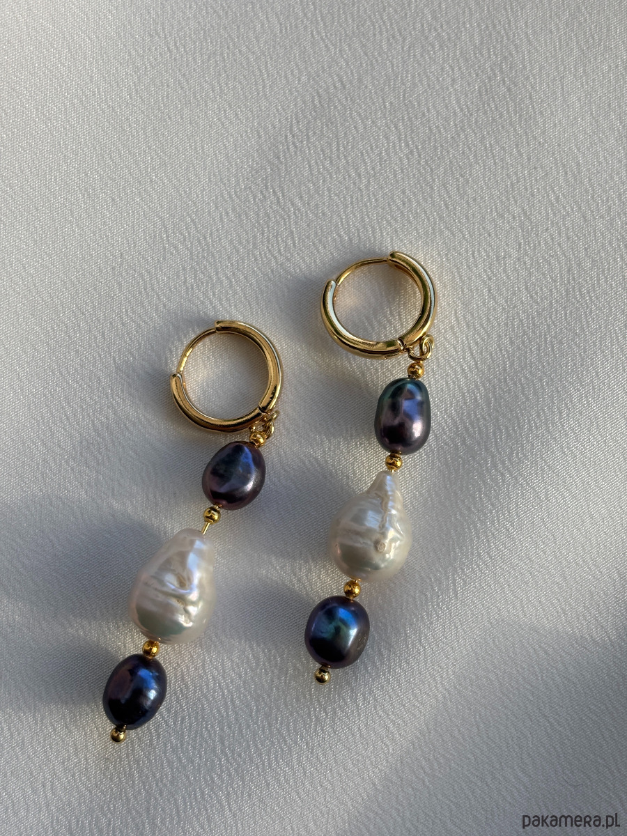 Kolczyki wykonane są z zapięć z mosiądzu pozłacanego złotem ( nie uczulają uszu) z perłami granatowymi i perłami barokowymi. Unikalność pereł cechuje się różnorodnymi kształtami.