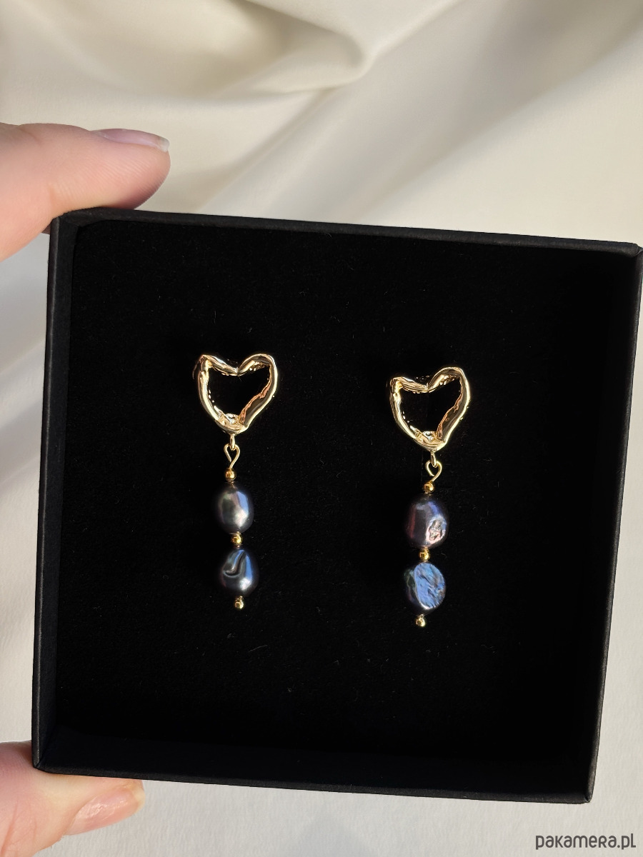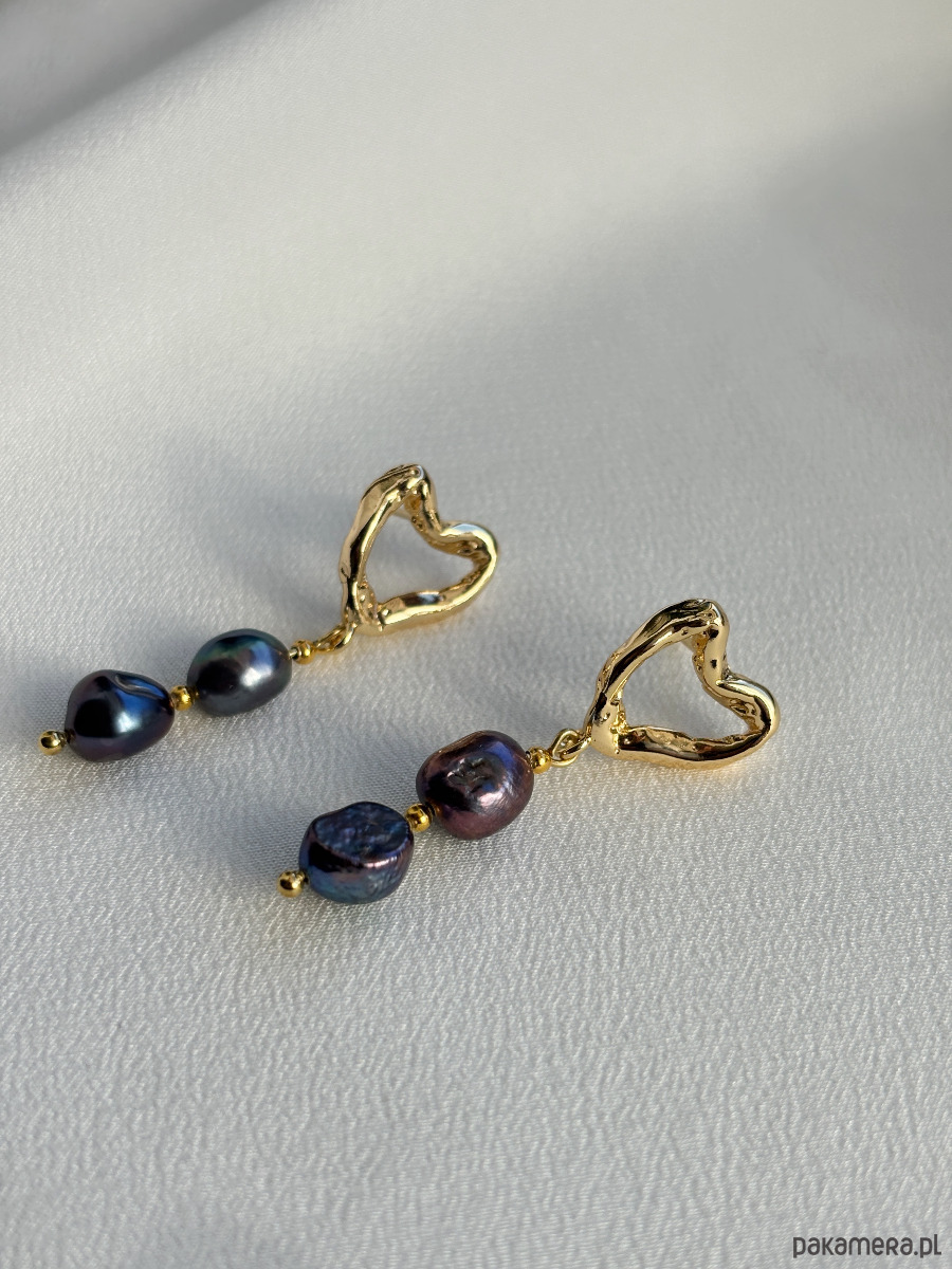 Kolczyki wykonane są z zapięć z mosiądzu pozłacanego złotem ( nie uczulają uszu) z perłami granatowymi. Unikalność pereł cechuje się różnorodnymi kształtami.
