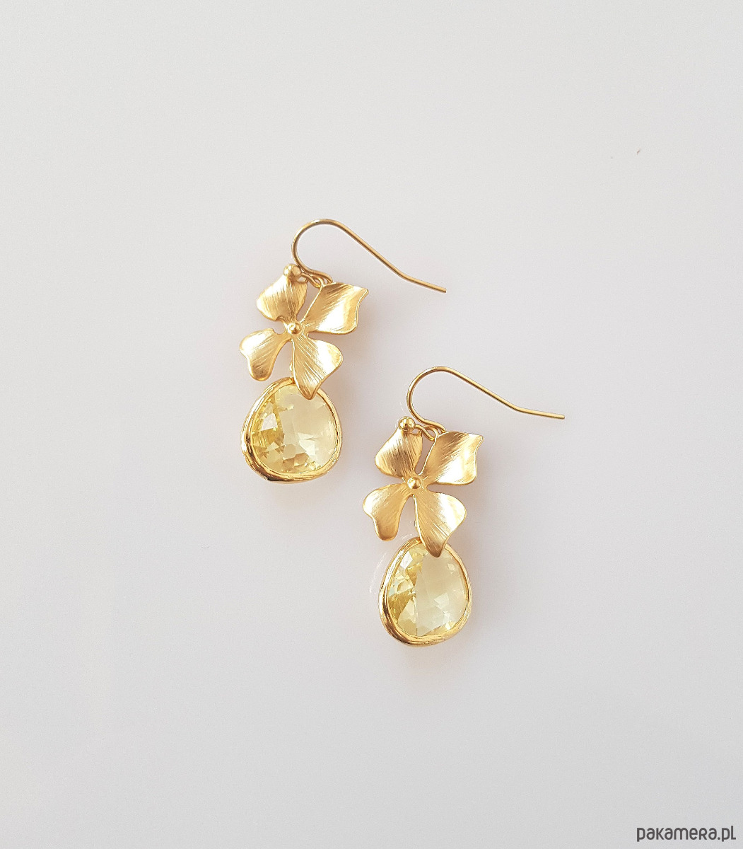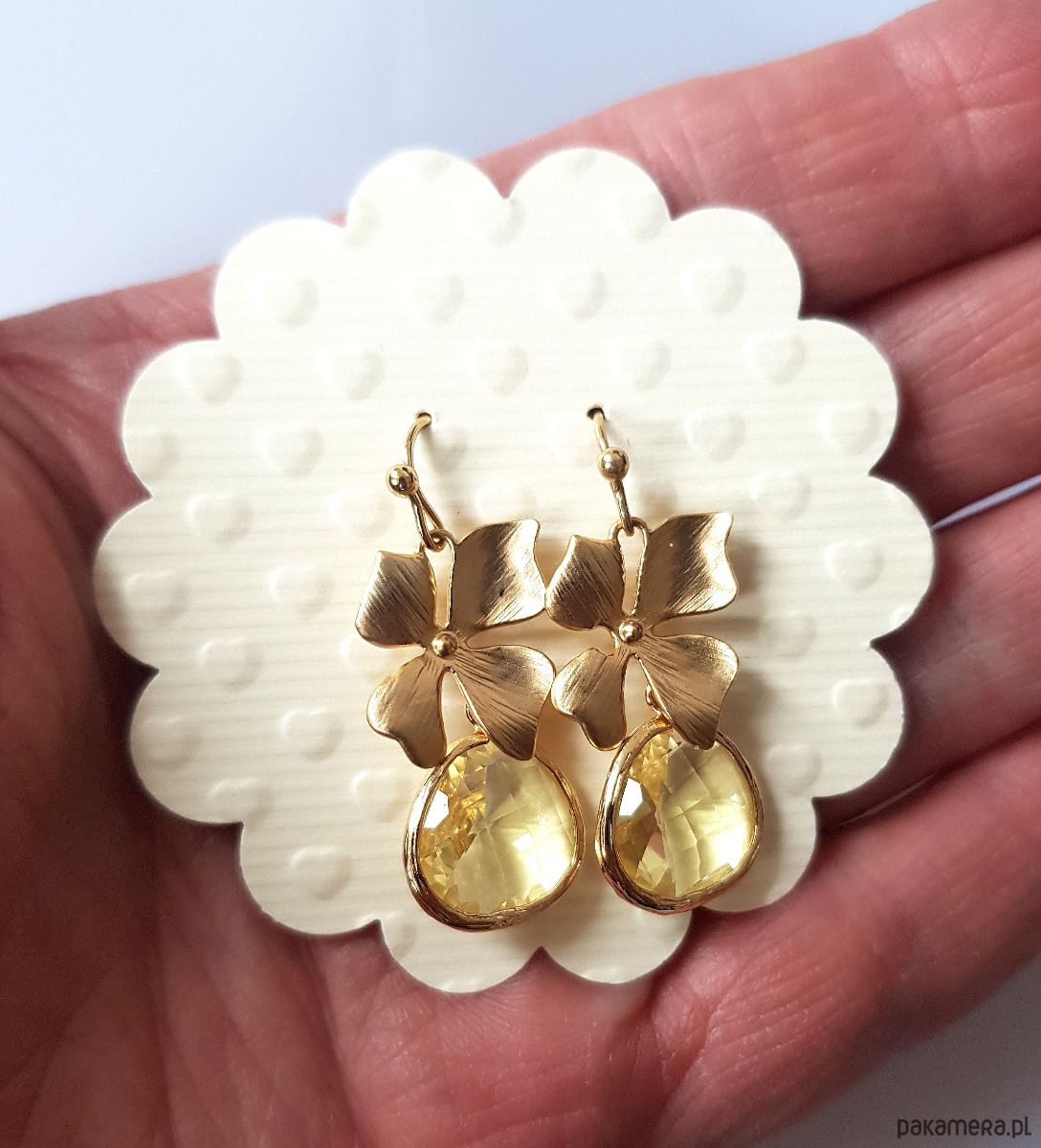 Listki, oprawa kryształów i bigle wykonane z mosiądzu platerowanego złotem.