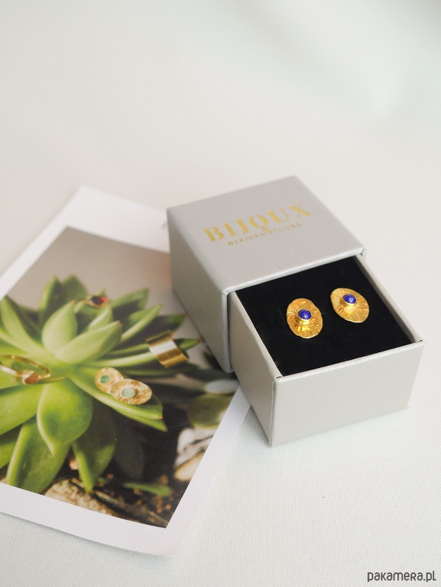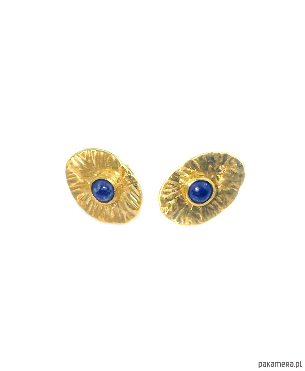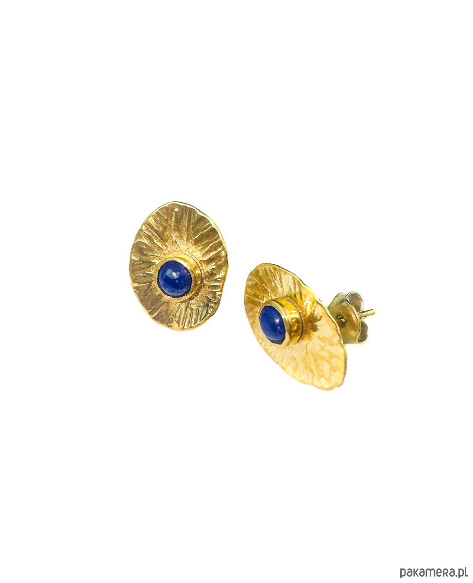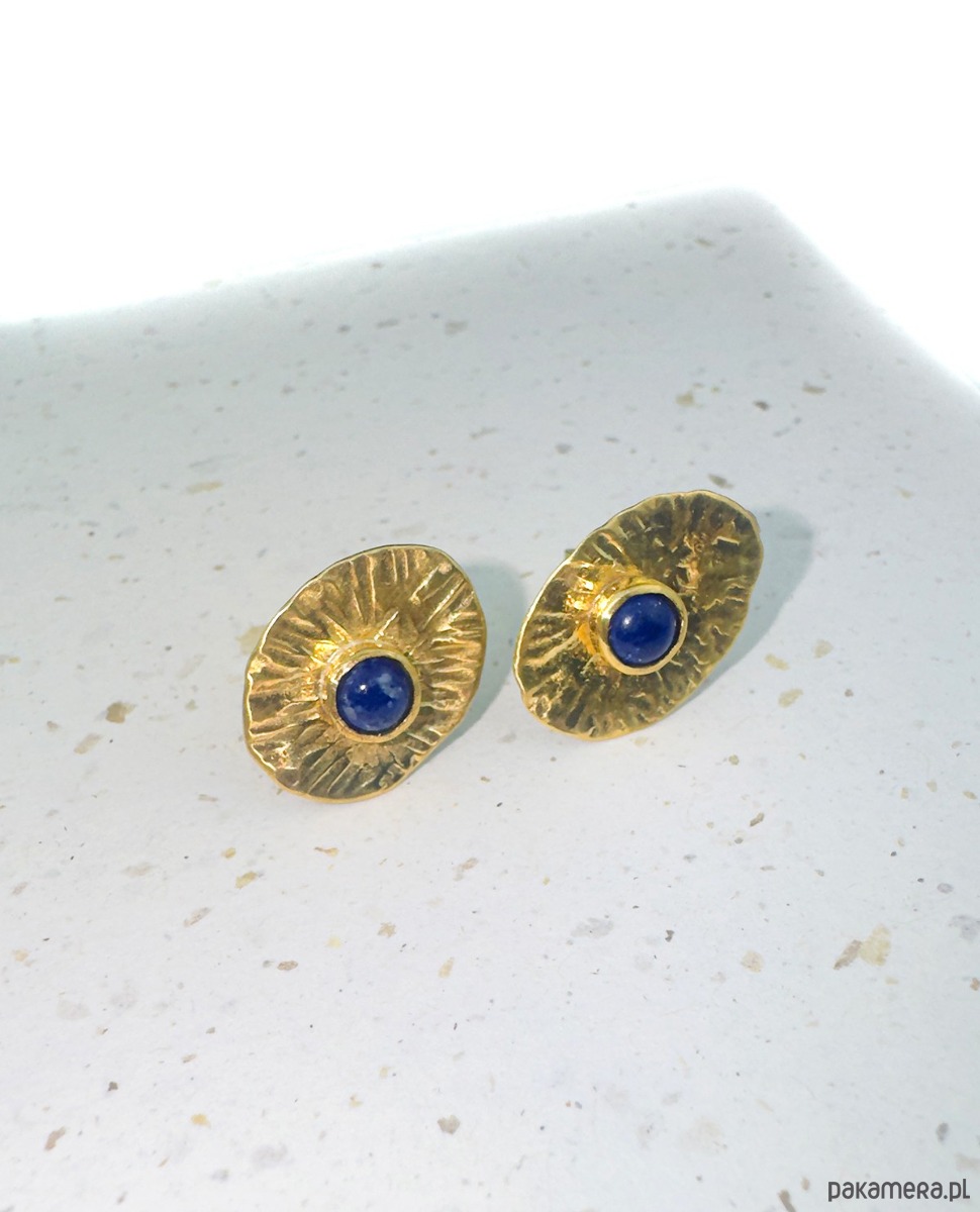 Kolczyki na sztyftach, blaszki o fakturowanej powierzchni. W centralnej części oprawiony lapis lazuli. Wykonane ręcznie ze srebra 925. złocone 24k złotem. Istnieje możliwość zmiany kamieni na inne.