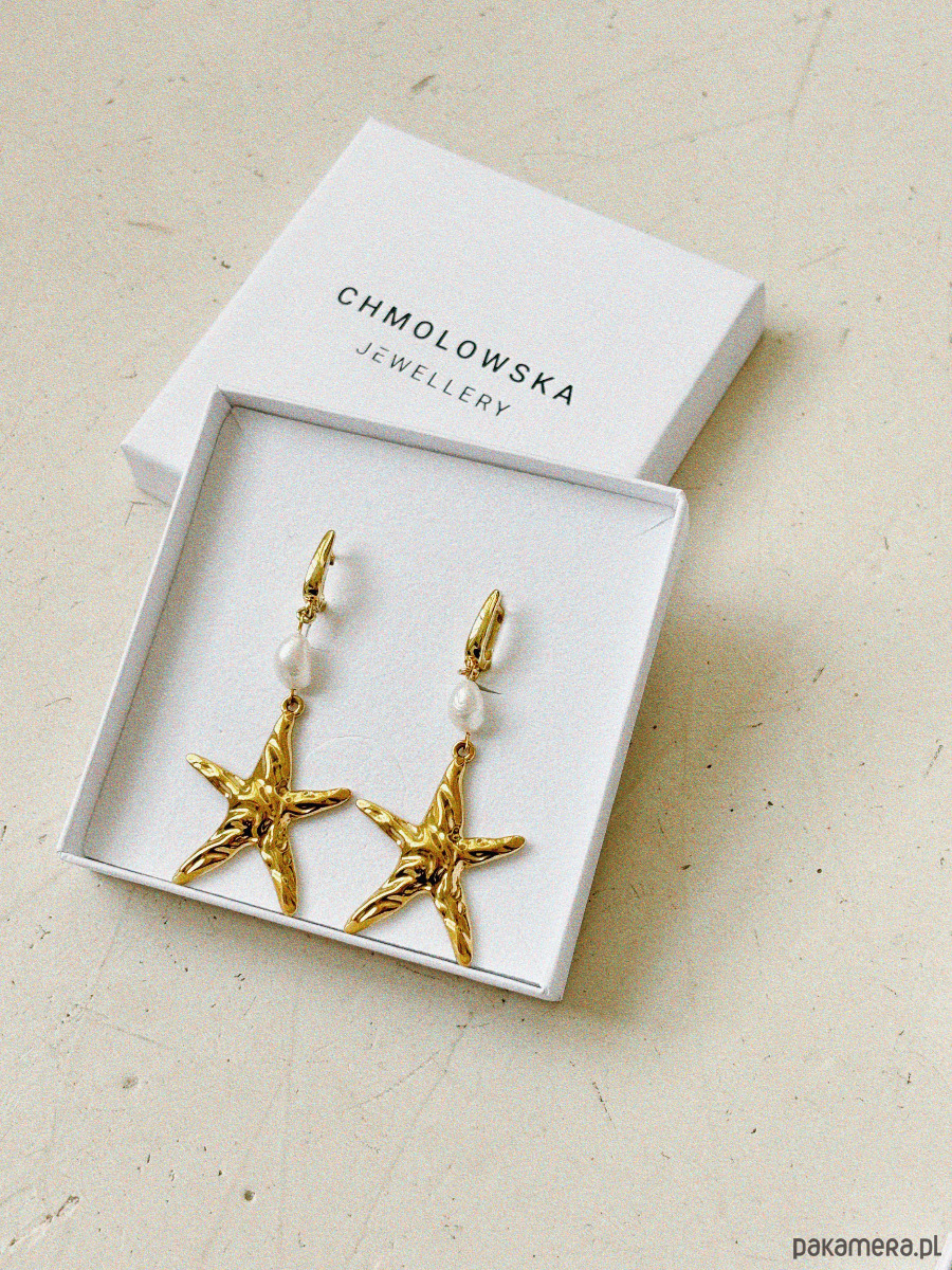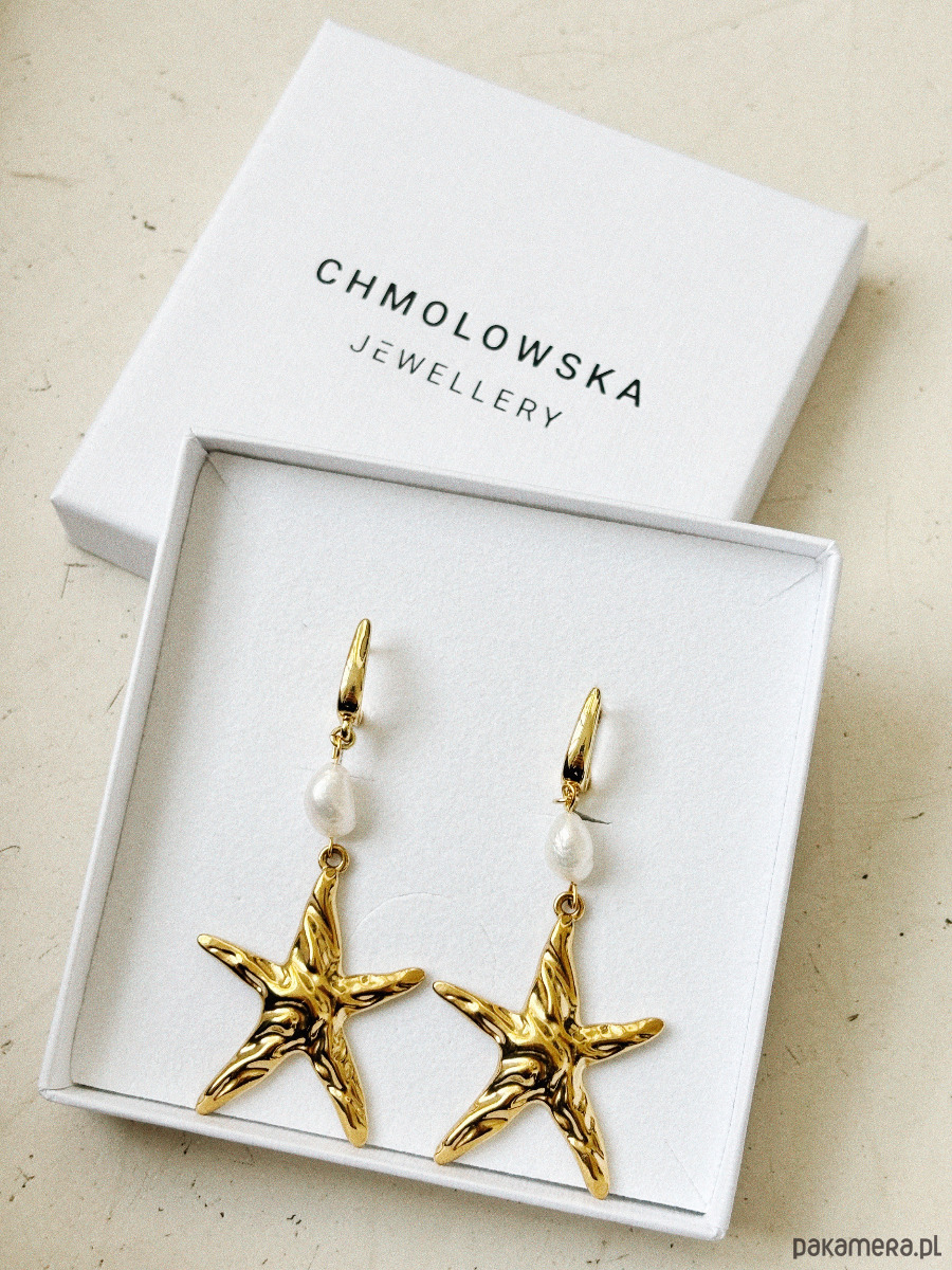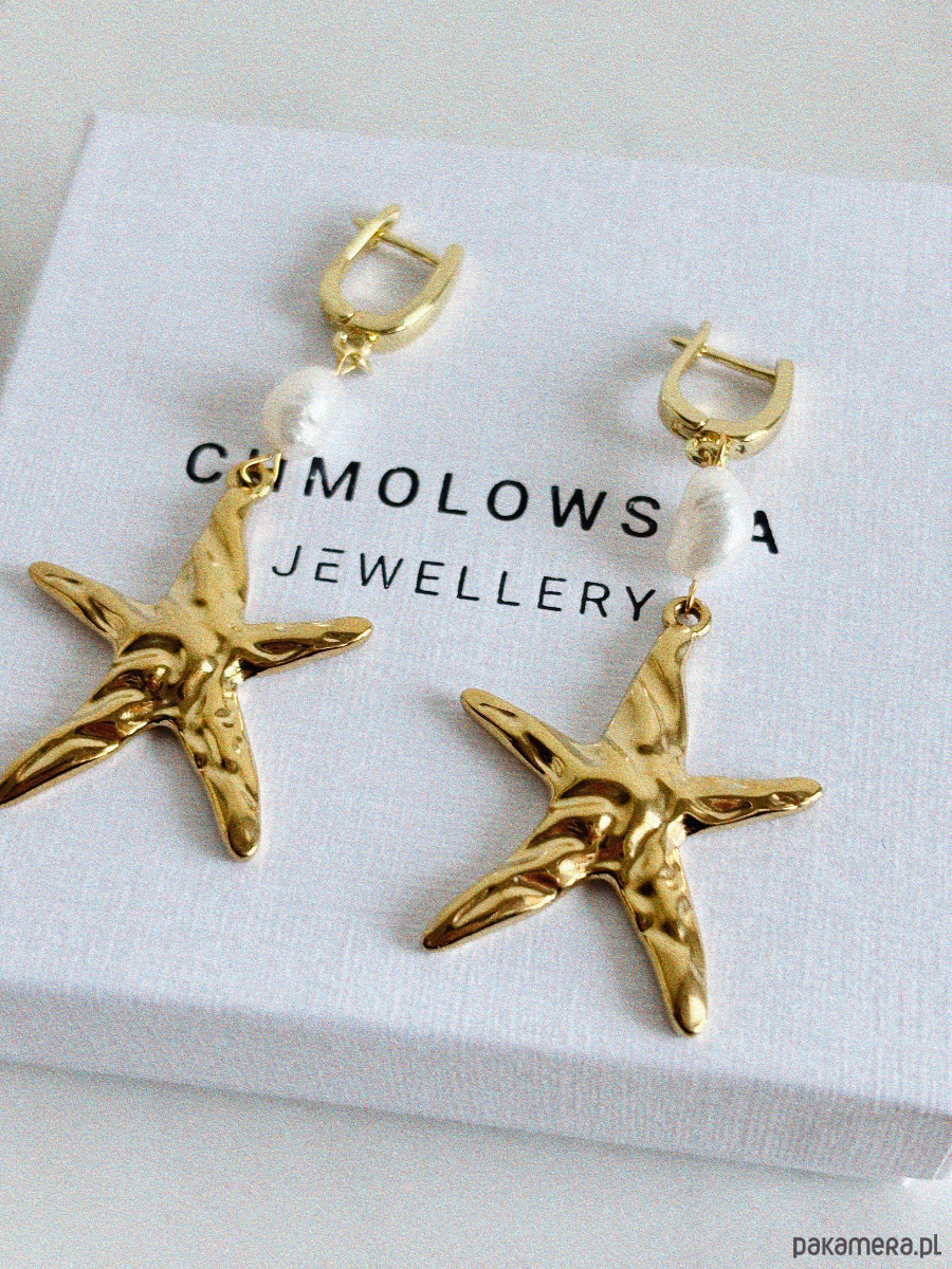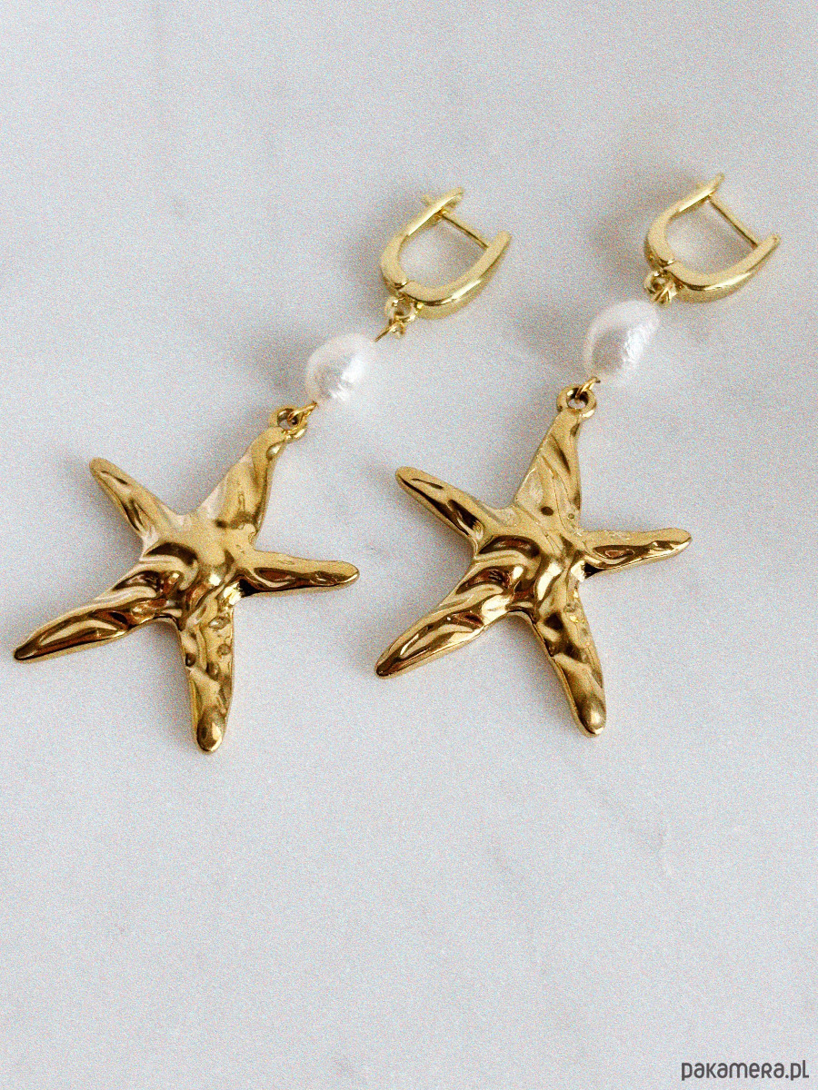 Kolczyki wykonane są na sztyftach z mosiądzu radowanego złotem, pereł naturalnych i rozgwiazdy w formie dużej, efektownej zawieszki.