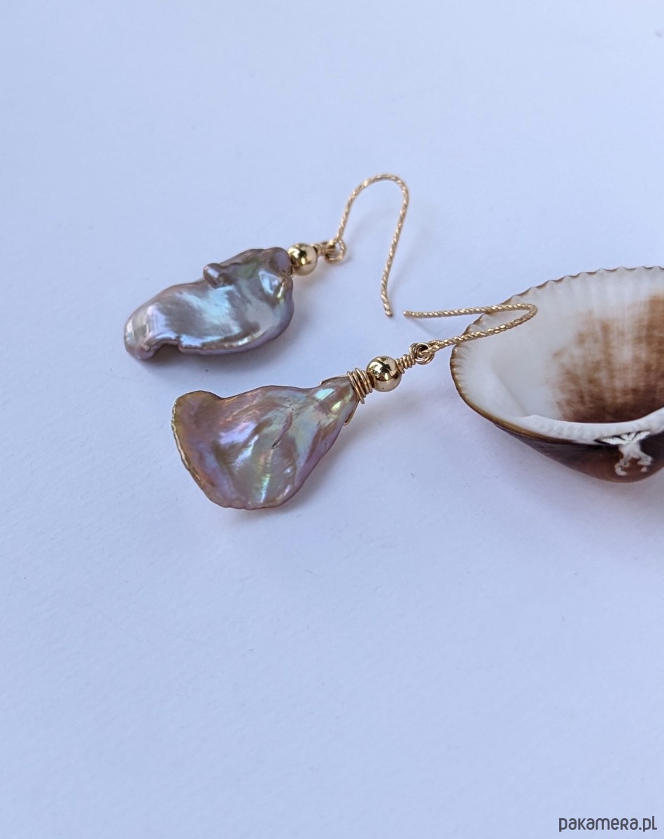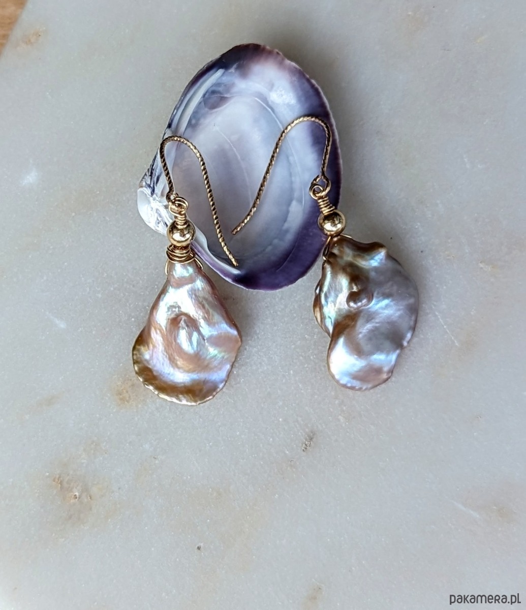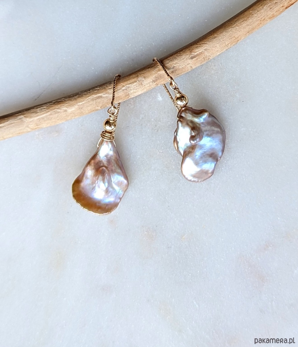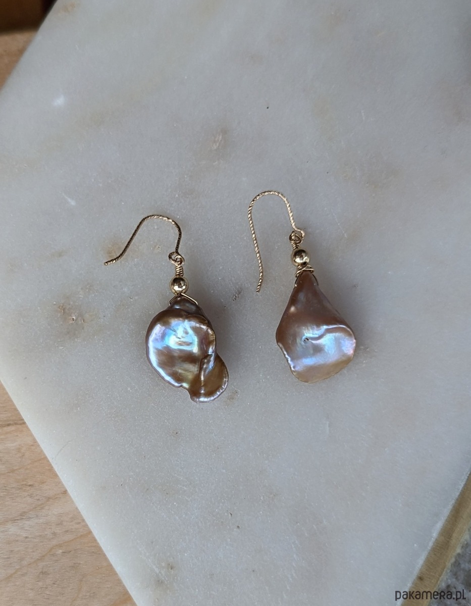 Wyjątkowe kolczyki wykonane z naturalnych pereł KESHI w kolorze cappuccino ze śliwkowym fioletem. Te śliczne płatki powstały w kształcie wybranym przez naturę. Aby uwidocznić ich niezwykły kształt i blask, zostały zawieszone na minimalistycznych, otwartych biglach wykonanych ze złota gold filled. Dodatek złotych kuleczek podkreśla ich delikatność.