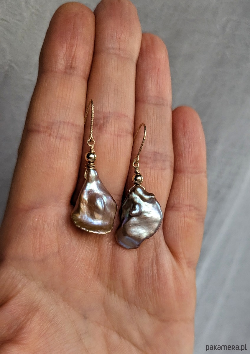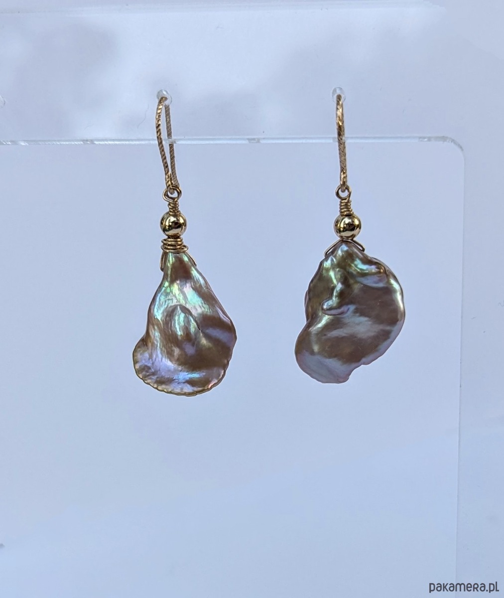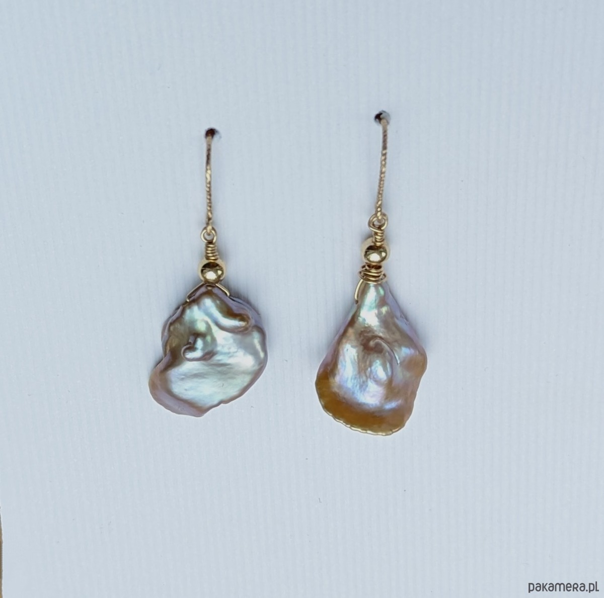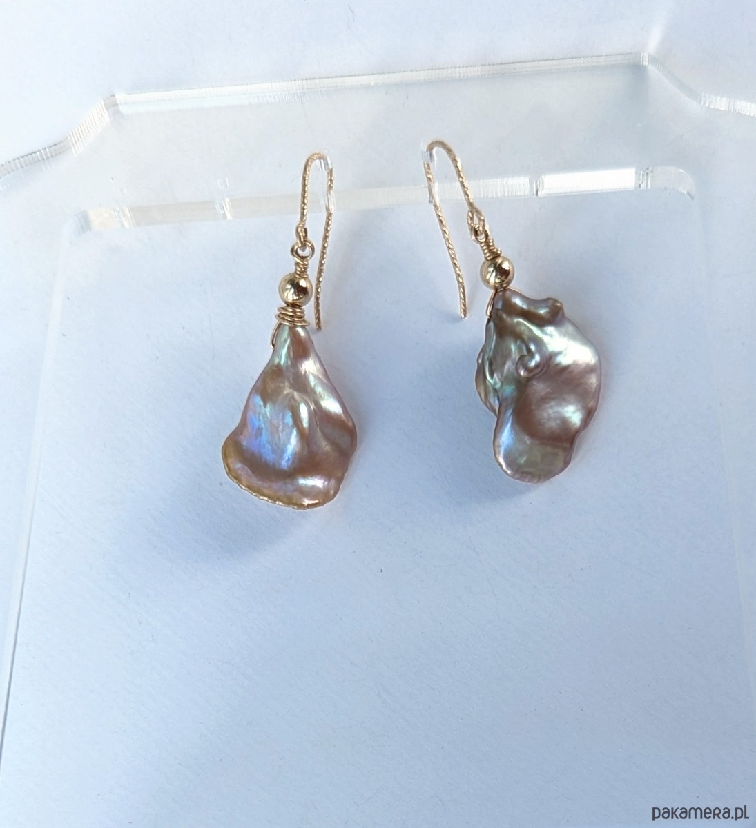 Wyjątkowe kolczyki wykonane z naturalnych pereł KESHI w kolorze cappuccino ze śliwkowym fioletem. Te śliczne płatki powstały w kształcie wybranym przez naturę. Aby uwidocznić ich niezwykły kształt i blask, zostały zawieszone na minimalistycznych, otwartych biglach wykonanych ze złota gold filled. Dodatek złotych kuleczek podkreśla ich delikatność.