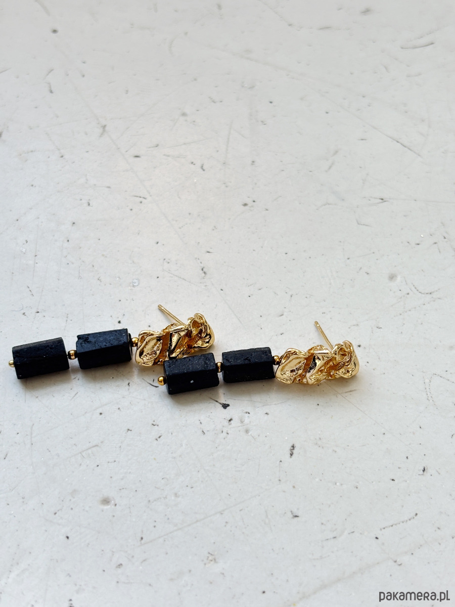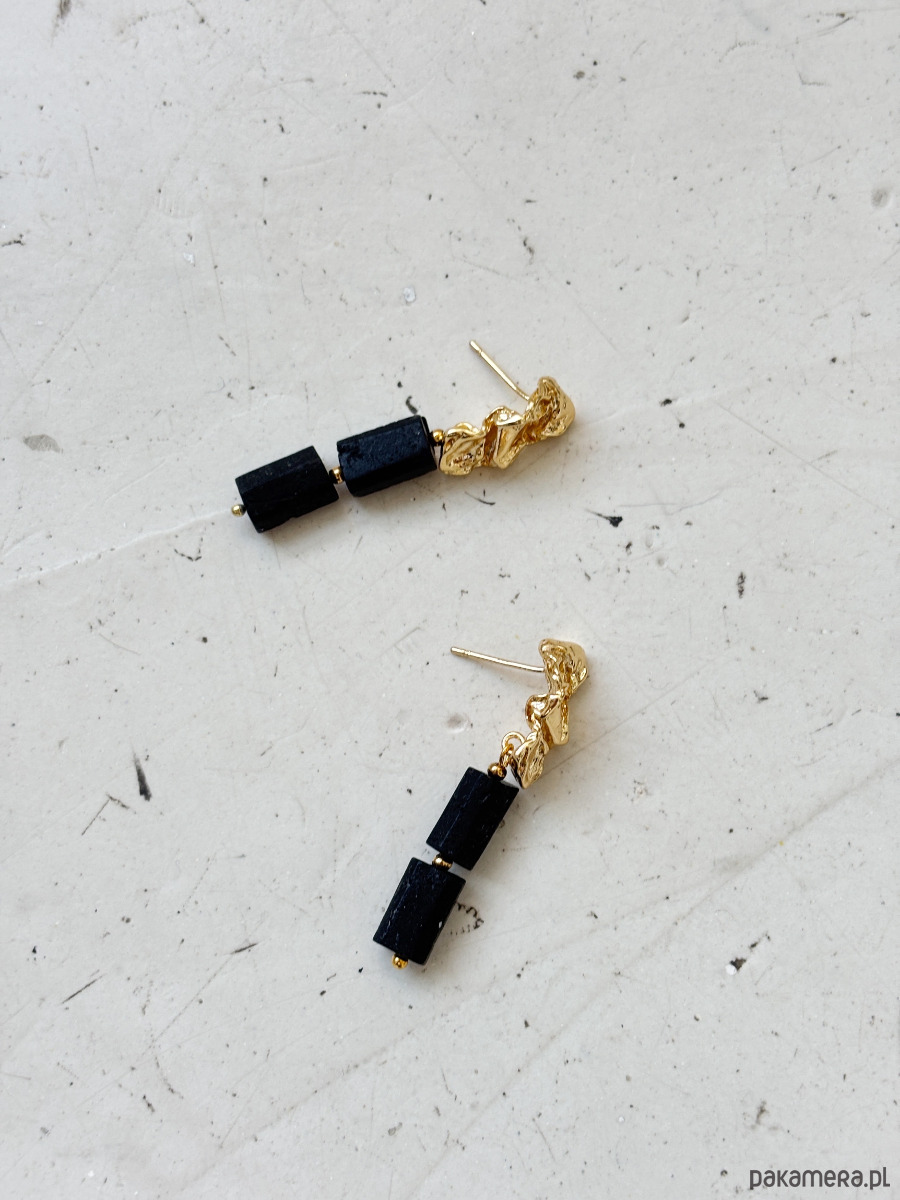 Kolczyki wykonane są z zapięć z mosiądzu pozłacanego 18k złotem oraz turmalinu czarnego surowego.
