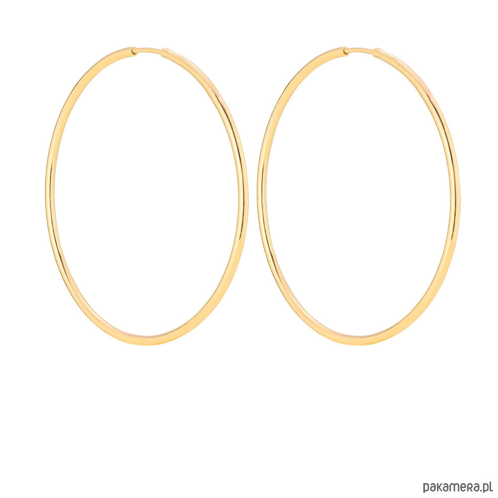 Duże, okrągłe, proste złote kolczyki. Całość wykonana ze srebra 925 powlekanego 24 karatowym żółtym złotem.
