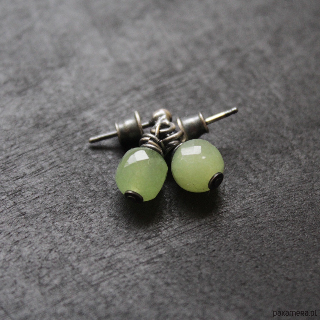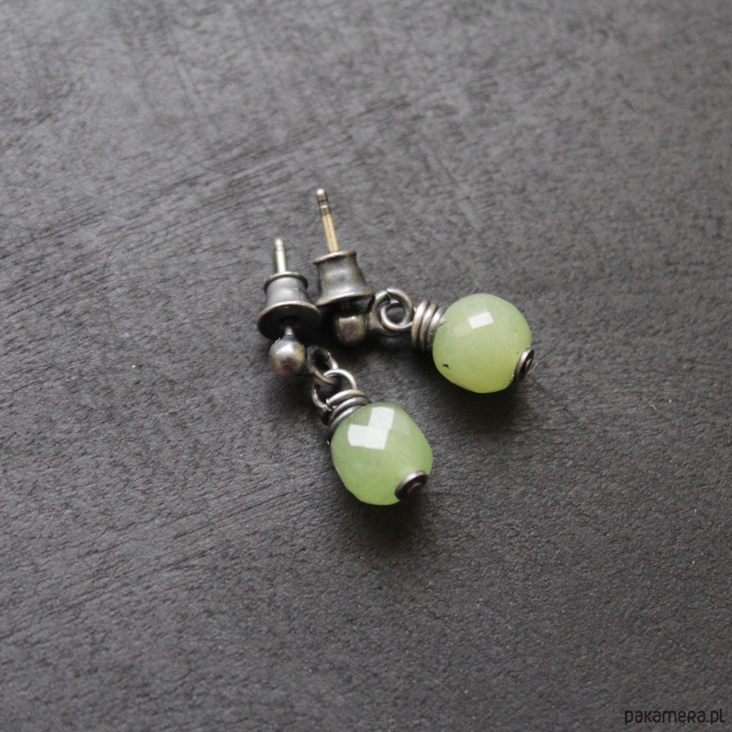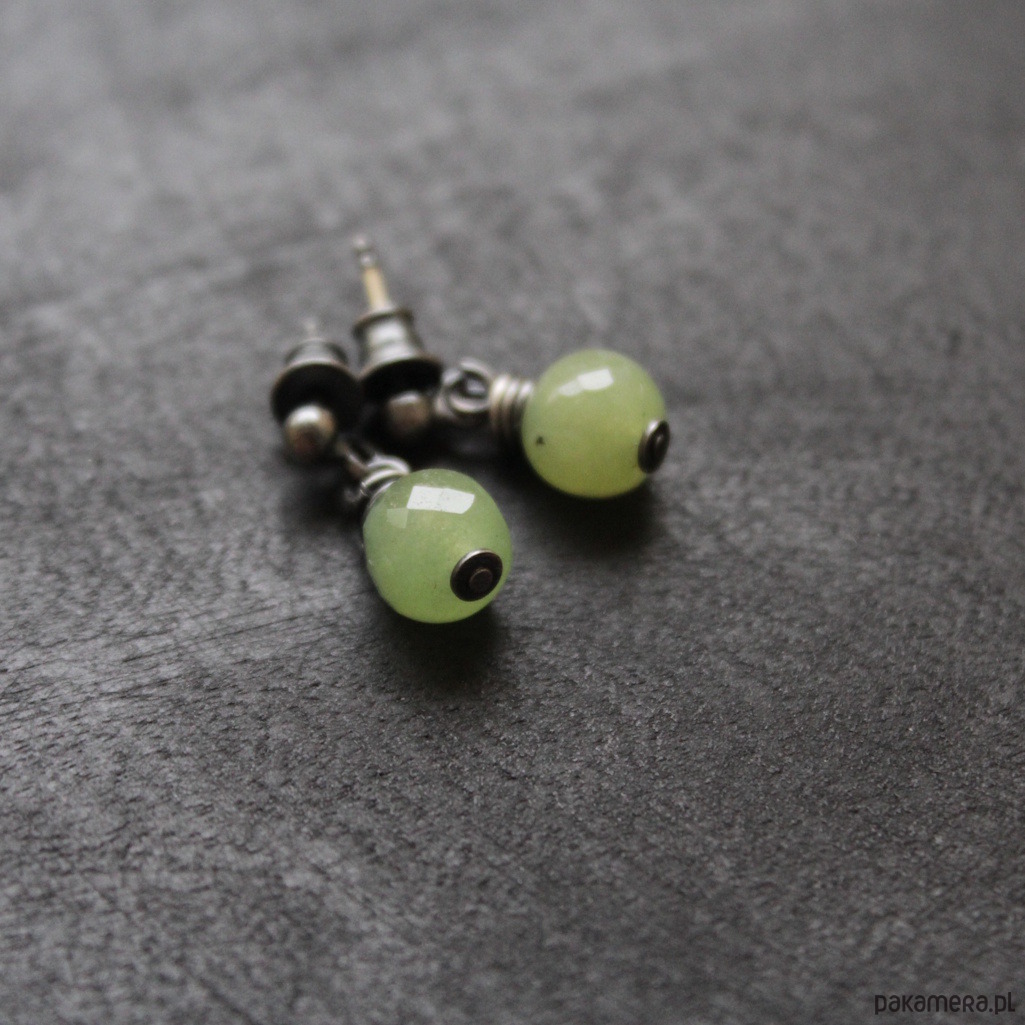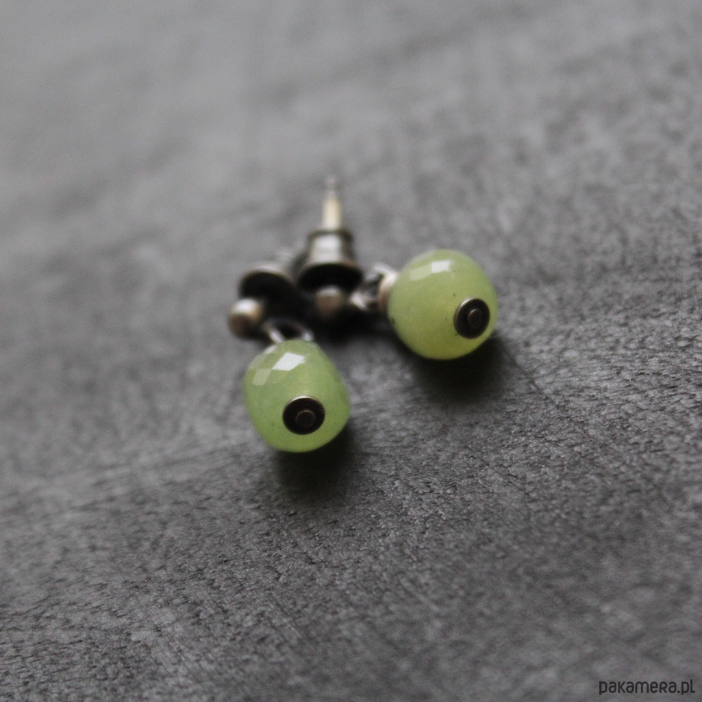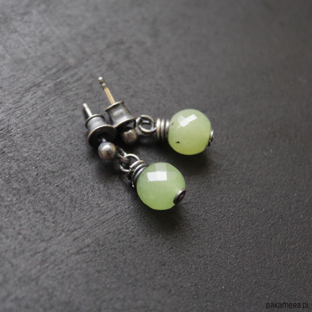Minimalistyczne kolczyki wykonane zostały z oksydowanego srebra 925 oraz przepięknych kosteczek prehnitu wielkości 0,7 cm.