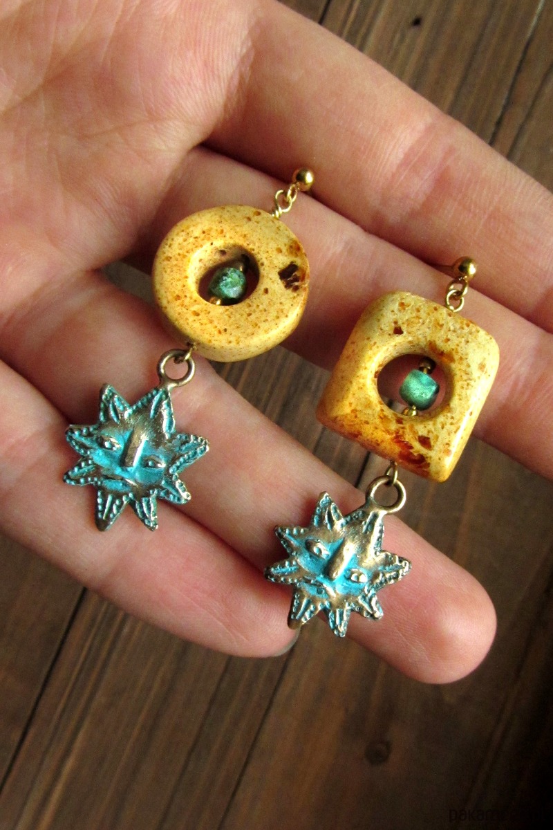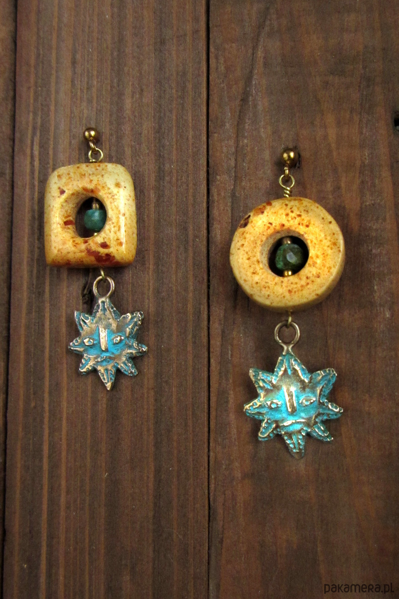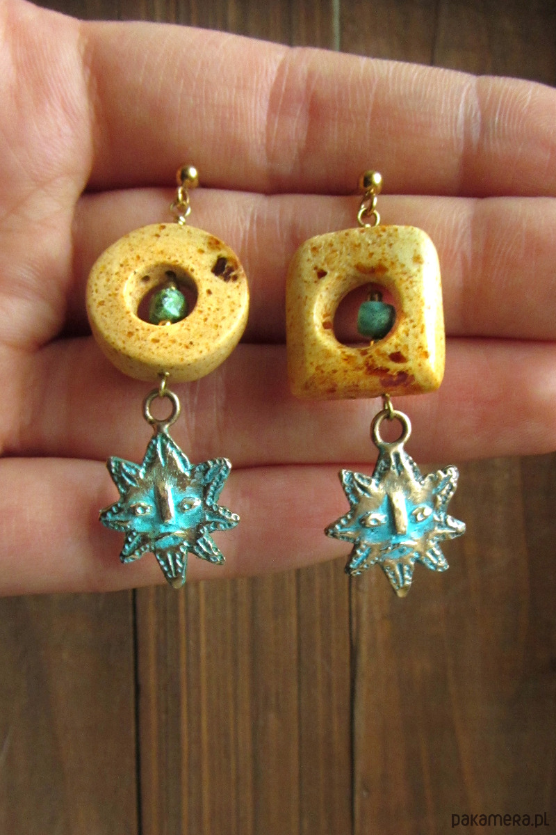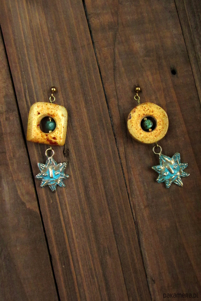 Niepowtarzalne i lekko asymetryczne kolczyki z ręcznie rzeźbionymi słońcami z brązu oraz bursztynami. Bursztyny pochodzą z Gdańskiej pracowni bursztynniczej i zostały zebrane na Polskiej plaży, a następnie obrobione ze starannością. W ich wnętrzu zamontowane są drobne turkusy. Dzięki bursztynom kolczyki są okazałe, lecz niezwykle lekkie.
