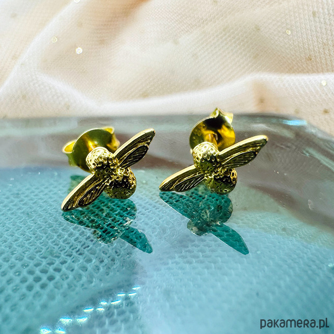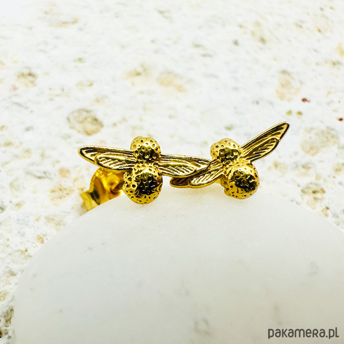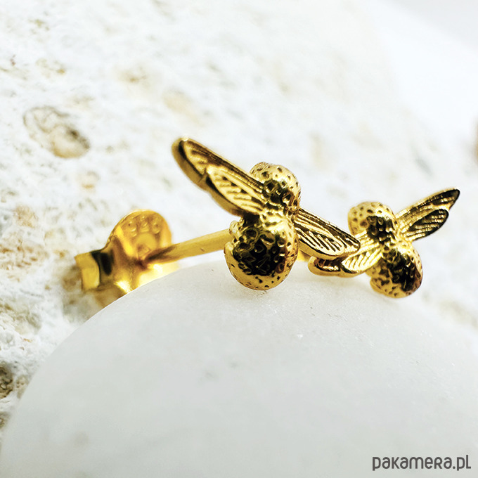Małe delikatne kolczyki sztyfty z efektownymi pszczółkami. Idealne na każdą porę roku. Wykonane ze srebra 925 i pozłacane 24 k złotem..