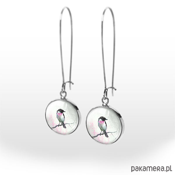 Grafika ukryta w prostych, eterycznych kolczykach, pod osłoną przeźroczystego półokrągłego szkiełka.