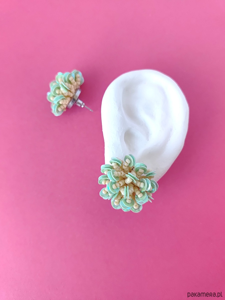 Kolczyki typu "puszyste pomponiki" w odcianiach mięty i beżu to idealne połączenie lekkości i wyrazistości. Wykonane ręcznie z drobnych koralików i połyskujących cekinów, przyciągają uwagę i dodają stylizacji niepowtarzalnego uroku.