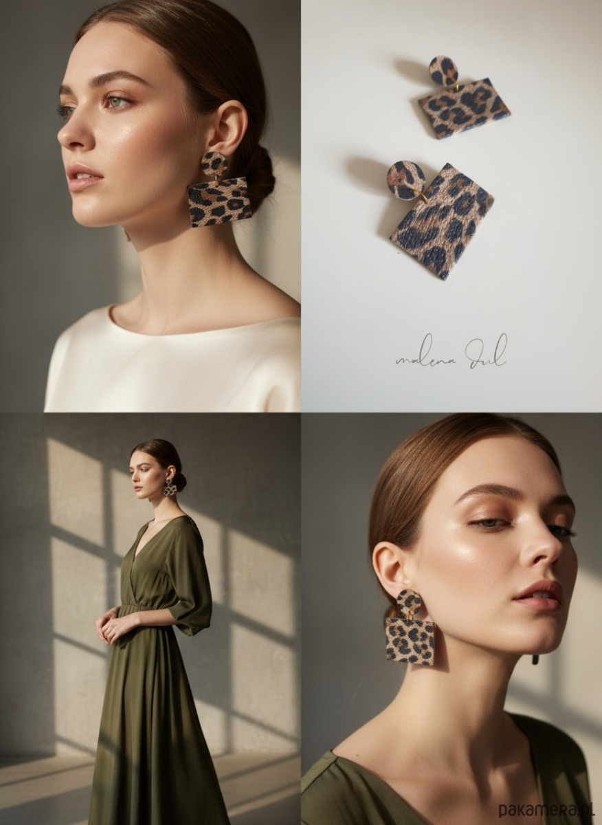 Kolczyki RAW, duże skóra naturalna prostokąty beżowe szare panterka