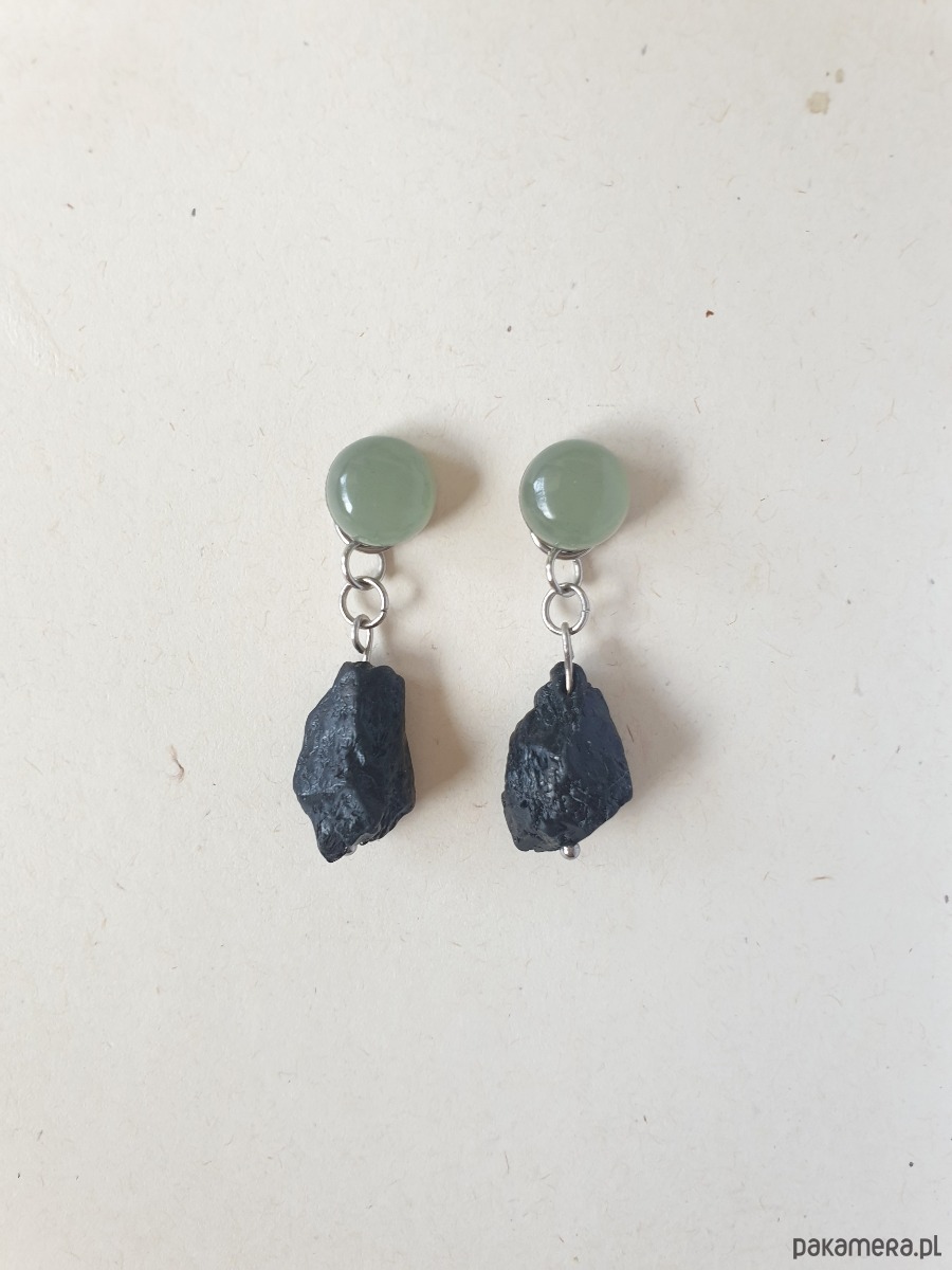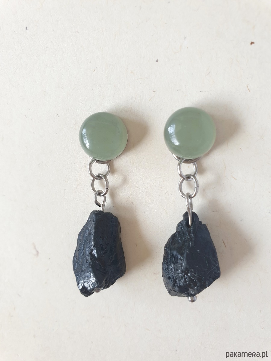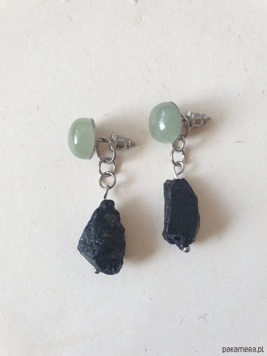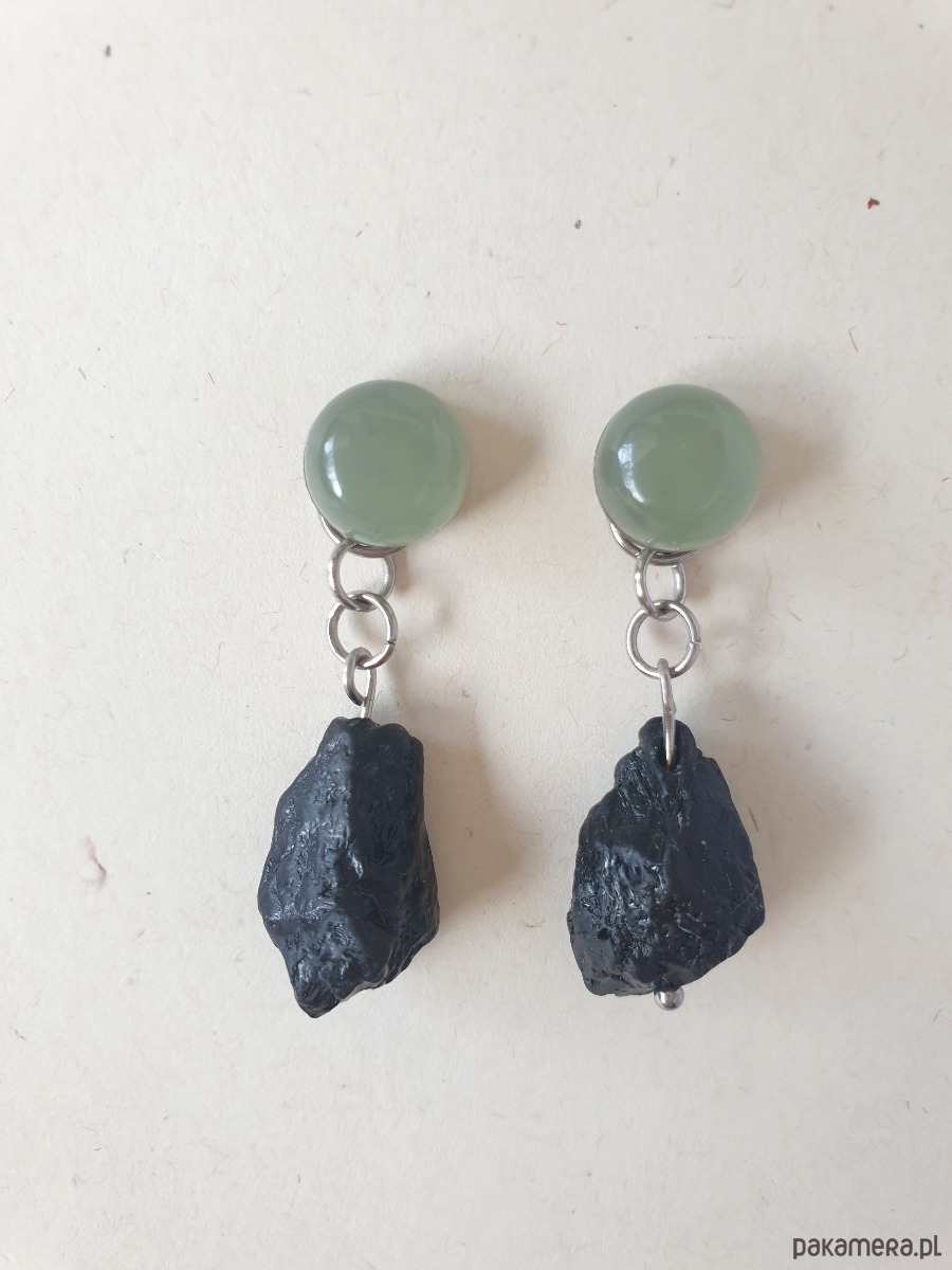 Kolczyki sztyfty, wiszące z kolekcji RAW, idealne na wieczorne wyjście ale też na co dzień. Wykonane ze stali szlachetnej (hipoalergicznej) z kamieniami naturalnymi: jadeit naturalny zielony z Birmy, surowy czarny turmalin. Kolczyki można nosić też jako same sztyfty kółka bez wiszącego elementu, bo jest osobno. Unikatowe egzemplarze ze względu na oryginalny kształt kamieni. Kolczyki są bardzo lekkie.
